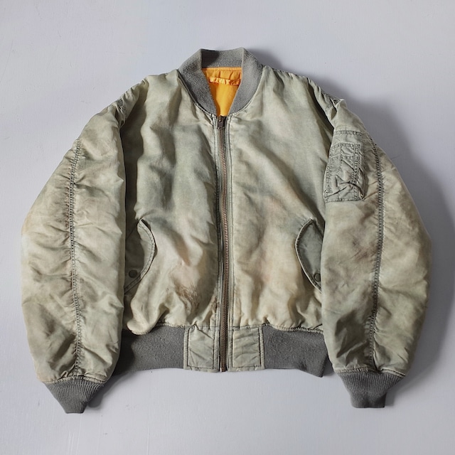 COLOR FADE KHAKI × RESCUE ORANGE MODEL 181cm 63kg SIZE 不明、肩幅 55cm、身幅 69cm、着丈 63.5cm、袖丈 64.5cm ※サイズに関しましては手採寸のため、多少の誤差がある場合がございます。 素晴らしい経年変化の民間品MA-1。米軍実物を踏襲したリバーシブルデザインでMA-1には欠かせないシガレットポケットを装備した逸品。カラカラに乾いているフェードカラーの表情がたまりません。 また、着こなし易いボックスシルエットもポイントで、ロングシーズンで活躍する優秀な一着かと。是非。 SURFACE 表地:ナイロン 100% 裏地:ナイロン 100% 中綿:ポリエステル 100% ニット:アクリル 100% CONDITION B(使用感、所々汚れ、裏地側糸のほつれ) S - 新品同様、又は試着程度のもの。 A - 傷、シミ等特に見当たらず、使用感もさほどない状態の良いもの。 B - 多少の使用感、気にならない程度の傷、汚れなどが若干見られるもの。 C - 使用感、傷、汚れなどがあるが着用に問題の無い程度のもの。 ————————————————————————————— “ ATTENTION " ・当店の取り扱うお洋服は全て古着ですのでダメージや汚れ、特有の匂いにがある場合がございます。ご理解のある方のみご購入をお願い致します。 ・商品説明に記載のないダメージや汚れが出てくる可能性もあります。 こちらも古着であることをご理解の上ご購入ください。 ・写真と実物の色味、サイズ感、素材感、状態が想像と異なる場合がございますが通販という性質上ご理解下さい。 ・銀行振込、コンビニ決済、Pay-easy、後払い決済の際にかかる手数料は別途ご負担いただきます。 ・商品に初期不良がある場合を除き、お客様都合による返品には応じかねますので予めご了承ください。 ・送料として全国一律 1,000円(税込)を頂いております。なお、配送方法については、宅急便以外にもレターパック等にてお送りする場合が御座いますが、発生した送料の差額は返金致しかねますのでご了承ください。