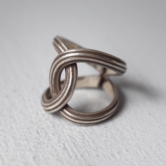 SIZE 6号 ※サイズに関しましては手採寸のため、多少の誤差がある場合がございます。 2本のシルバーにツイストを加えつつ、編み込まれている ハンドメイドリング。大胆でありつつも拘りが垣間見える ディテールがポイント。 SURFACE GENUINE SILVER CONDITION S S - 新品同様、又は試着程度のもの。 A - 傷、シミ等特に見当たらず、使用感もさほどない状態の良いもの。 B - 多少の使用感、気にならない程度の傷、汚れなどが若干見られるもの。 C - 使用感、傷、汚れなどがあるが着用に問題の無い程度のもの。 ————————————————————————————— “ ATTENTION " ・当店の取り扱うお洋服は全て古着ですのでダメージや汚れ、特有の匂いにがある場合がございます。ご理解のある方のみご購入をお願い致します。 ・商品説明に記載のないダメージや汚れが出てくる可能性もあります。 こちらも古着であることをご理解の上ご購入ください。 ・写真と実物の色味、サイズ感、素材感、状態が想像と異なる場合がございますが通販という性質上ご理解下さい。 ・銀行振込、コンビニ決済、Pay-easy、後払い決済の際にかかる手数料は別途ご負担いただきます。 ・商品に初期不良がある場合を除き、お客様都合による返品には応じかねますので予めご了承ください。 ・送料として全国一律 1,000円(税込)を頂いております。なお、配送方法については、宅急便以外にもレターパック等にてお送りする場合が御座いますが、発生した送料の差額は返金致しかねますのでご了承ください。