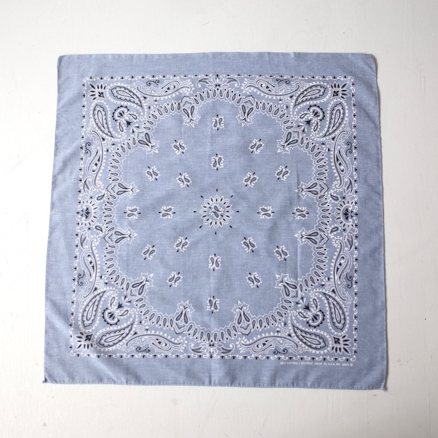 COLOR ICE BLUE SIZE 54.5cm×53.5cm ※サイズに関しましては手採寸のため、多少の誤差がある場合がございます。 鮮やかな赤やネイビーの個体が多いバンダナの中でもやや 珍しいカラーリングをしたアイテム。淡いグレーがかった 落ち着いた雰囲気を感じるピース。 SURFACE 50% COTTON, 50% POLYESTER CONDITION A S - 新品同様、又は試着程度のもの。 A - 傷、シミ等特に見当たらず、使用感もさほどない状態の良いもの。 B - 多少の使用感、気にならない程度の傷、汚れなどが若干見られるもの。 C - 使用感、傷、汚れなどがあるが着用に問題の無い程度のもの。 ————————————————————————————— “ ATTENTION " ・当店の取り扱うお洋服は全て古着ですのでダメージや汚れ、特有の匂いにがある場合がございます。ご理解のある方のみご購入をお願い致します。 ・商品説明に記載のないダメージや汚れが出てくる可能性もあります。 こちらも古着であることをご理解の上ご購入ください。 ・写真と実物の色味、サイズ感、素材感、状態が想像と異なる場合がございますが通販という性質上ご理解下さい。 ・銀行振込、コンビニ決済、Pay-easy、後払い決済の際にかかる手数料は別途ご負担いただきます。 ・商品に初期不良がある場合を除き、お客様都合による返品には応じかねますので予めご了承ください。 ・送料として全国一律 1,000円(税込)を頂いております。なお、配送方法については、宅急便以外にもレターパック等にてお送りする場合が御座いますが、発生した送料の差額は返金致しかねますのでご了承ください。