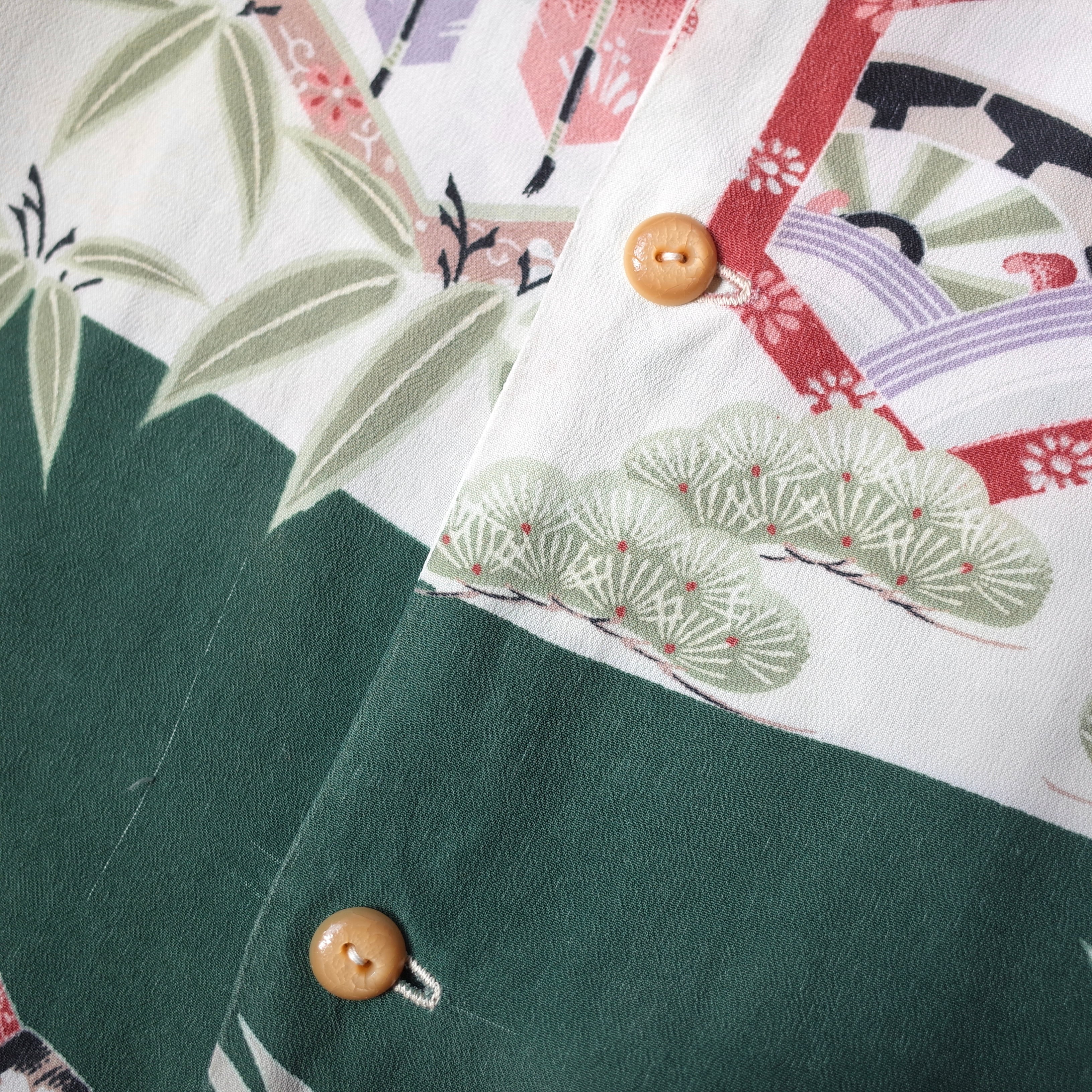 生地には和柄のヴィンテージアロハにしばしば用いられる『レーヨンちりめん』生地を使用。表面に凸凹ある素材で清涼感があり、絹に似た光沢感と独特な肌触りが印象的です。表記サイズSでありながらも、実際はゆったりした着用感で身幅着丈のバランスも整っています。これからの暑い季節に活躍するヴィンテージピース。コレクションに