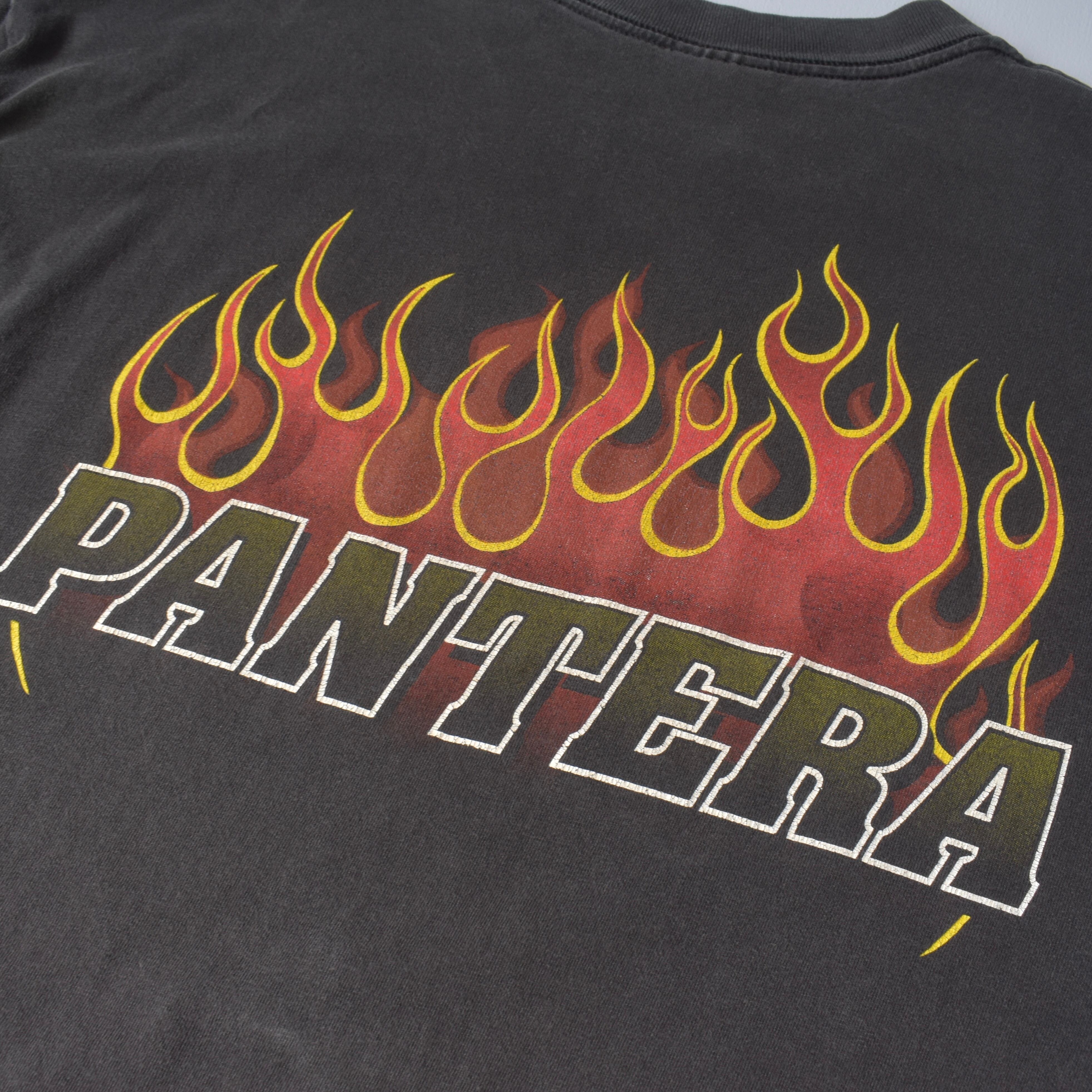 1999年コピーライトの"PANTERA"OFFICIAL Tシャツフロントにはコミック調のメンバーたちが炎に包まれたデザインで、バックにはフロントと同じく炎のデザインとともにバンド名が配置されたグラフィックとなっており、"PANTERA"ならではの爆発的なエネルギーとユニークな世界観がヴィジュアルから伝わってくる一着です。