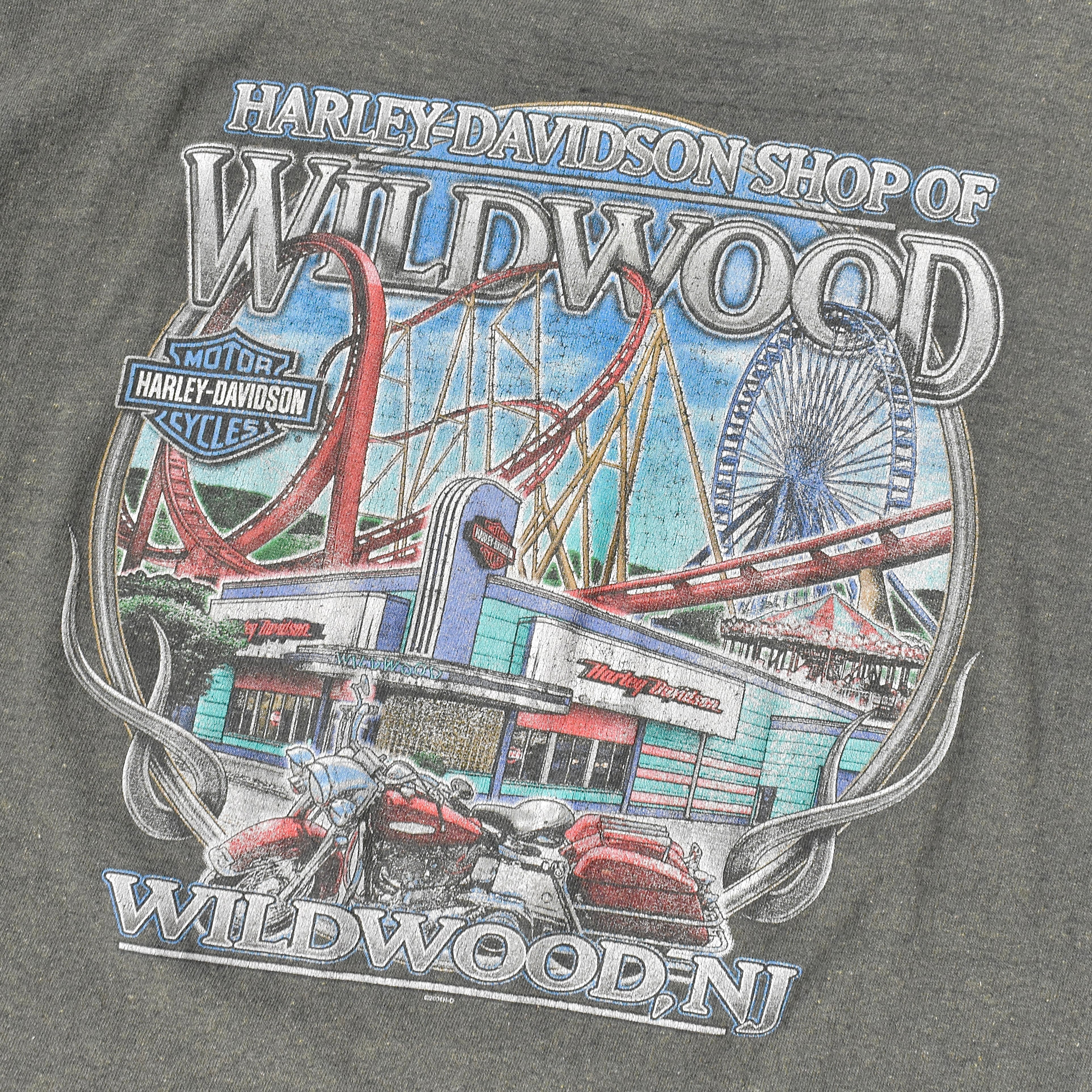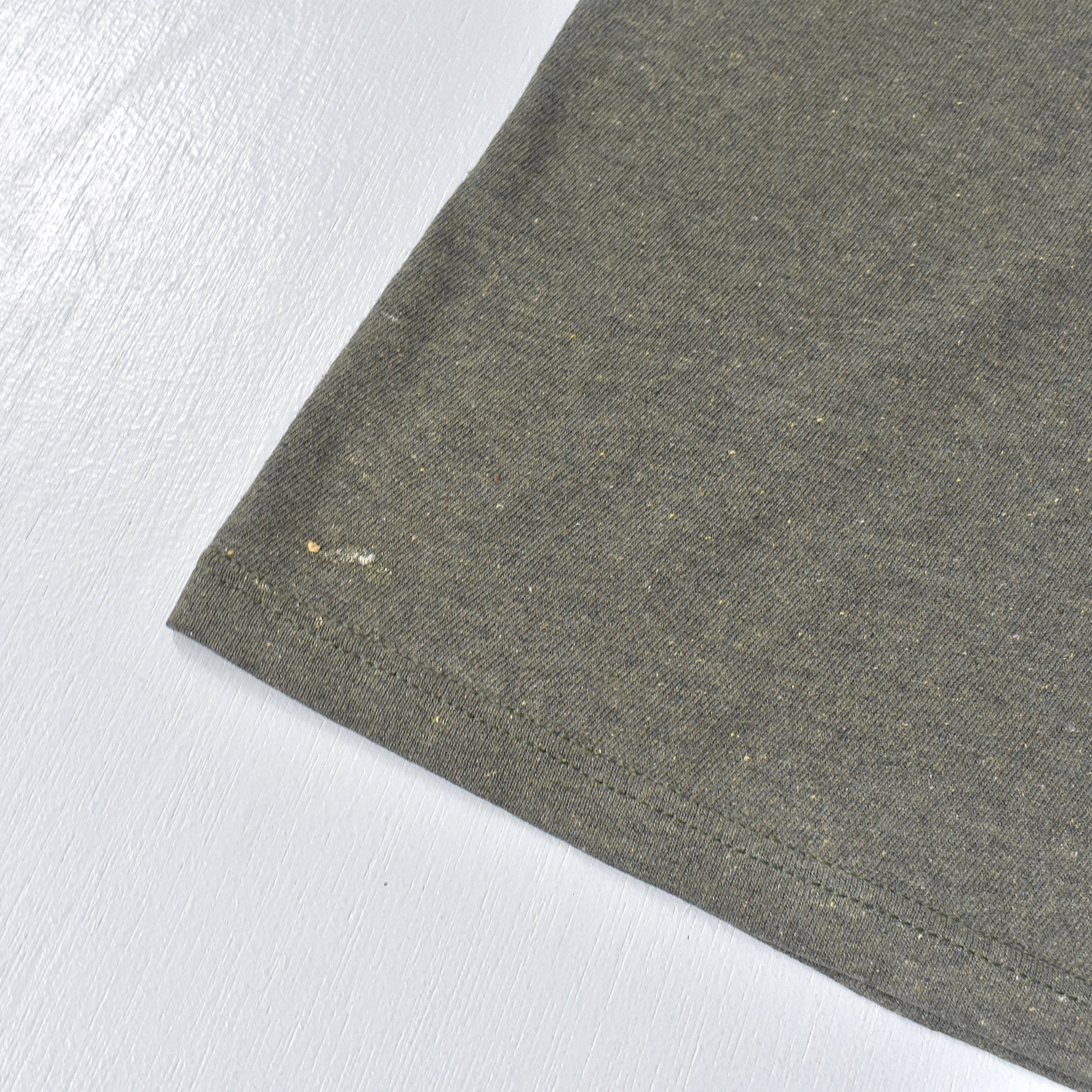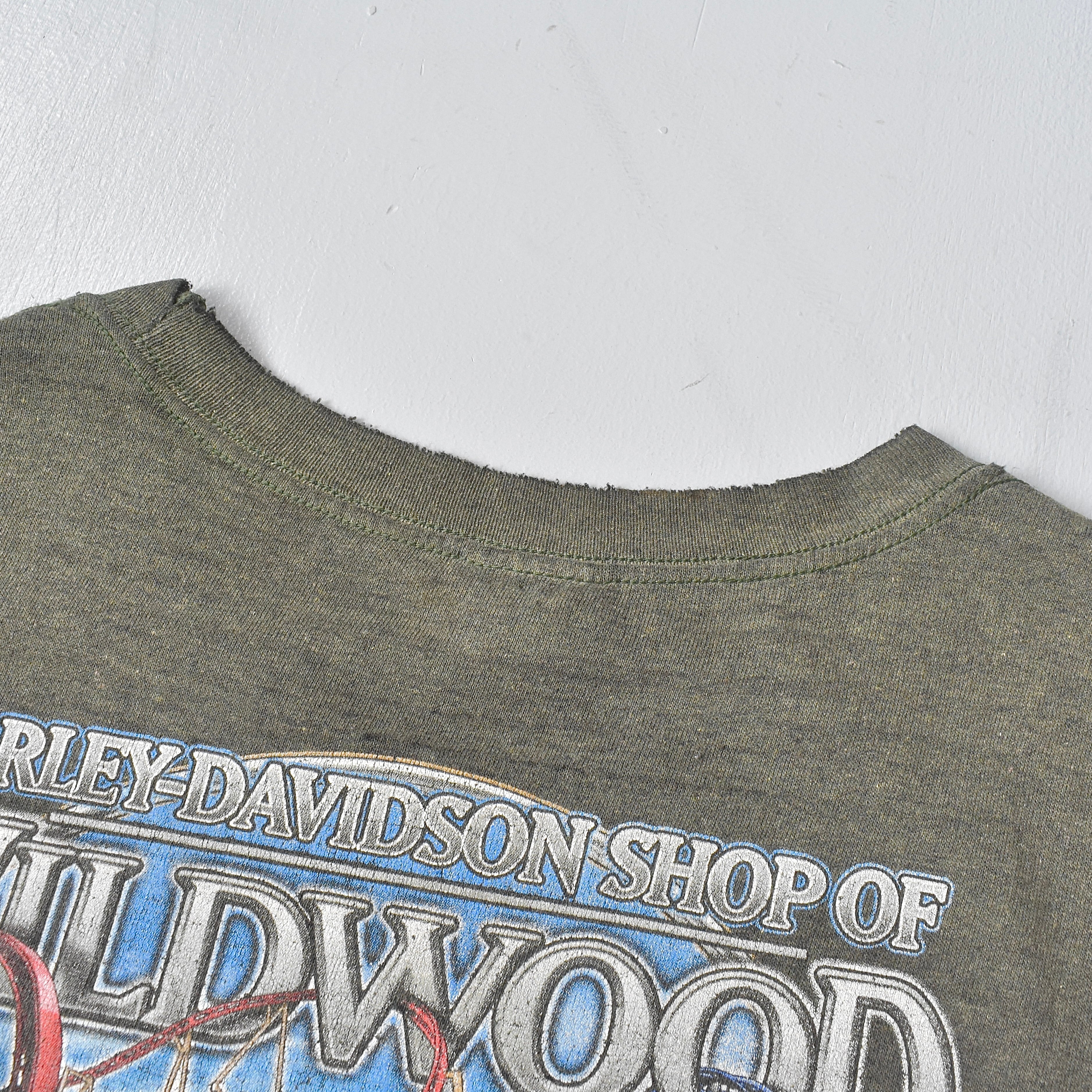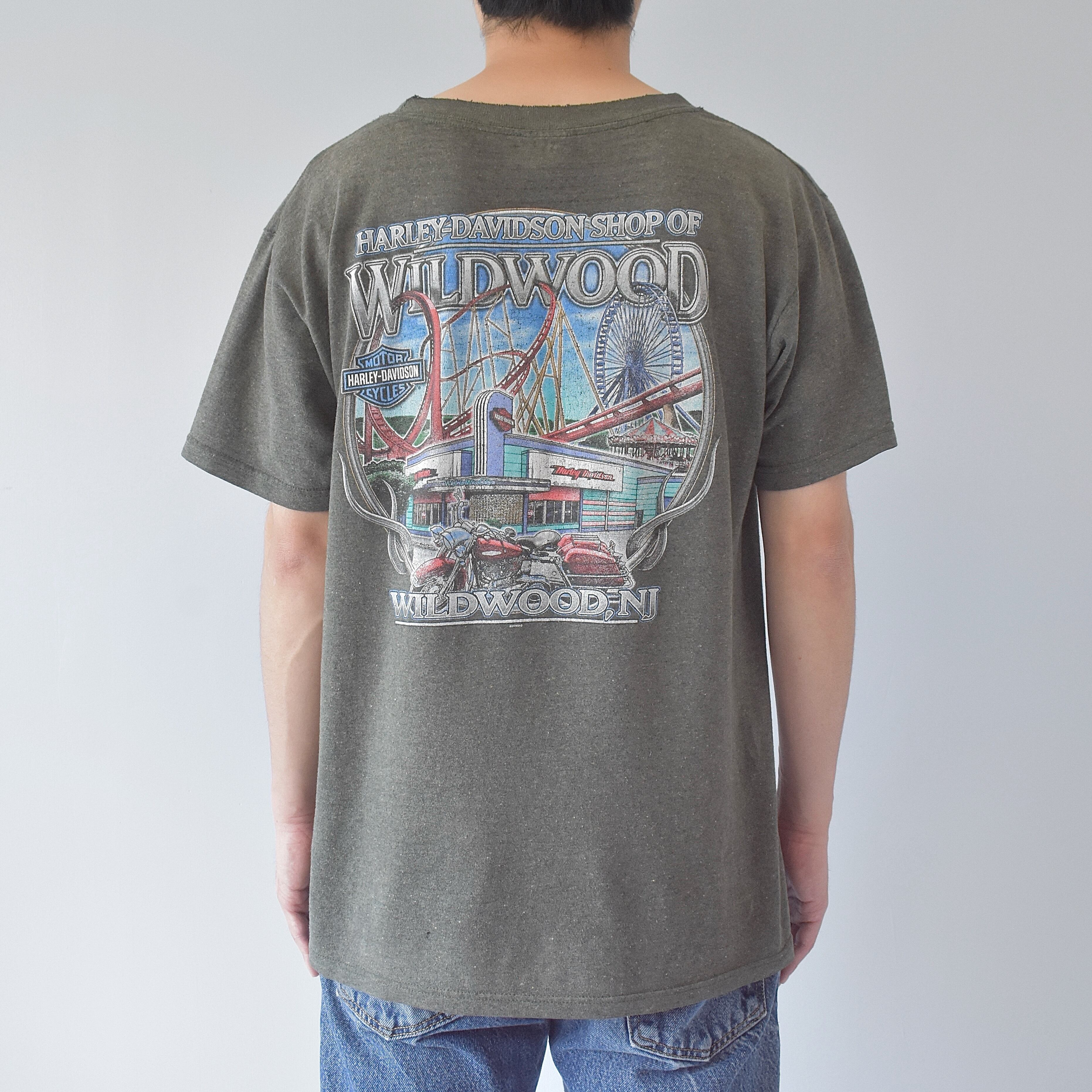 米カルチャーの象徴である "Harley Davidson"より、オリーブグリーンの霜降りボディに“らしい”大変大胆なグラフィックを力強く描いた一着。褪せた色合・ヤレ感や着込まれた風合がリアルな空気感を漂わせます。