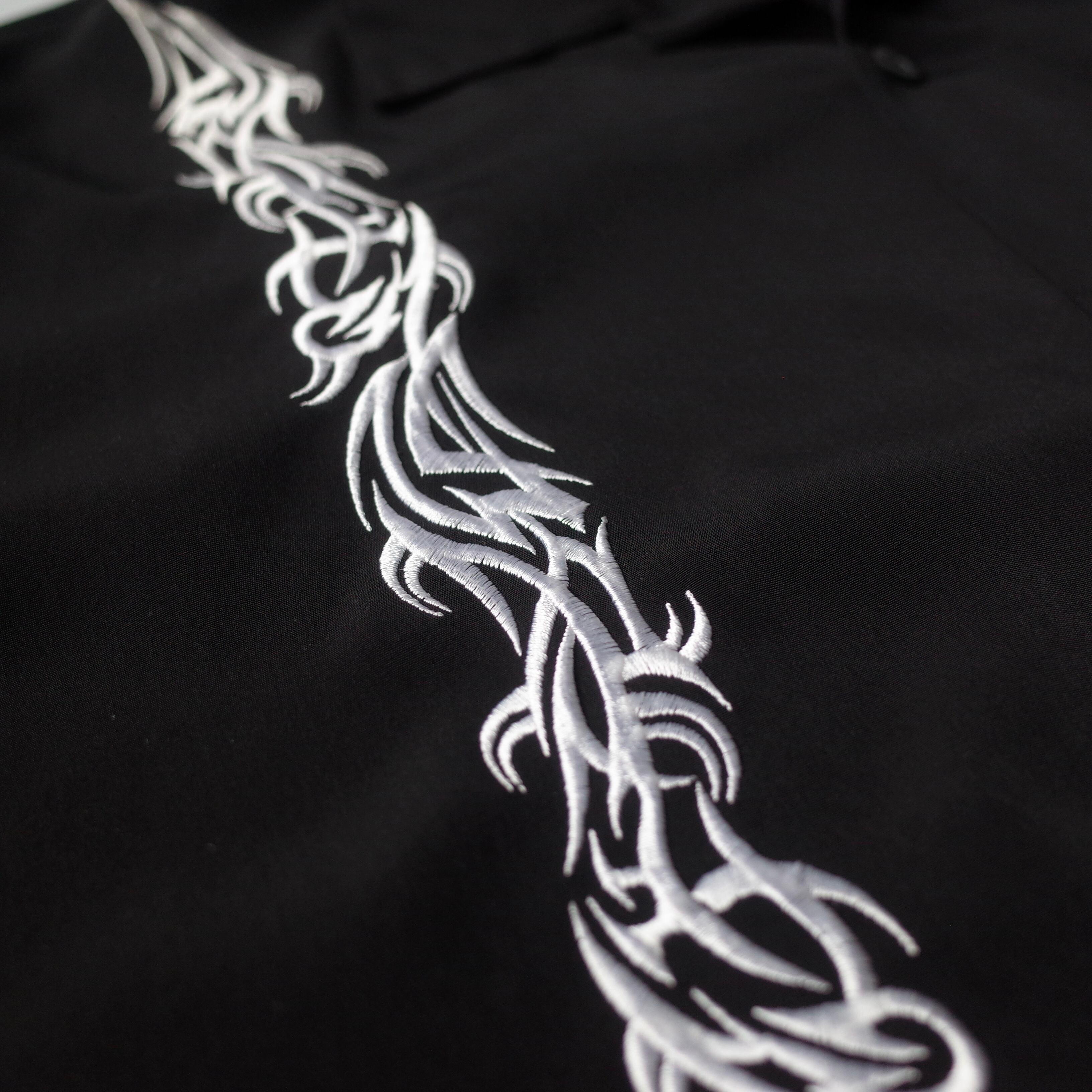 マットなボディにエッジの効いたトライバル柄刺繍が