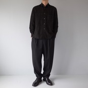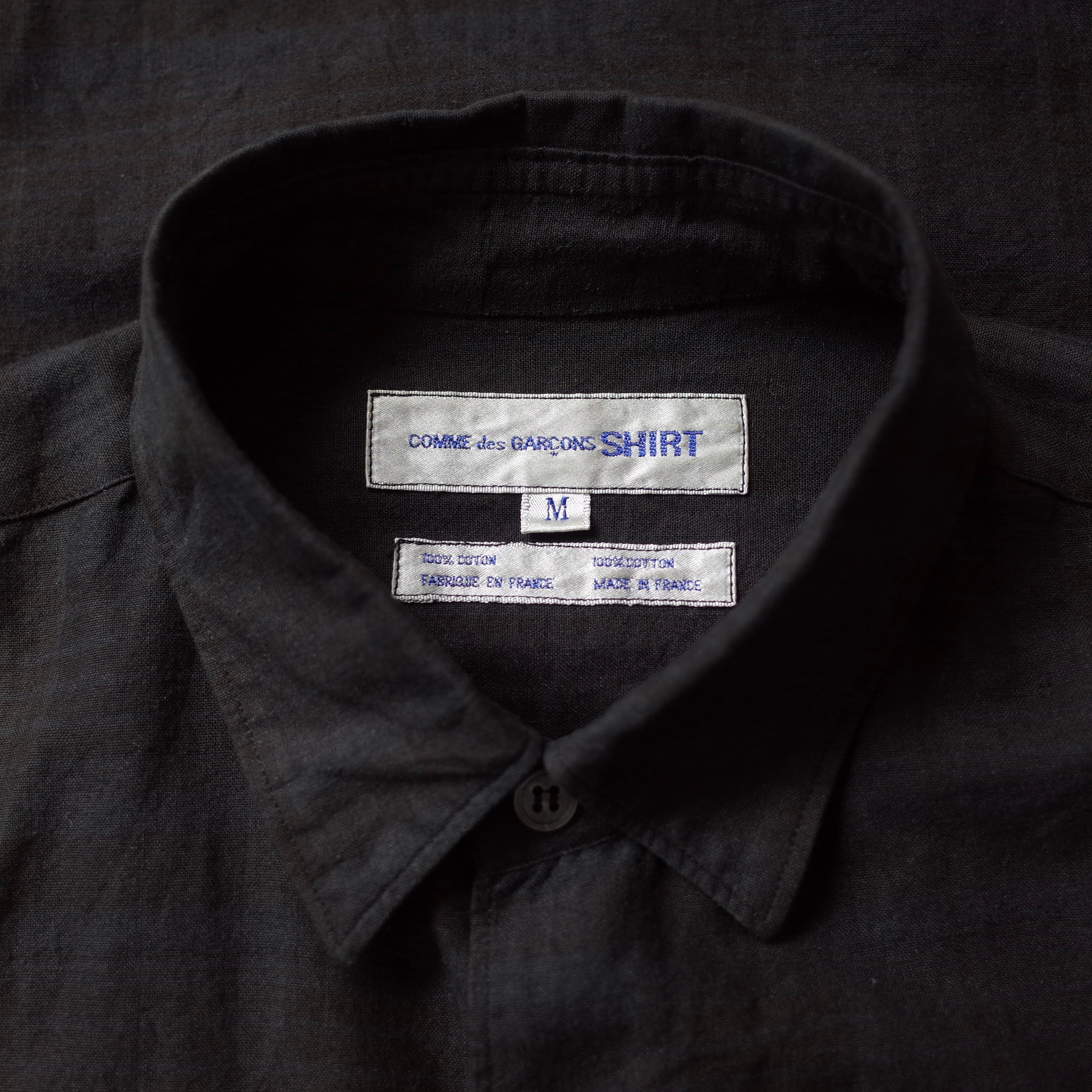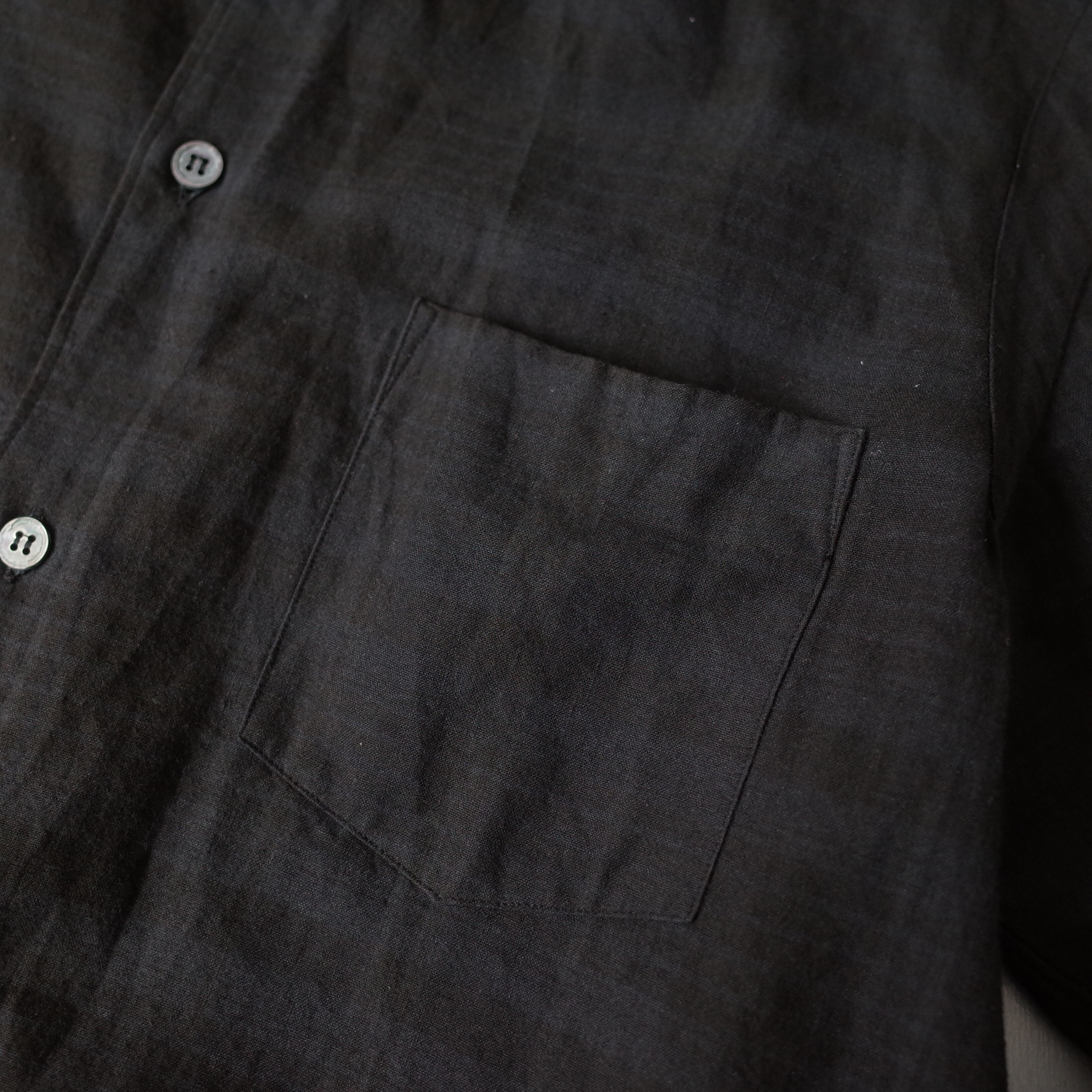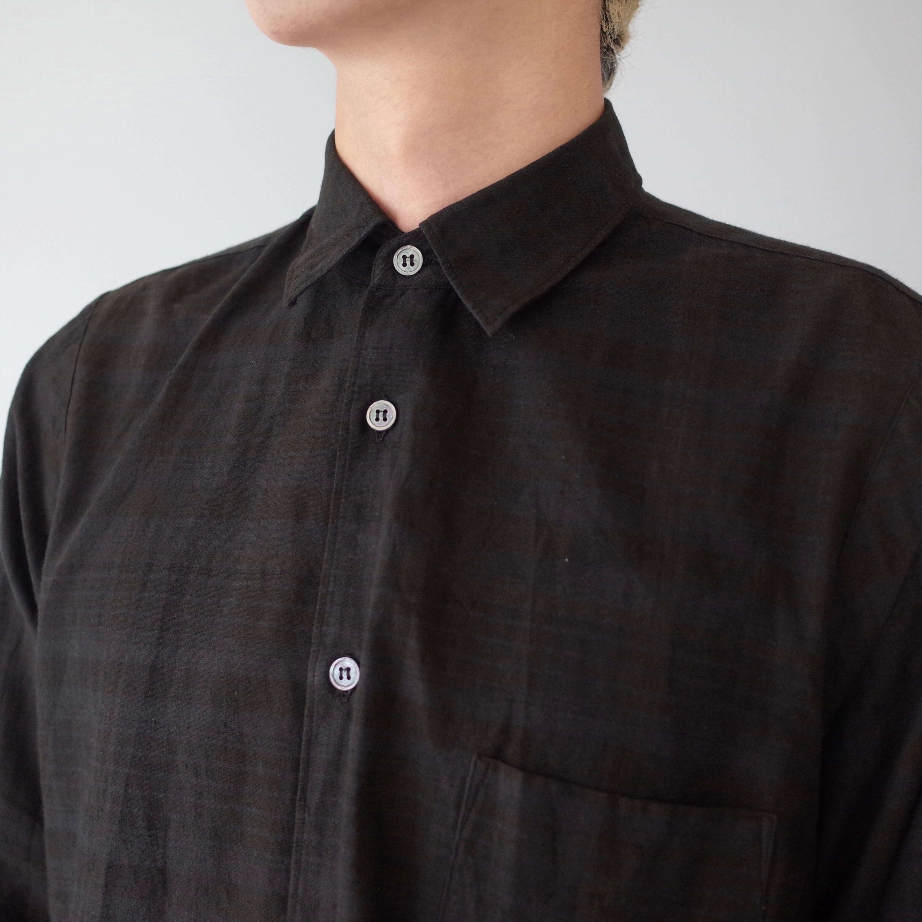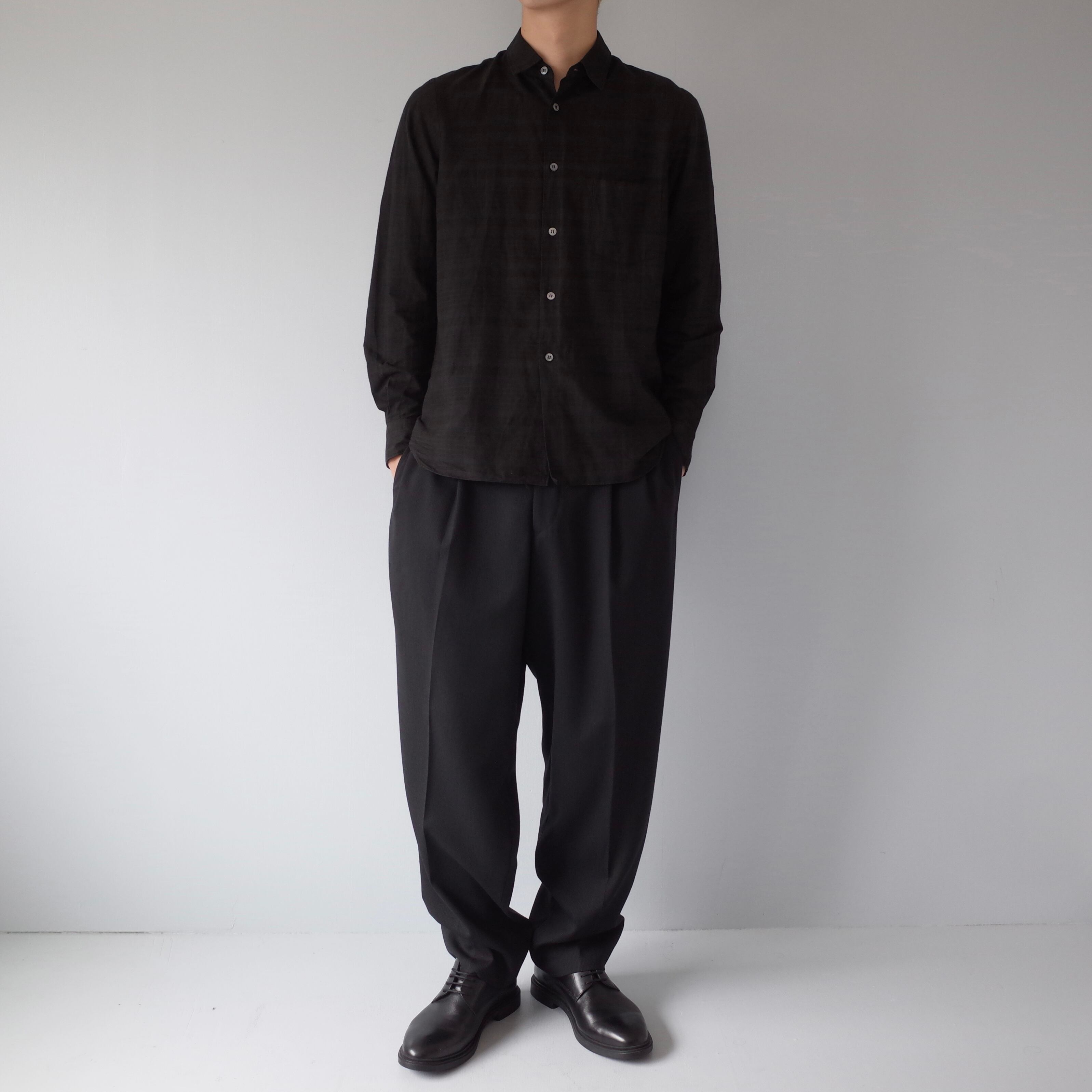 同系色のチェック柄をあしらったブラックシャツ。何とも