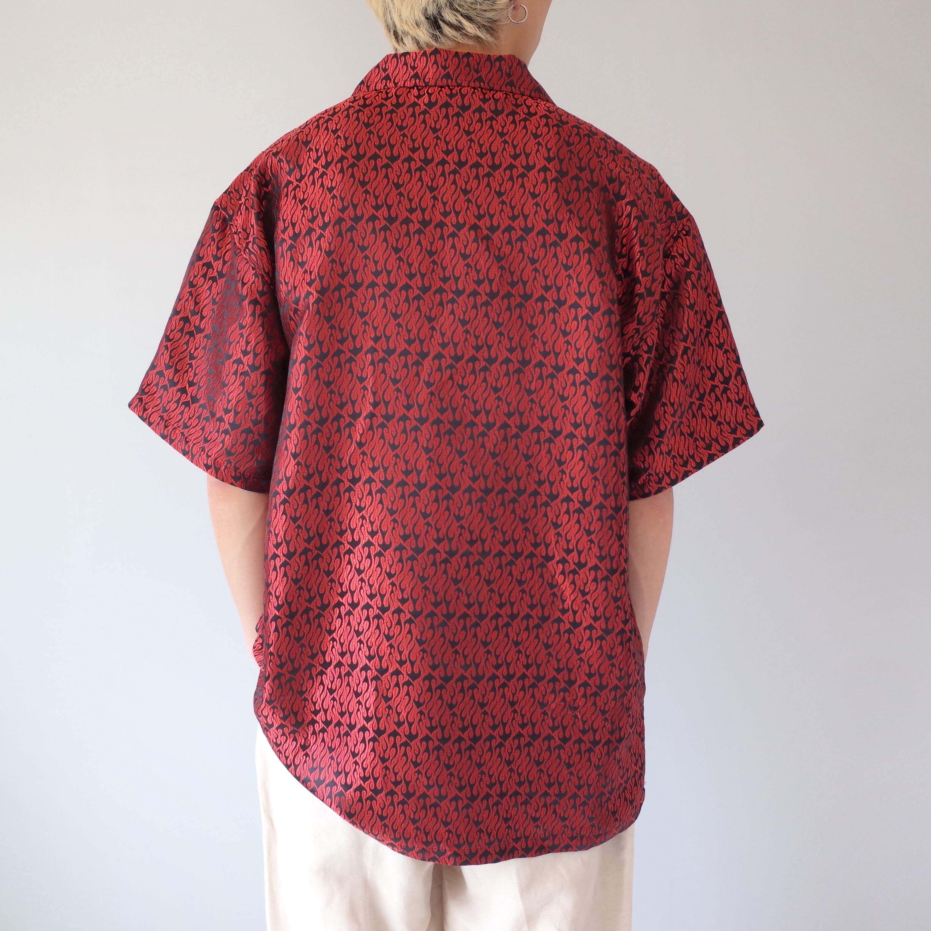 無数の炎がデザインされたレーヨン地採用の刺繍シャツ。