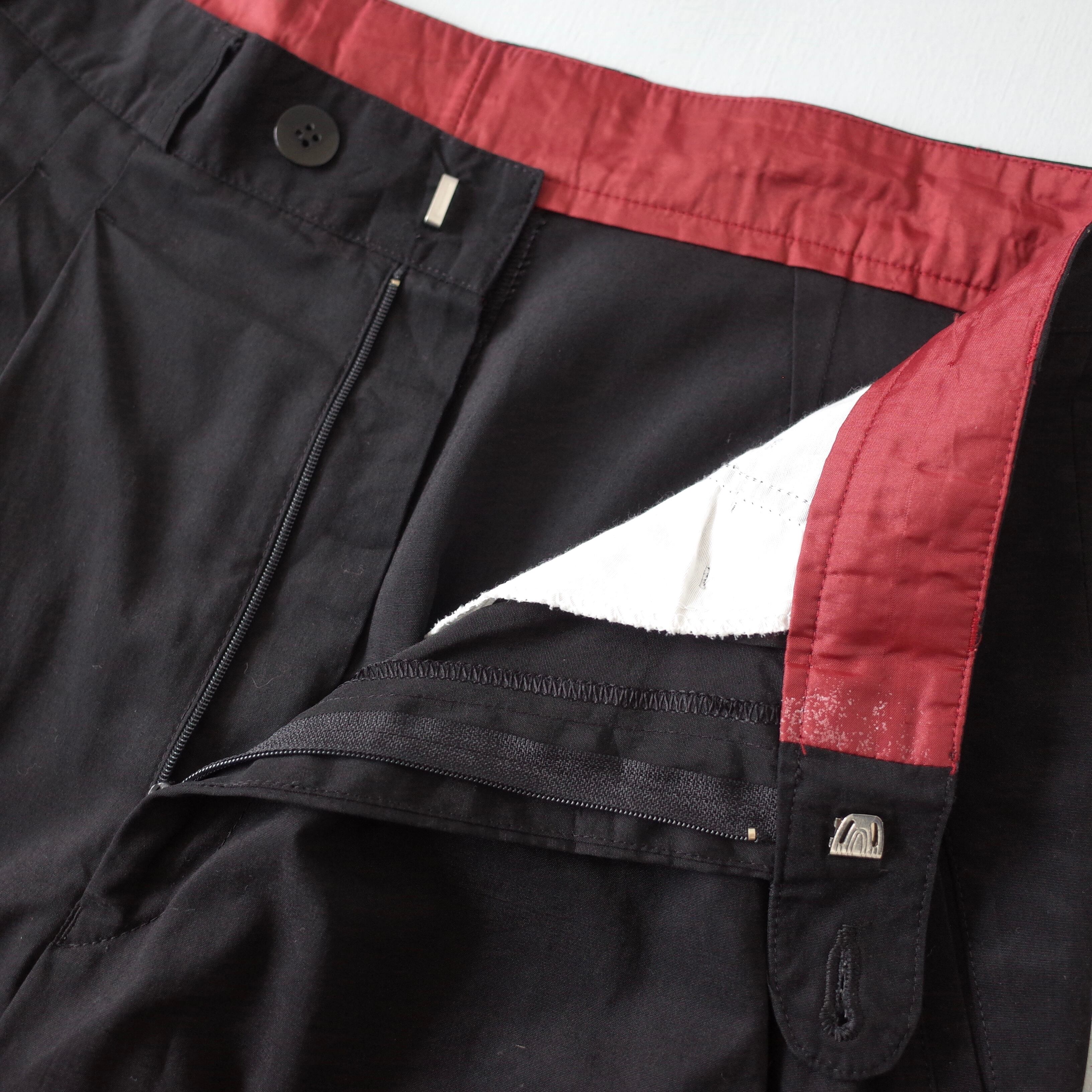 “VISCOSE”混紡のタックトラウザーズを素材に採用した一本。ややシャリ感のある手触りと穏やかな光沢を備える生地、見た目からも涼しさと上品さの伝わる一本です。