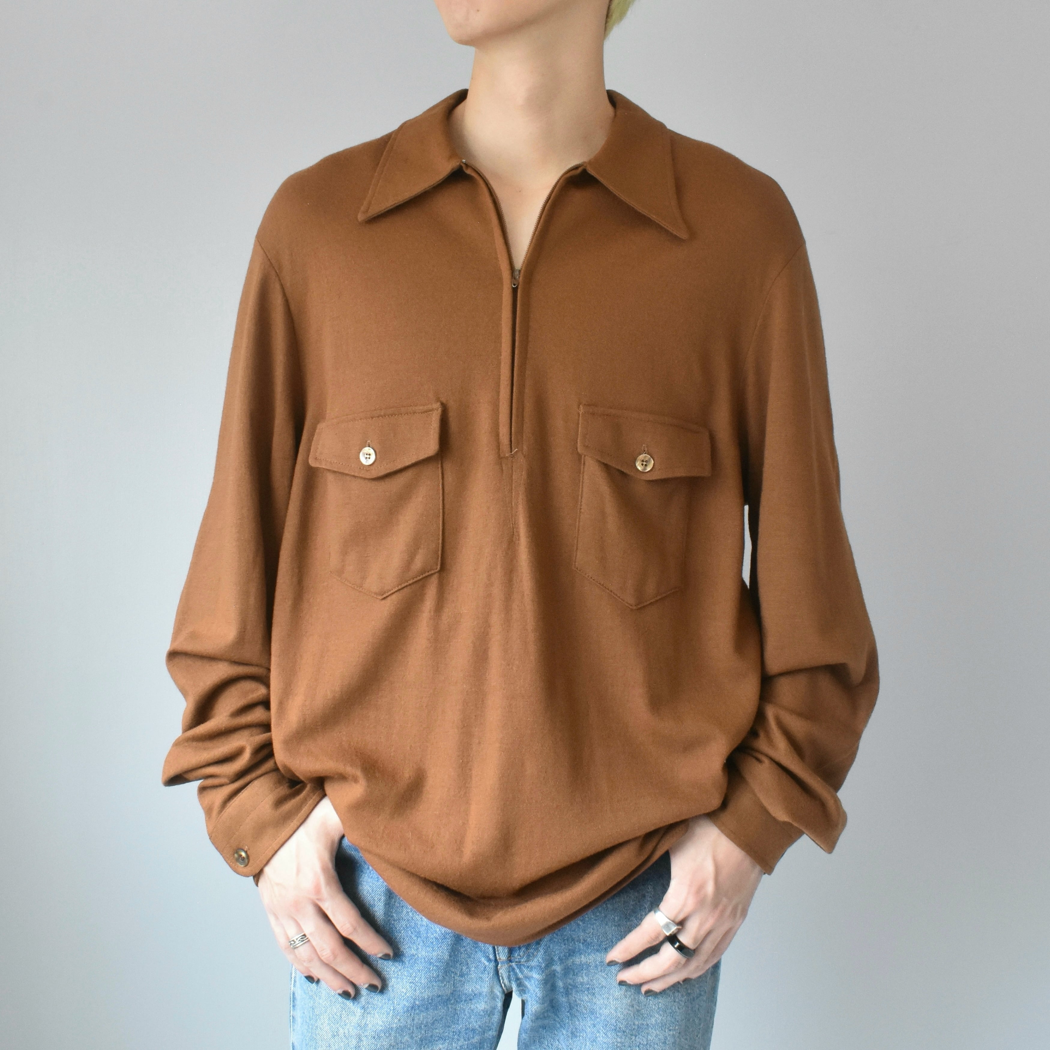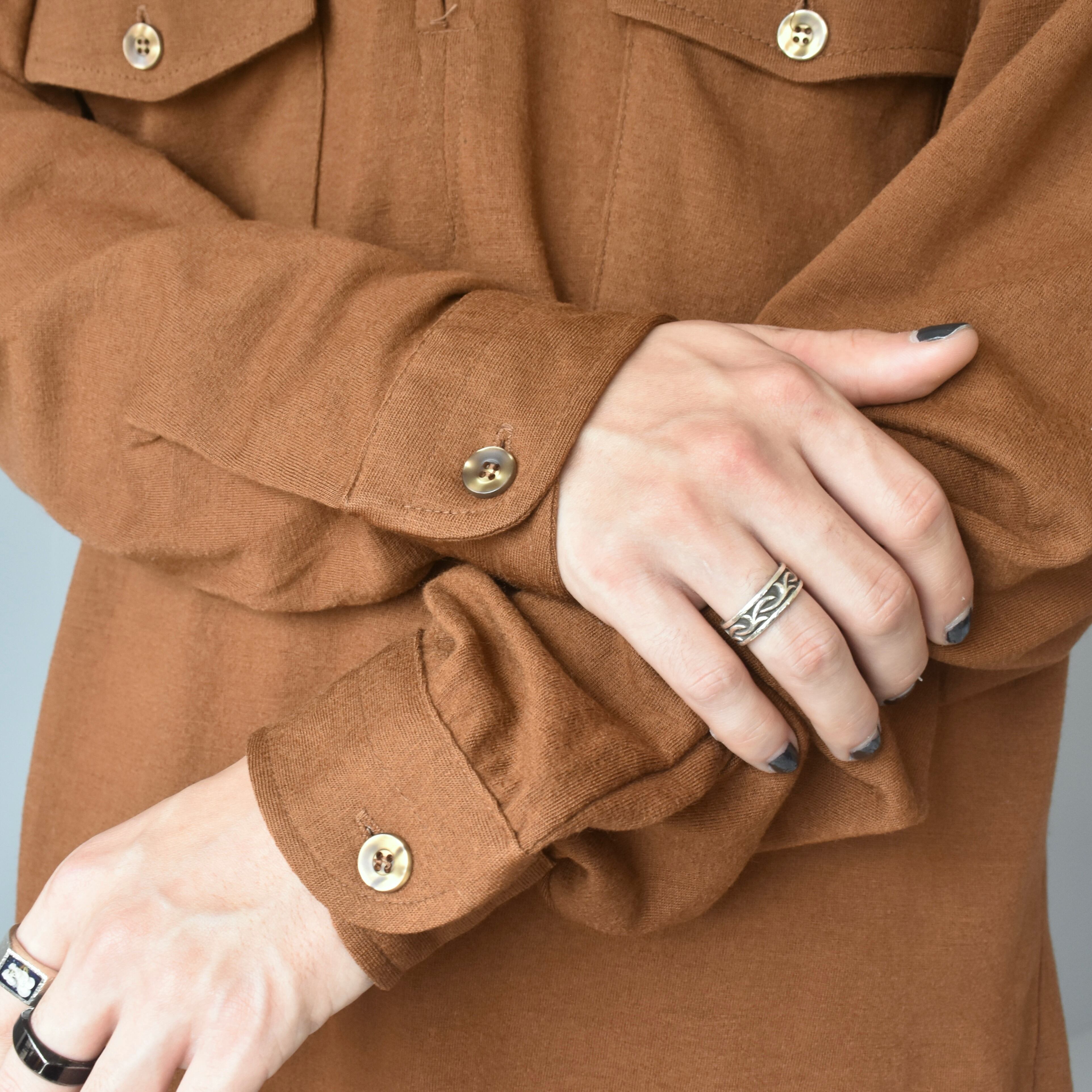 1970年代シャツの象徴とも言える特徴的な大きな襟で、シャープな印象を受けます。カントリー感じるキャメルの配色も抜群な米国製ウールシャツで、フロントポケットはやや下にデザインされ、タックインをせずともバランスを取ることの出来る一枚となっております。