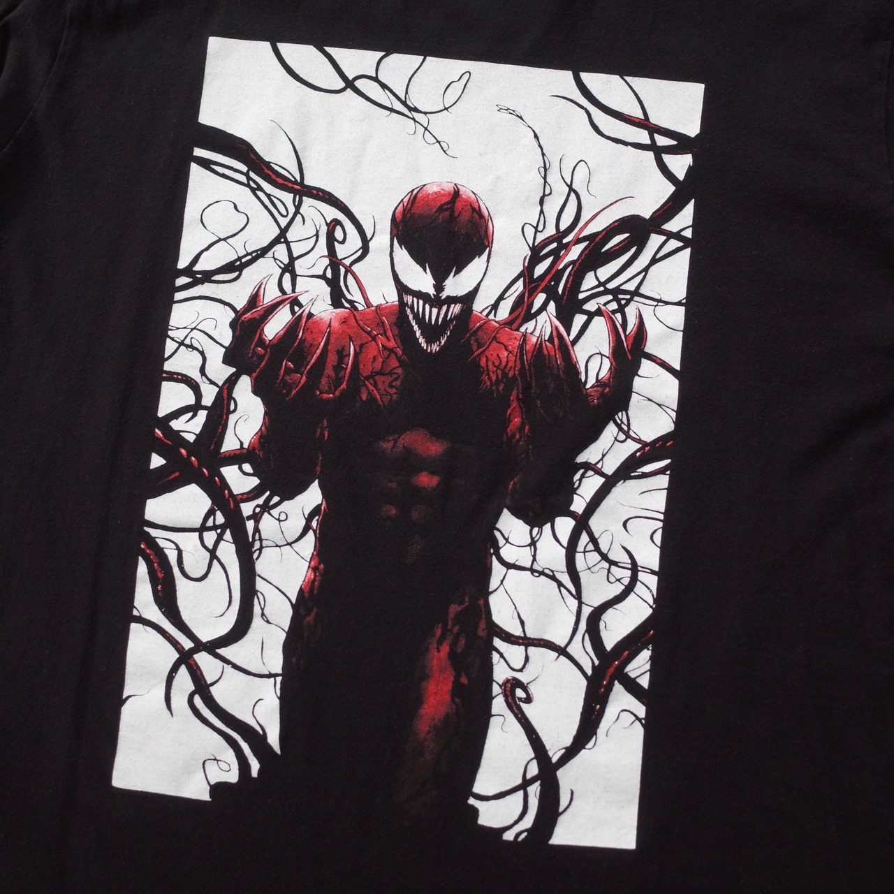 “SPIDER-MAN”に登場するヴィランの中でも強力な敵と知られる“CARNAGE”が大判プリントされたTシャツ。