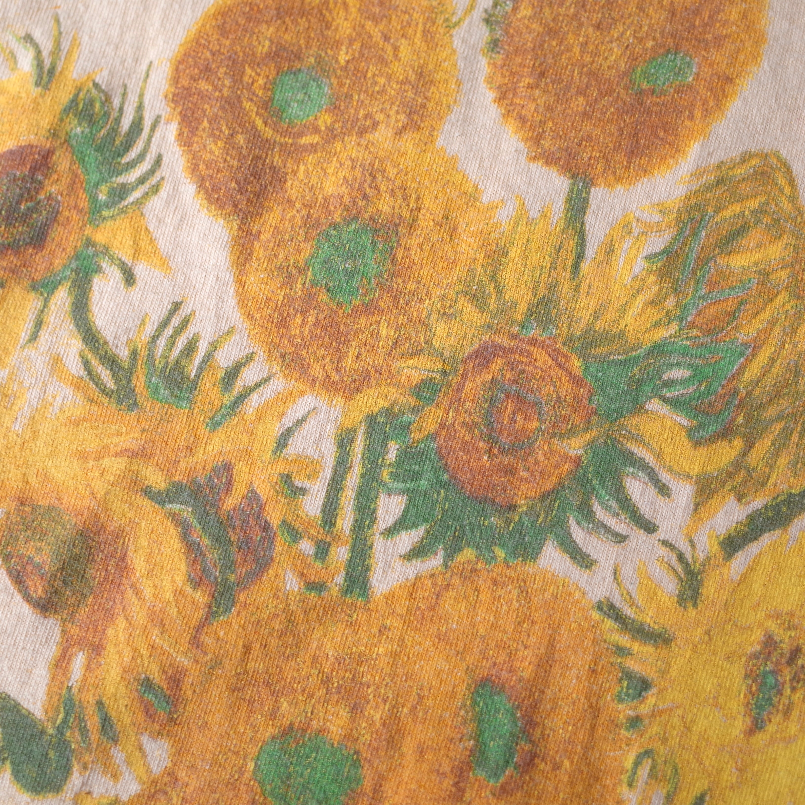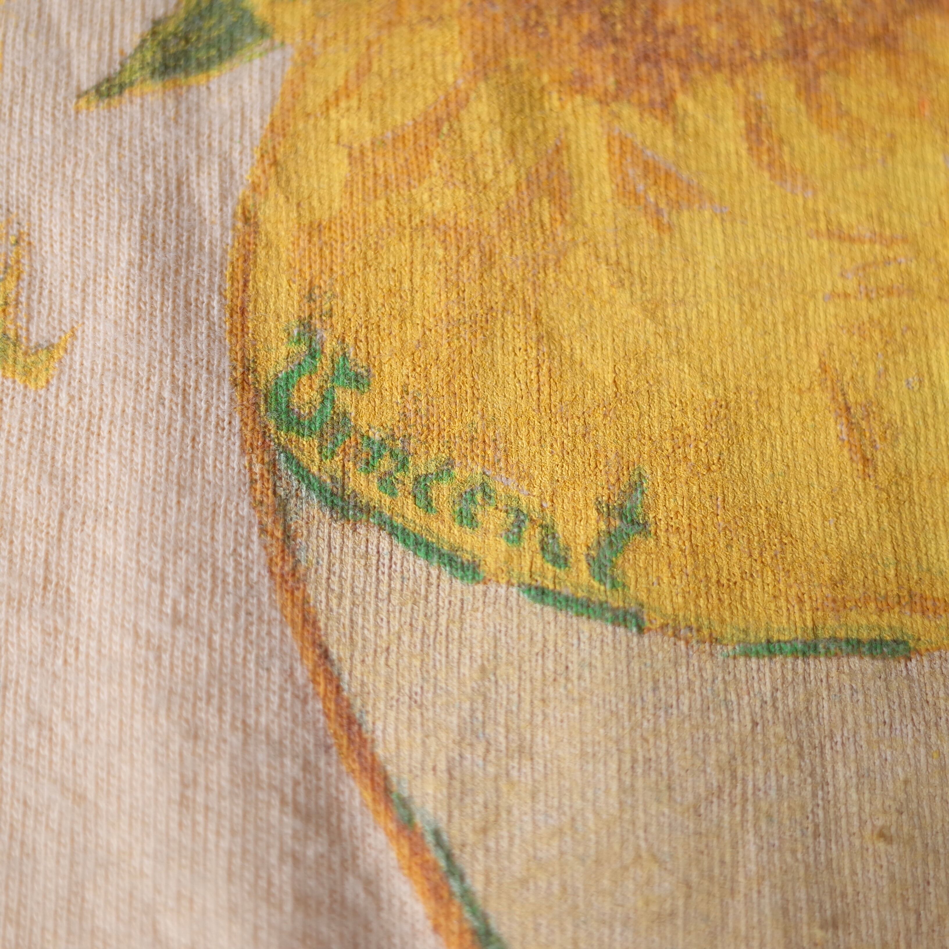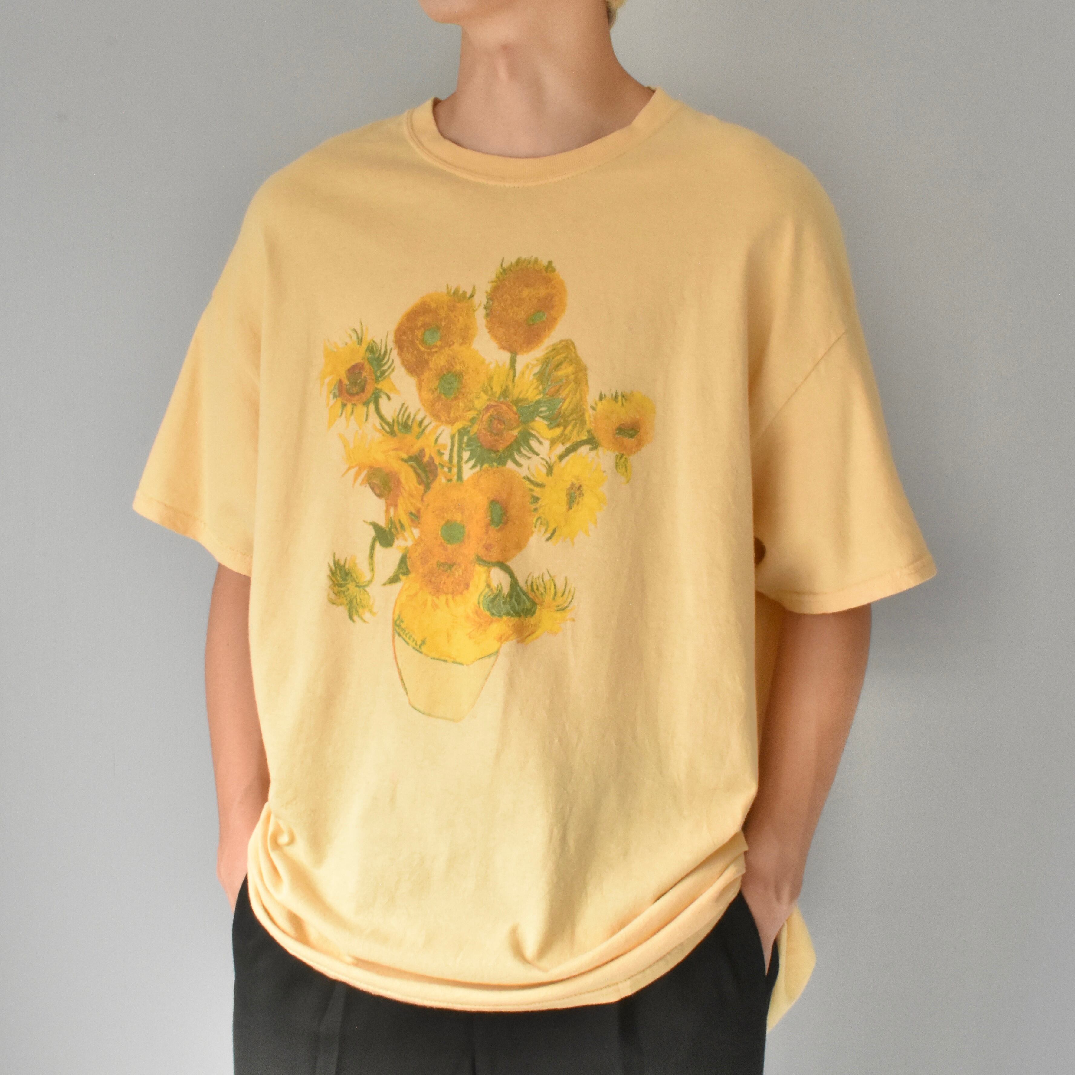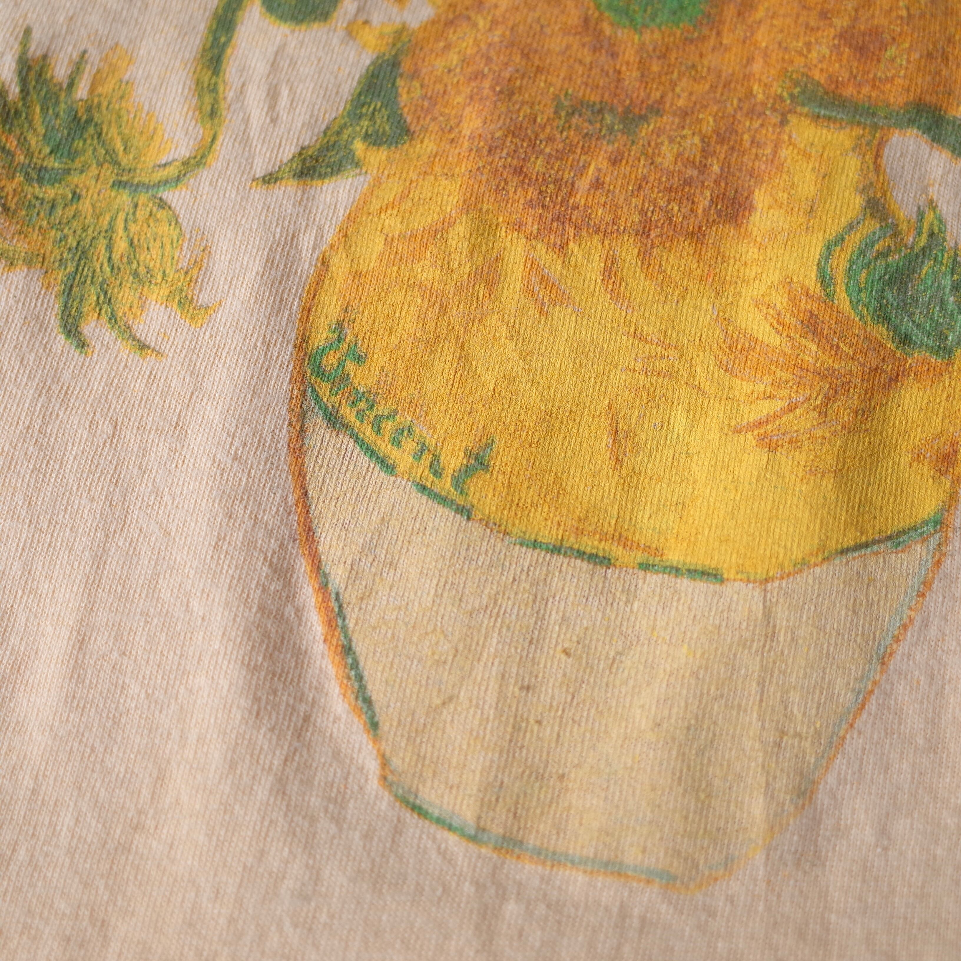 オランダ出身の世界的画家"Vincent van Gogh"の代表作『Sunflowers』をフロントへ描いた一枚。鮮やかな色彩の絵画を存分に生かす、淡いイエローが粋なTシャツ。