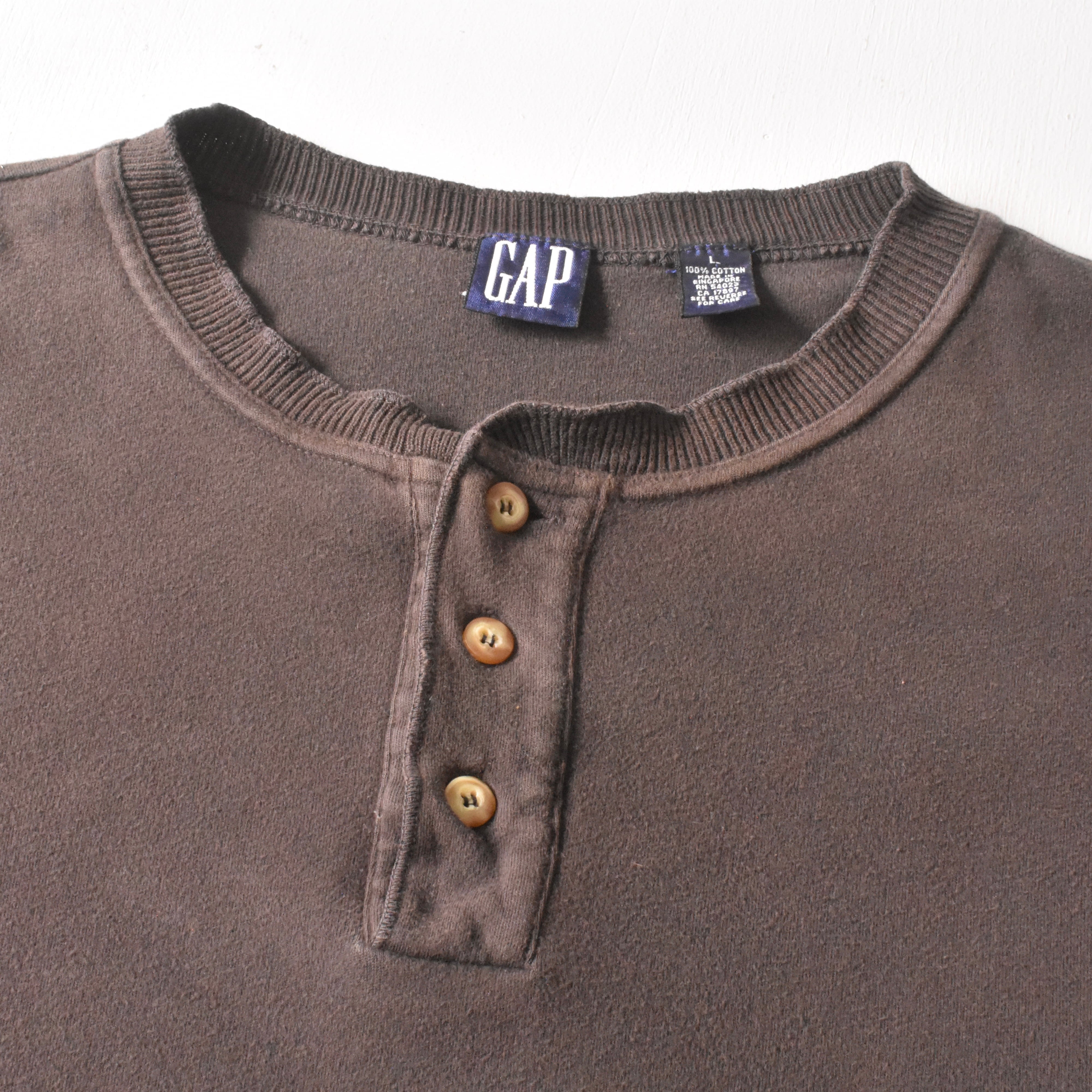 今回は90's~"OLD GAP"からのサイズバランスの整ったヘンリーネック。厚みと柔らかさを兼ね備えた上質な綿にフェードしてマイルドなチョコレートブラウンの色合が、大変魅力的な一着。余計なデザインか削ぎ落とされているベーシックな逸品です。