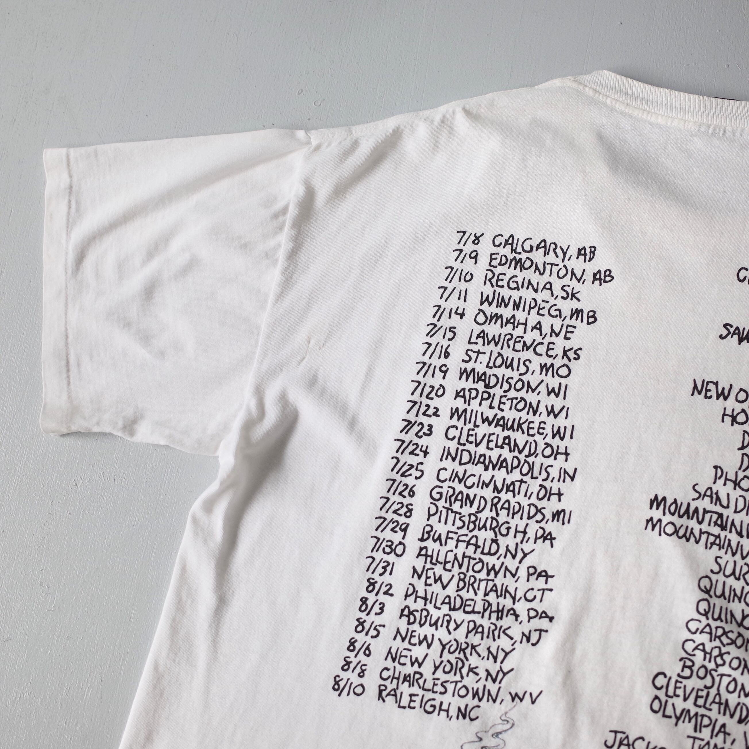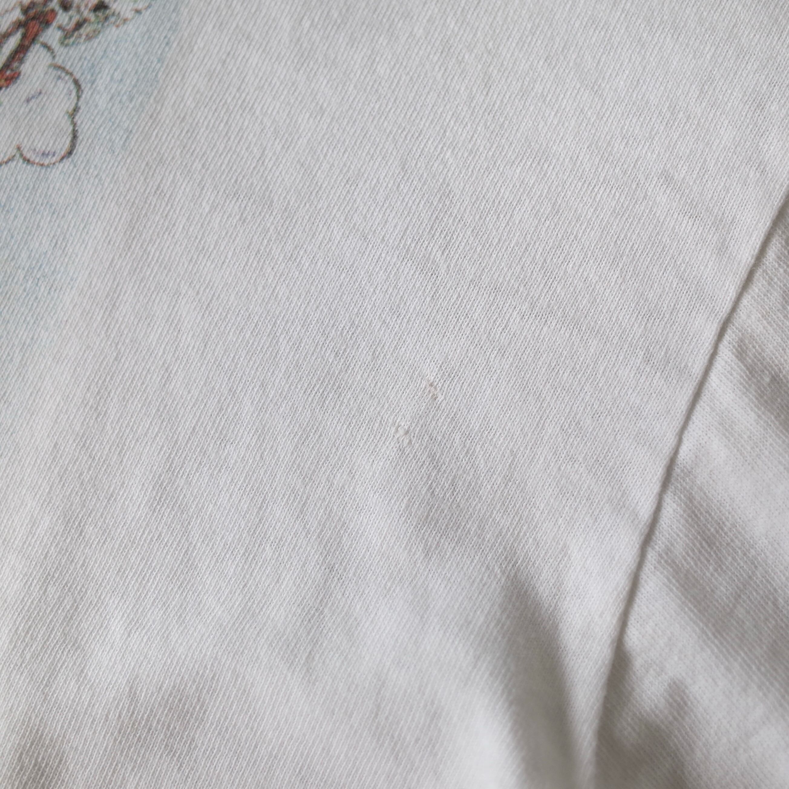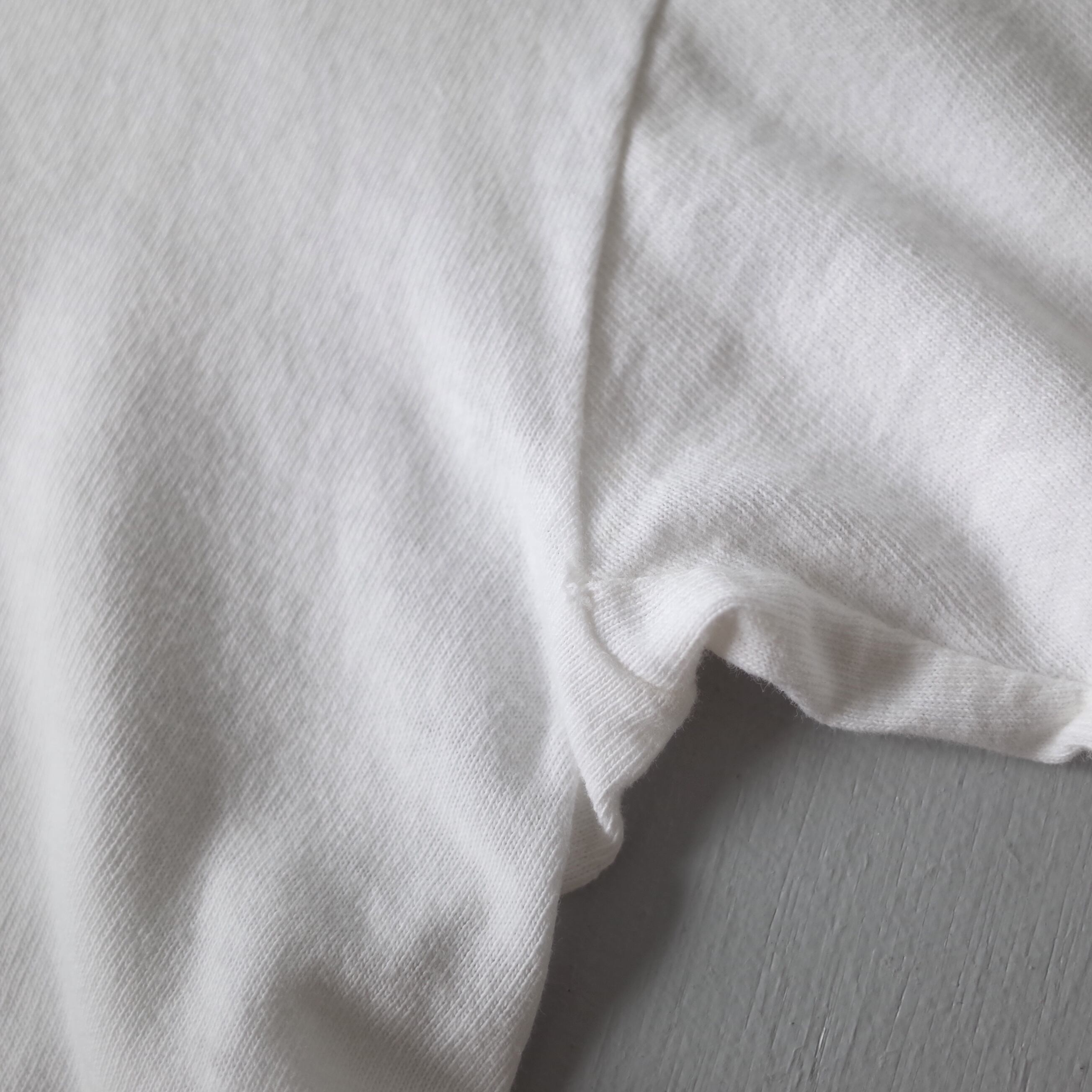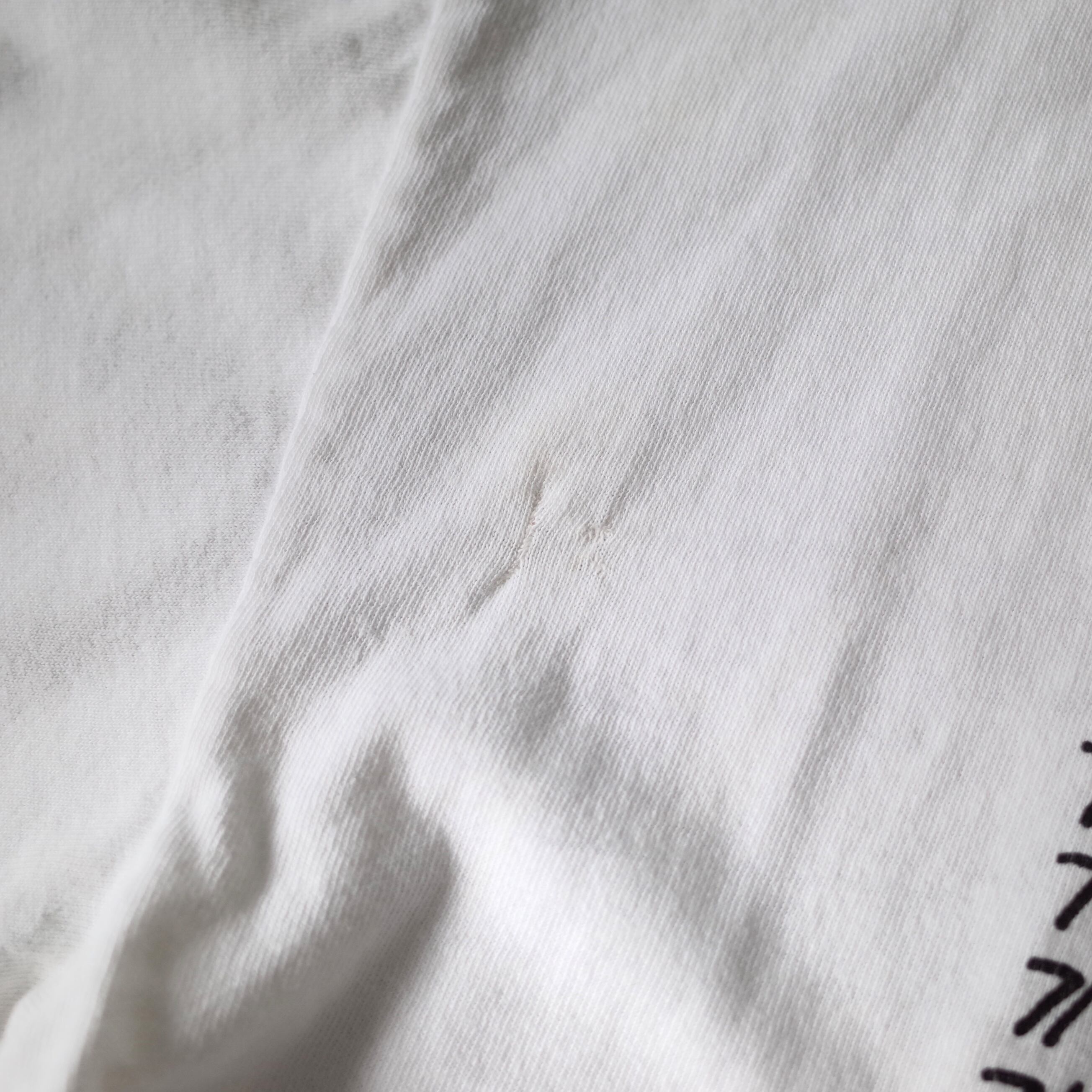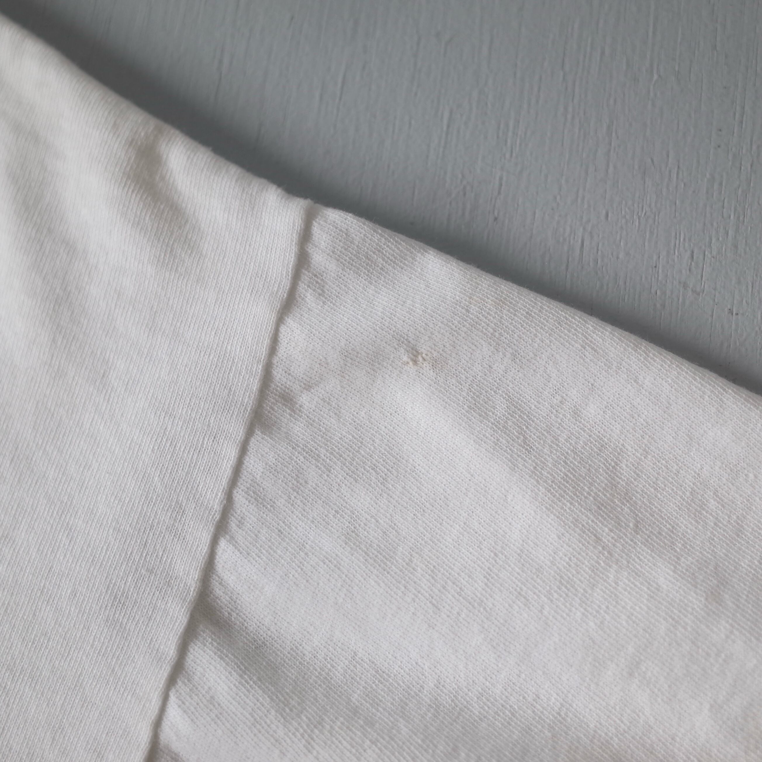 CONDITION B (使用感、全体的な汚れ、フロント・背面・左袖 リペア跡、ネック内側に名前記載、脇ピンホール、襟ぐり・袖口 傷)