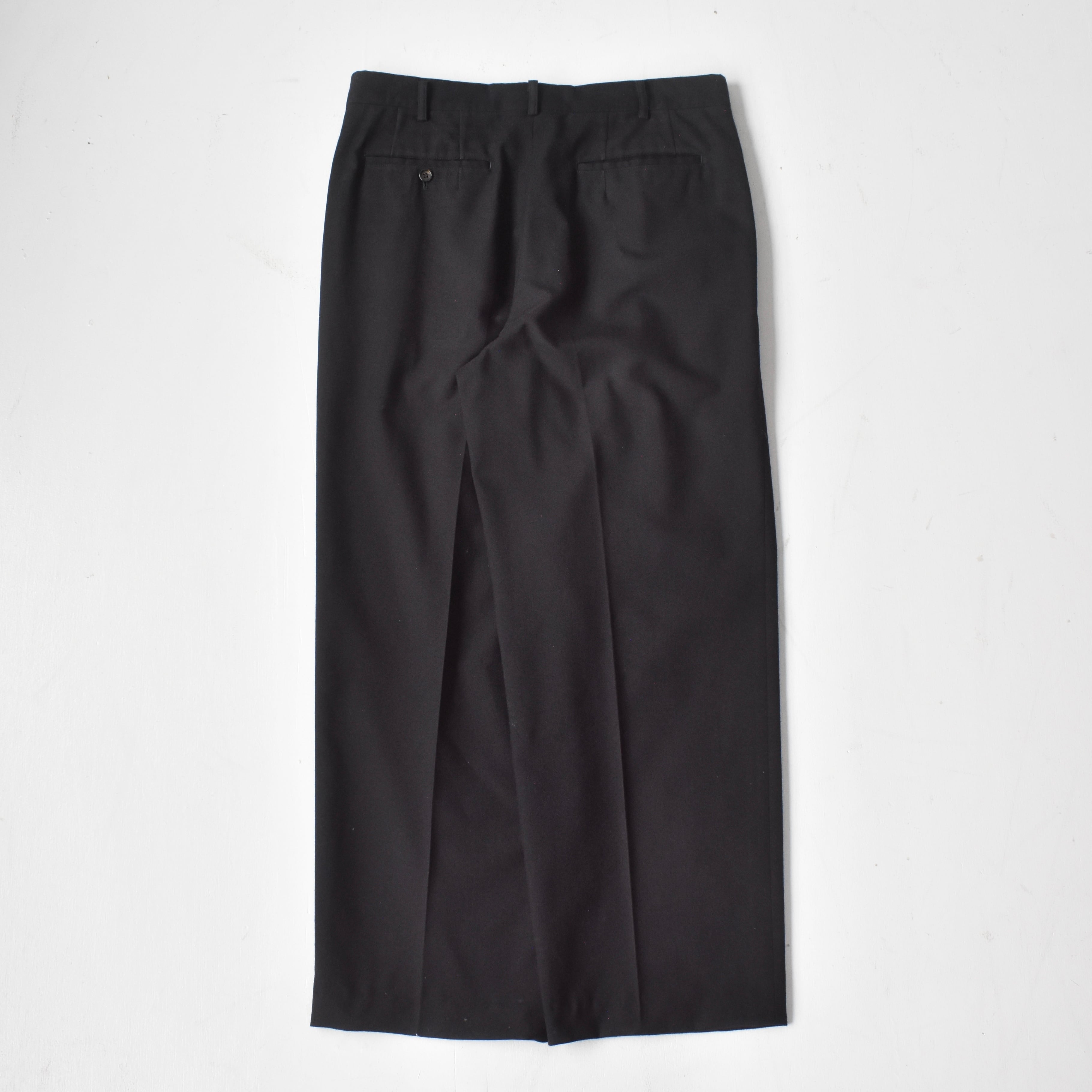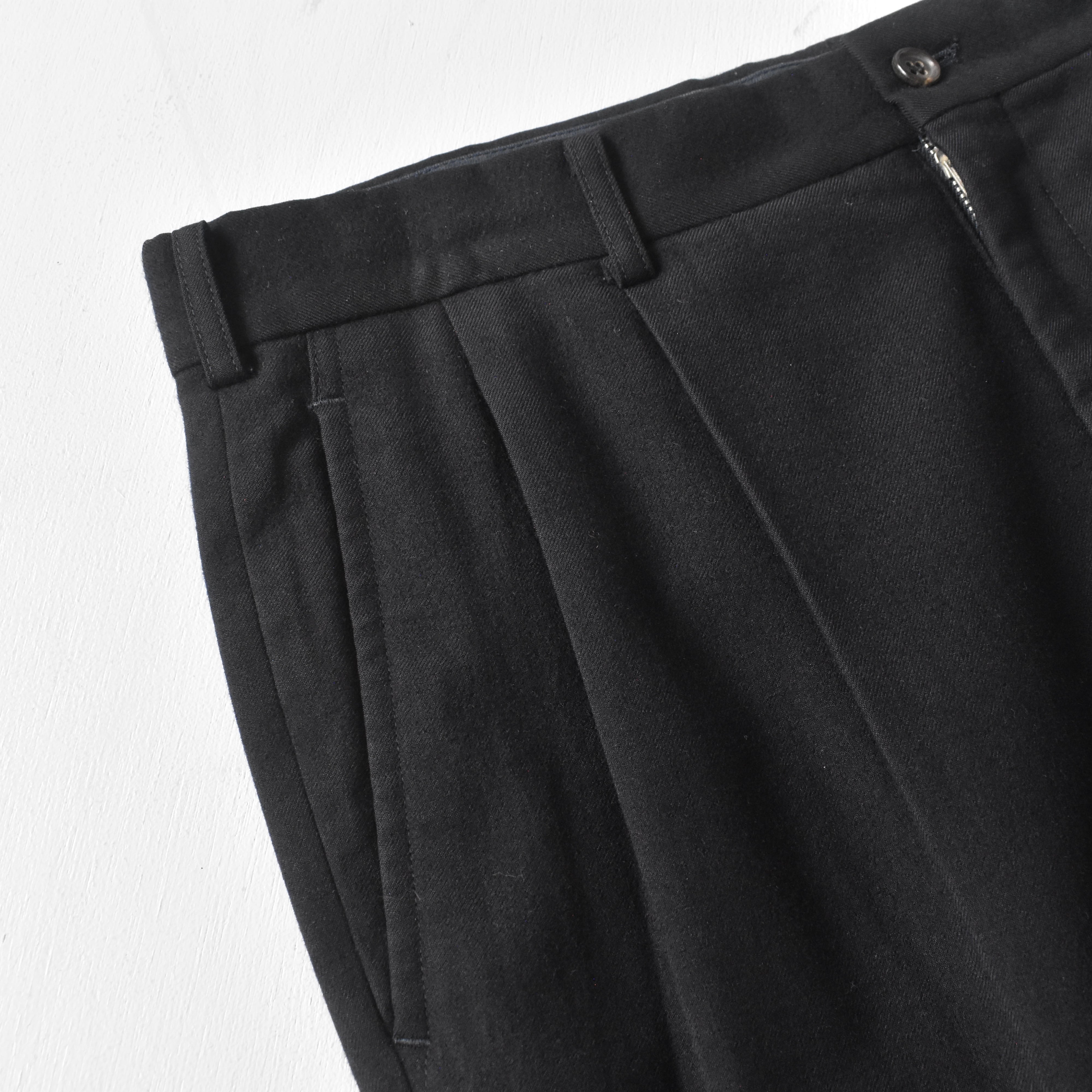 内タグより1989年に製造されたアイテム。キメ細かなウールギャバジンを用いた色気ある逸品で、ゆとりある腿周りから上品なアウトラインを描きながら裾までストンと落ちる美しいシルエットに惹かれます。