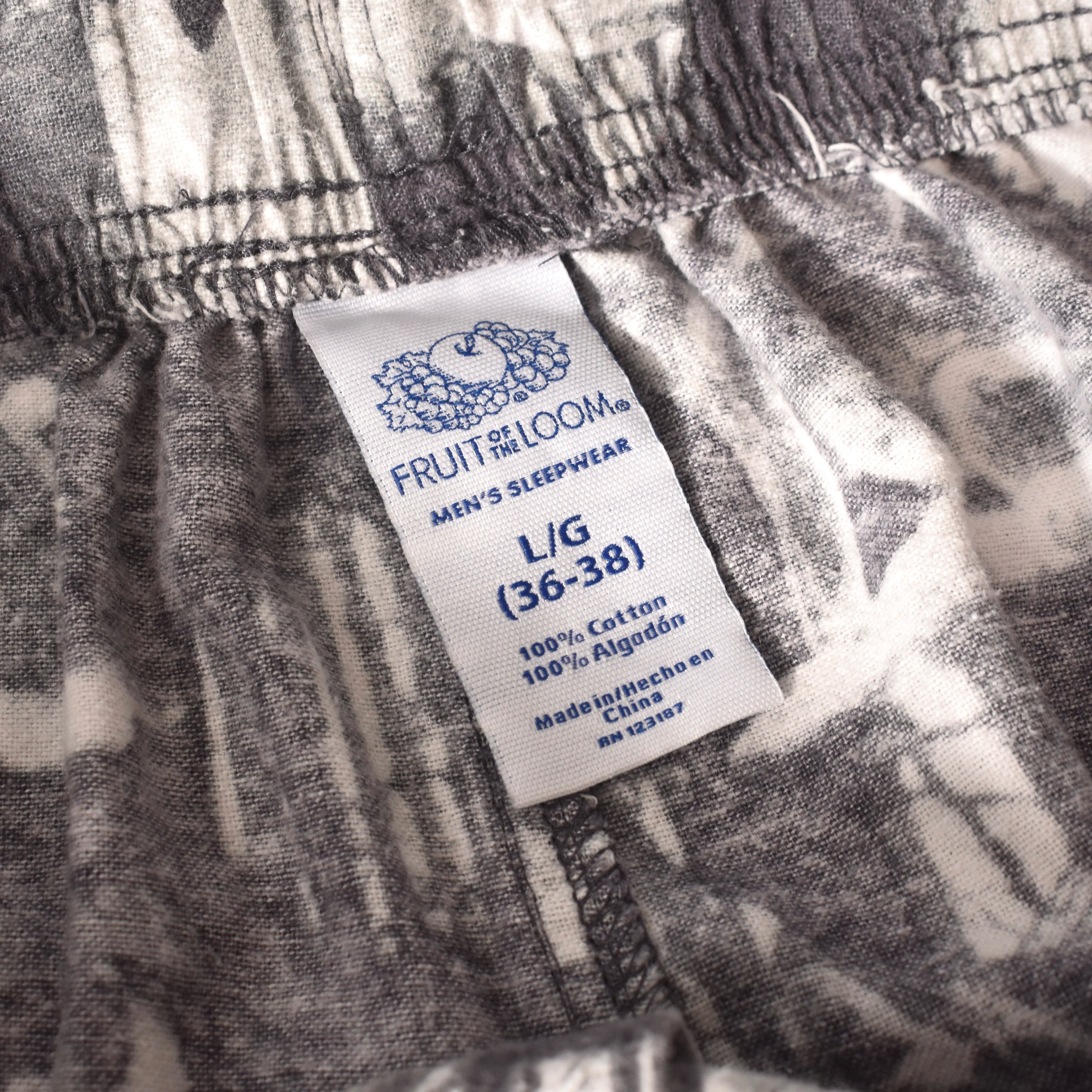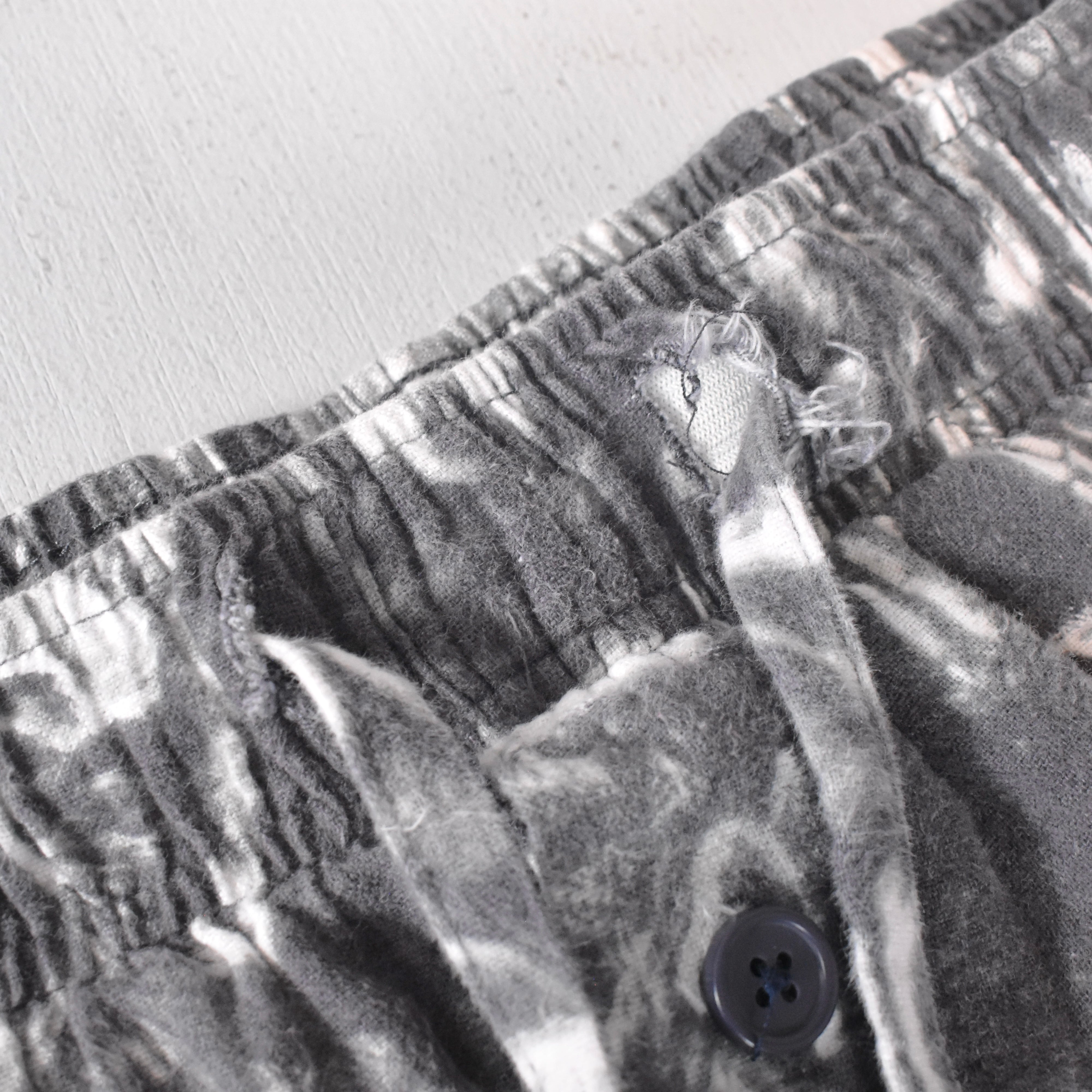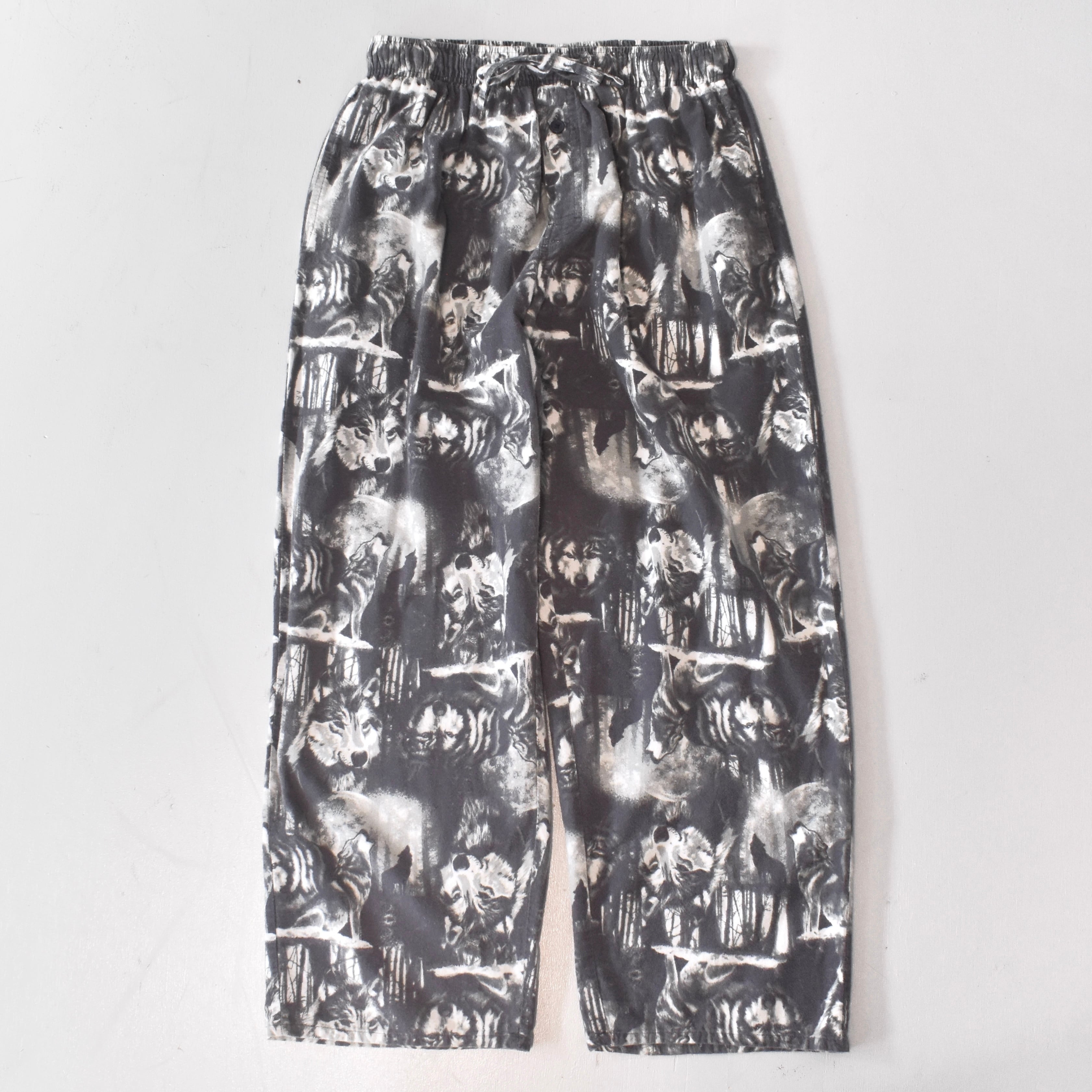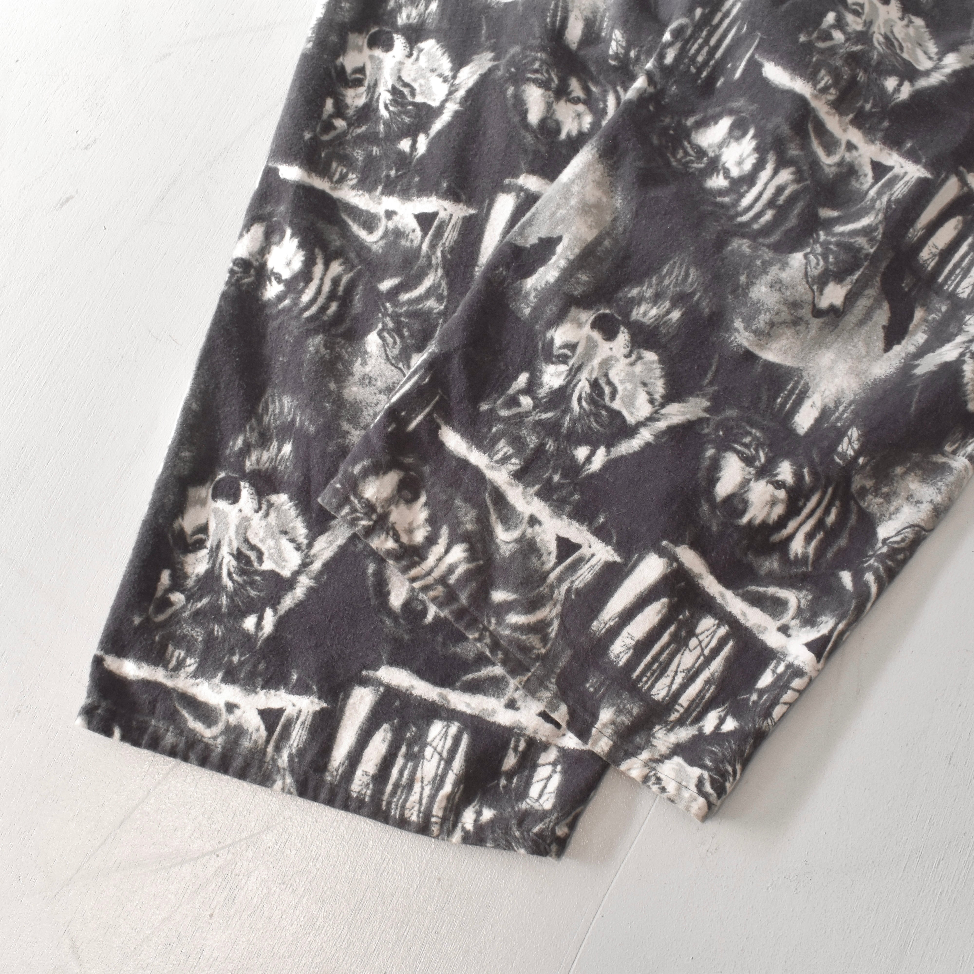 "FRUIT OF THE LOOM”ボディを採用したワイドシルエットの総柄EZパンツ。月光に遠吠えする姿や針葉樹林に身を潜める姿など雄々しい様子の『狼』たちが大変印象的な逸品。