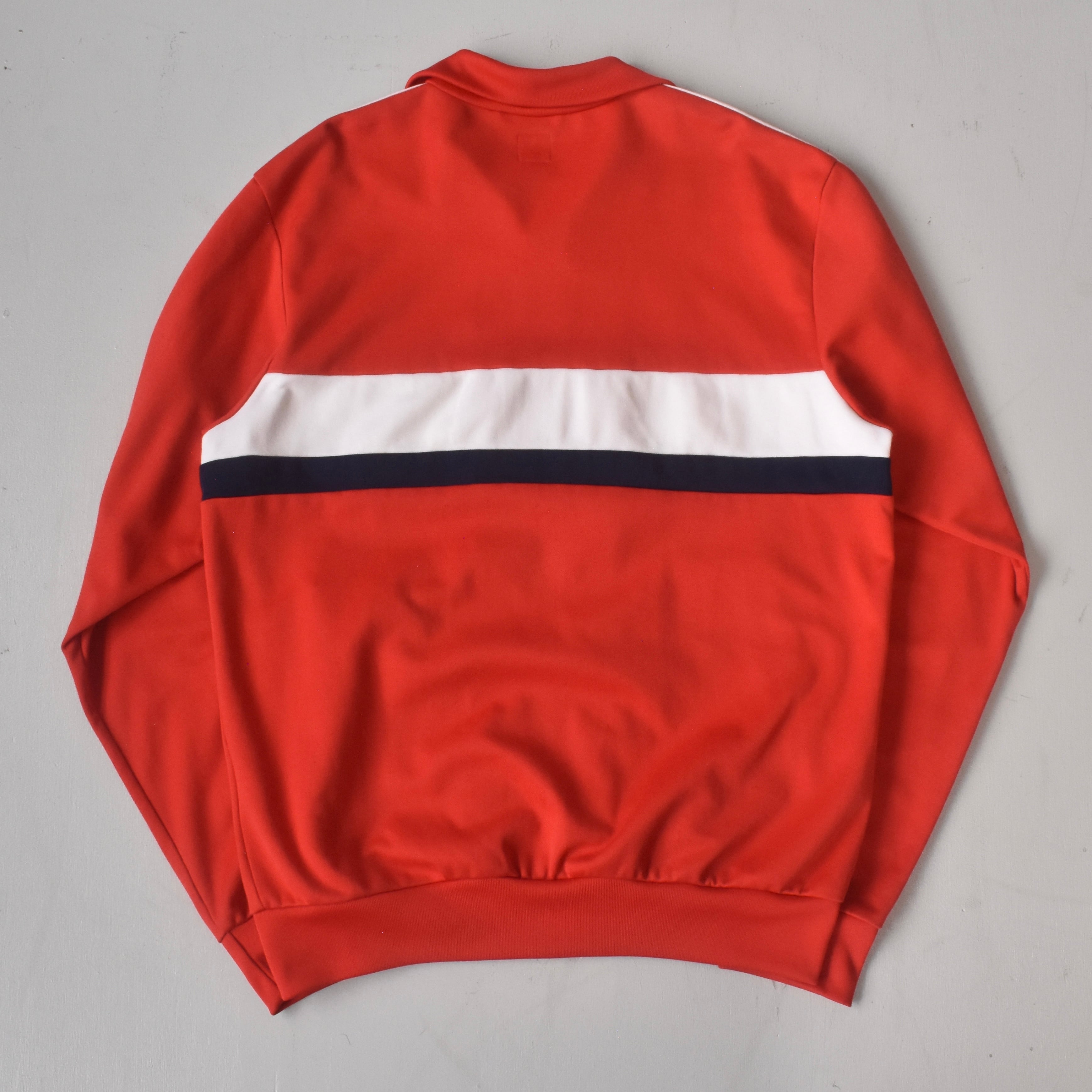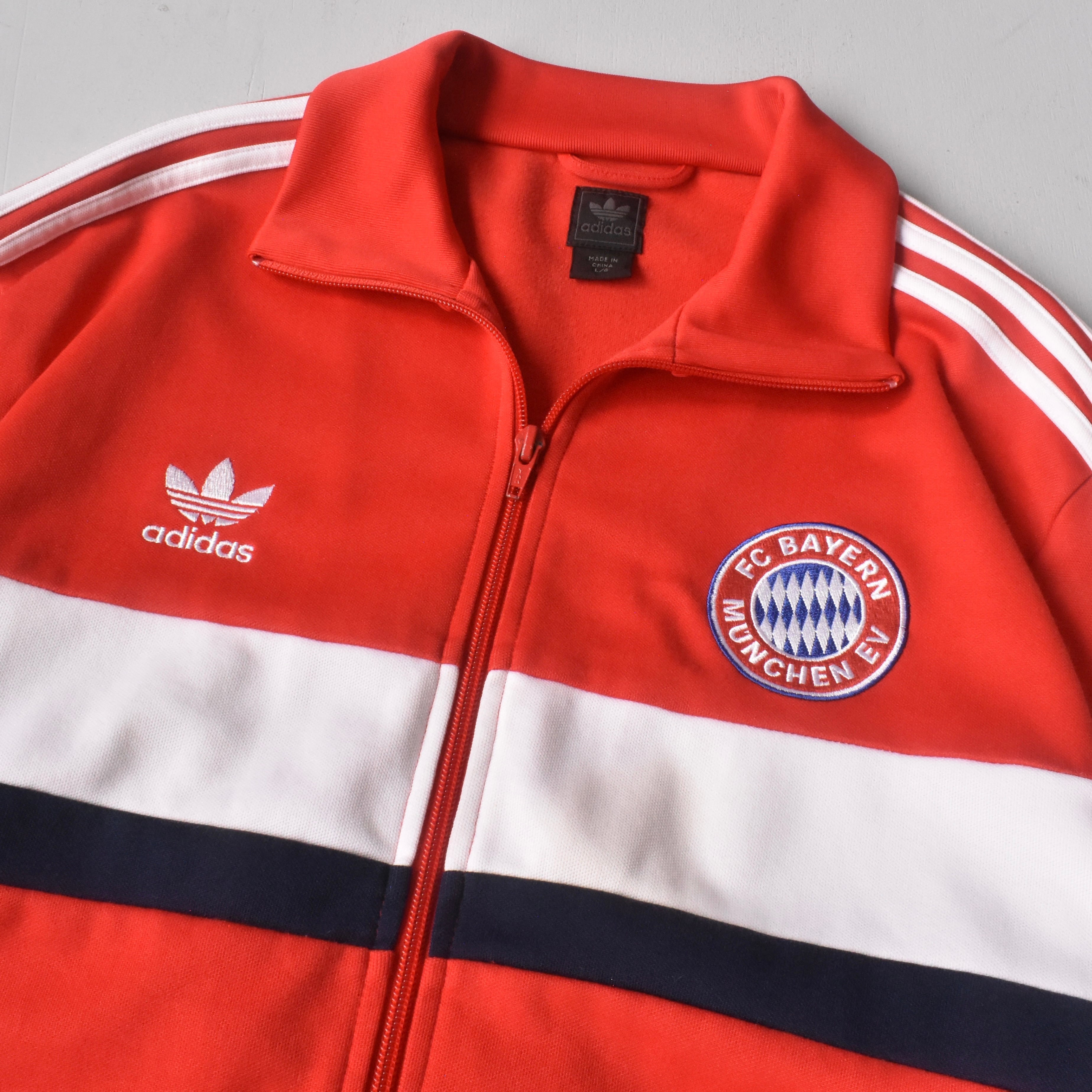 ドイツの強豪『Bayern München』のクラブエンブレムが刺繍された"adidas"のトラックジャケット。クラブカラーである赤と白を用いたカラーリングが魅力的で、ソリッドなデザインとハイネック仕様のディテールも嬉しいポイント。春秋には一枚着として、冬にはジャケットのインナーとして活躍する華やかな逸品です。是非。