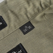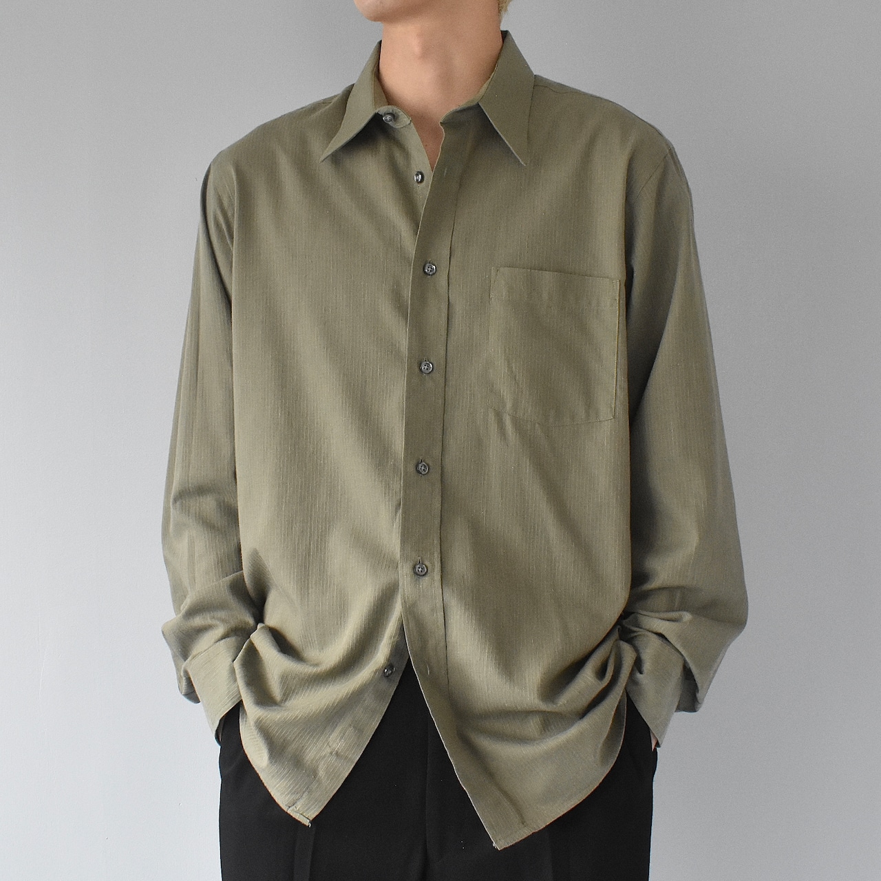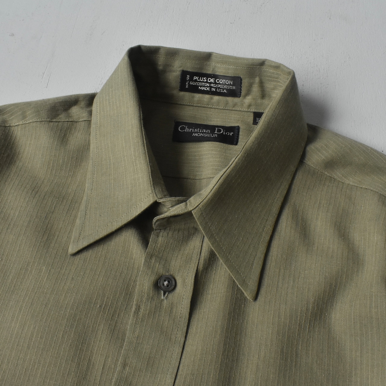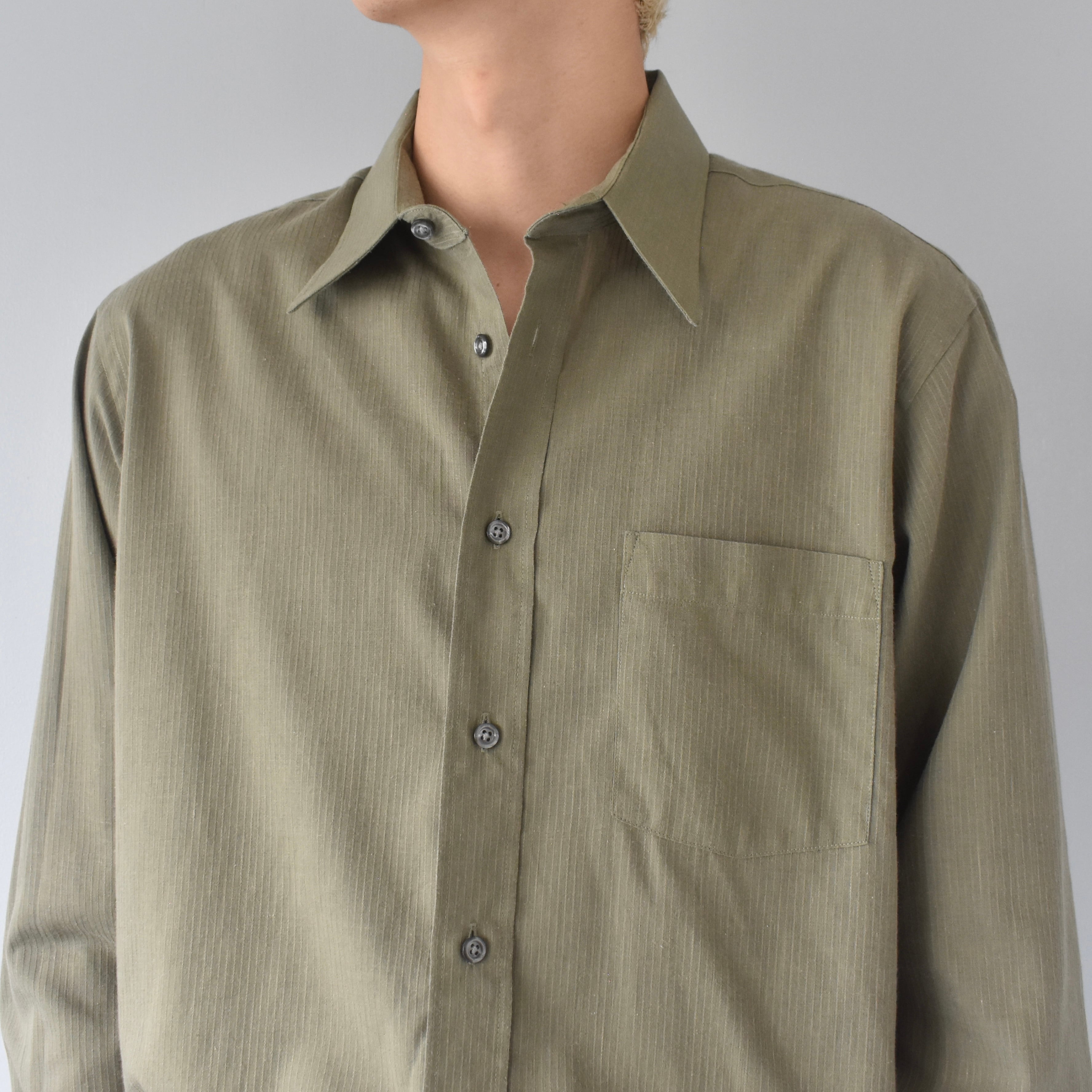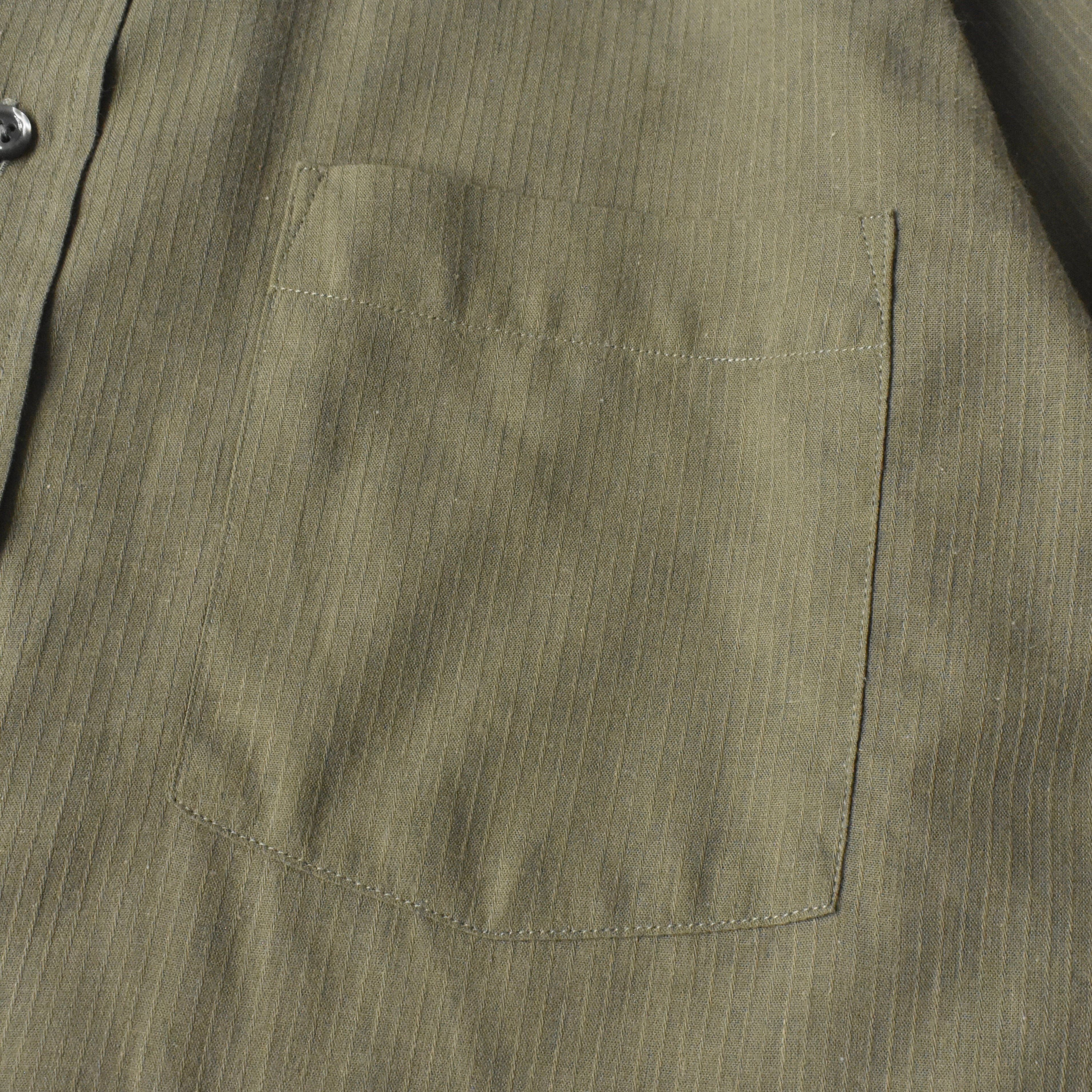 繊細に浮かび上がる織り柄のストライプと、淡く上品なカーキグリーンの色味が魅力的な逸品。ドレススタイルは勿論、カジュアルな羽織としても活躍が期待できる1着です。