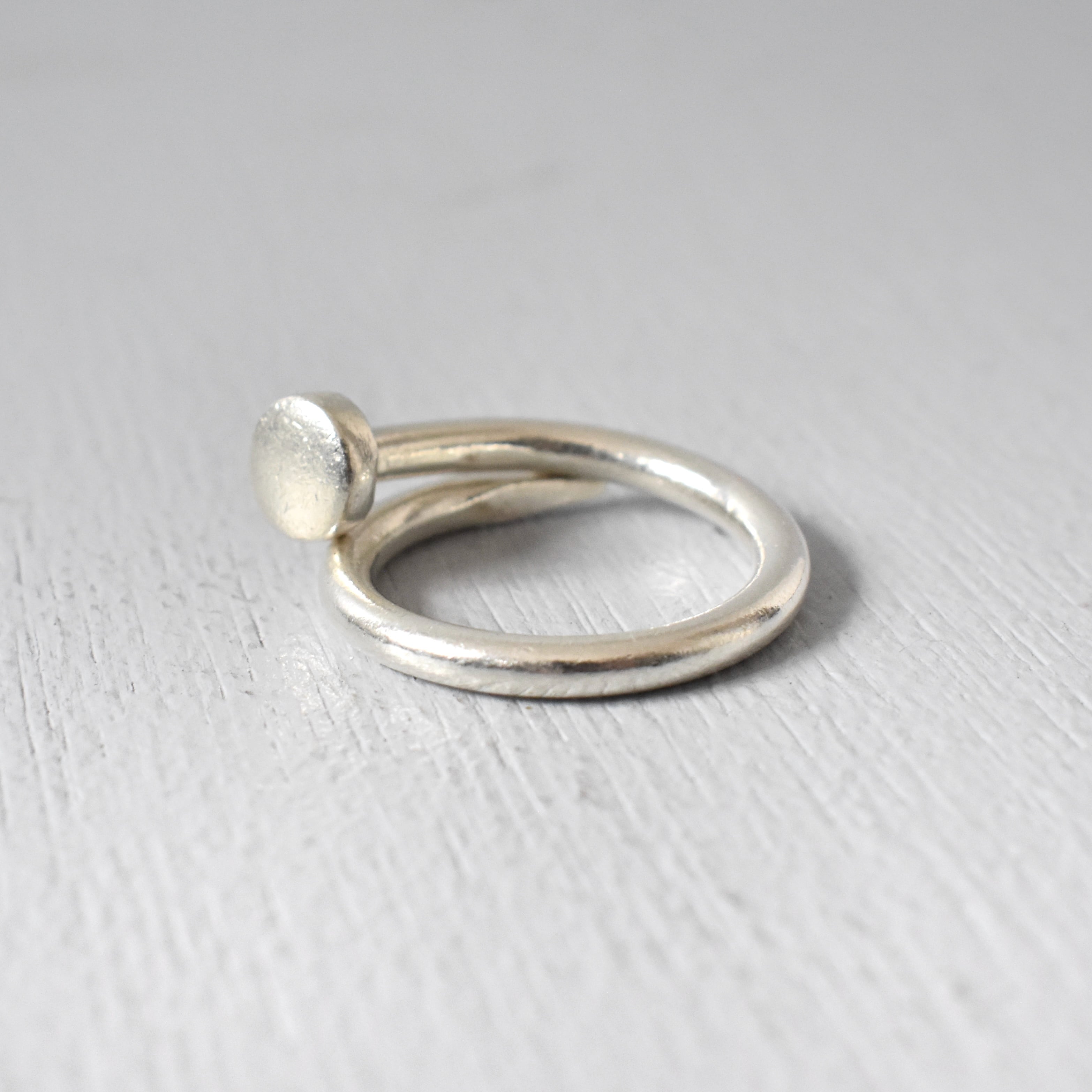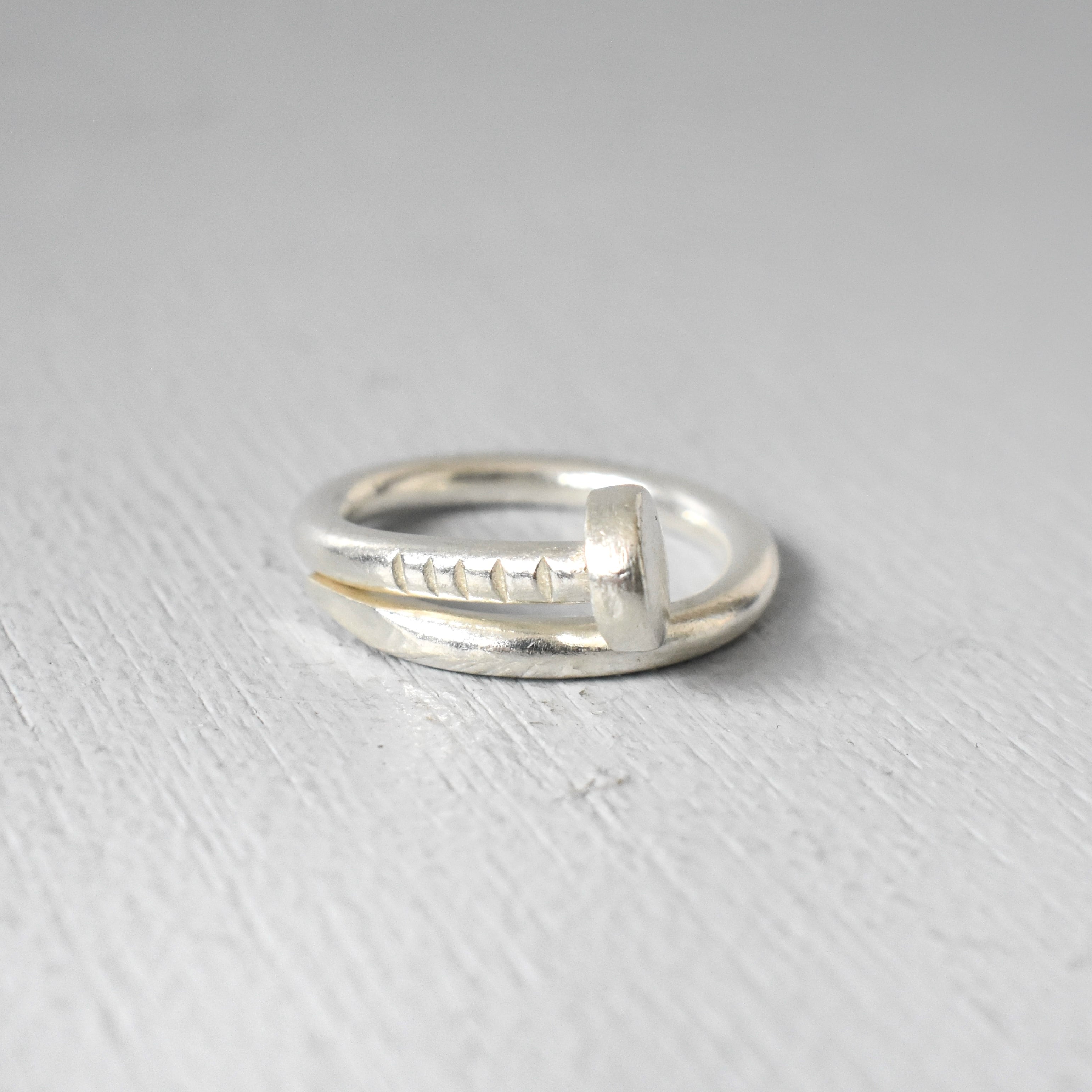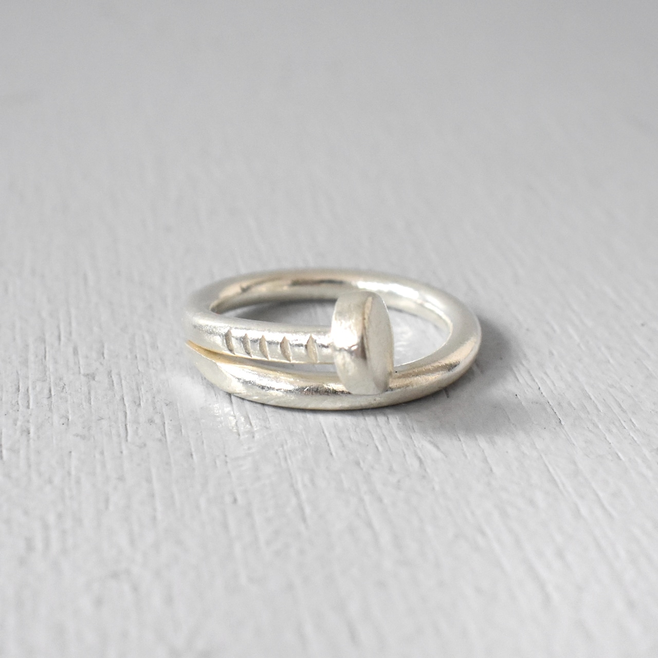 一本釘を指に沿わせて曲げた様な無骨なデザインの逸品。