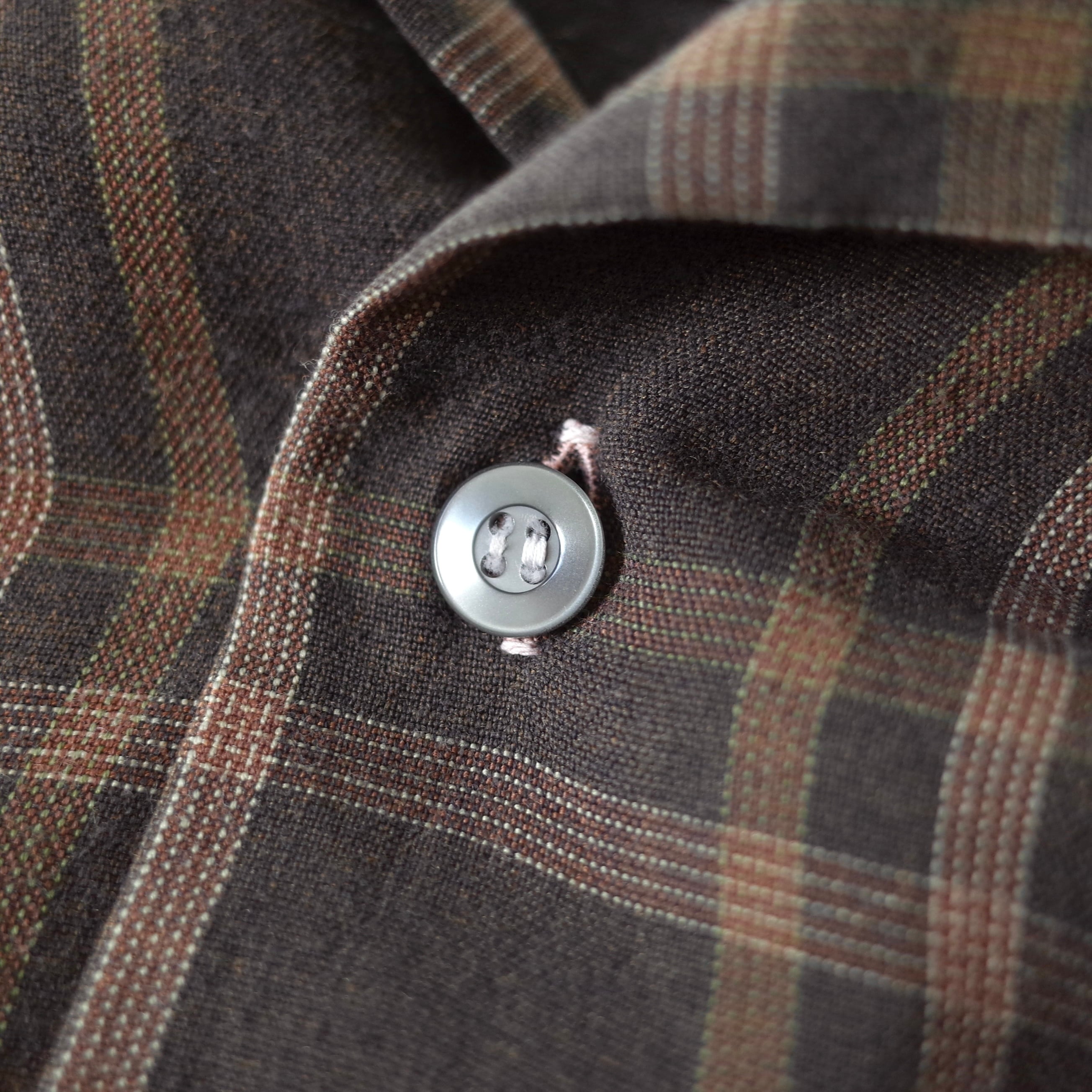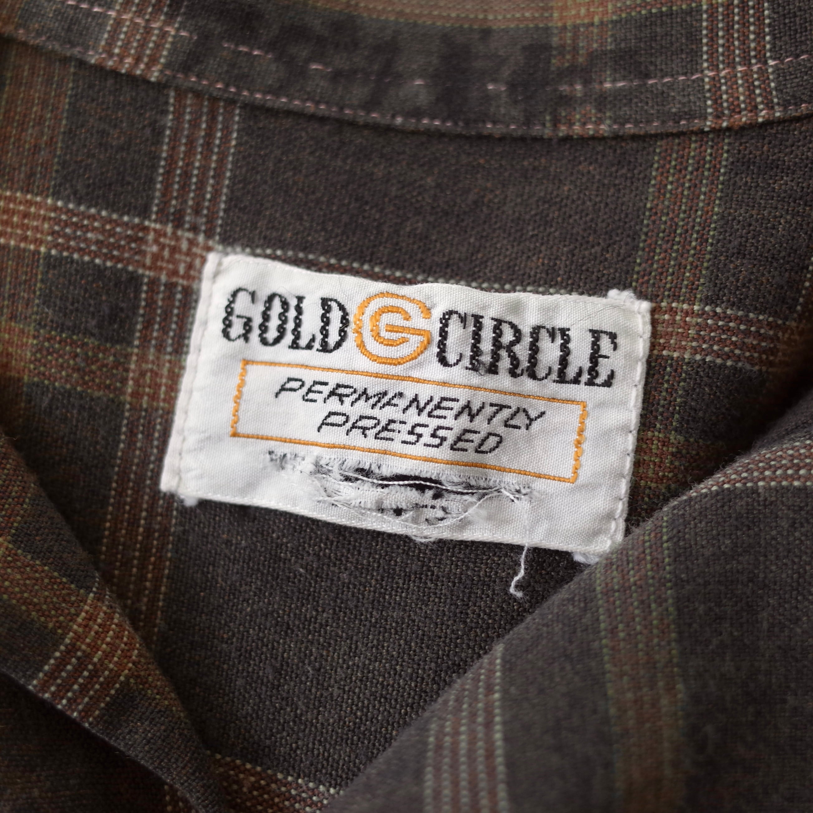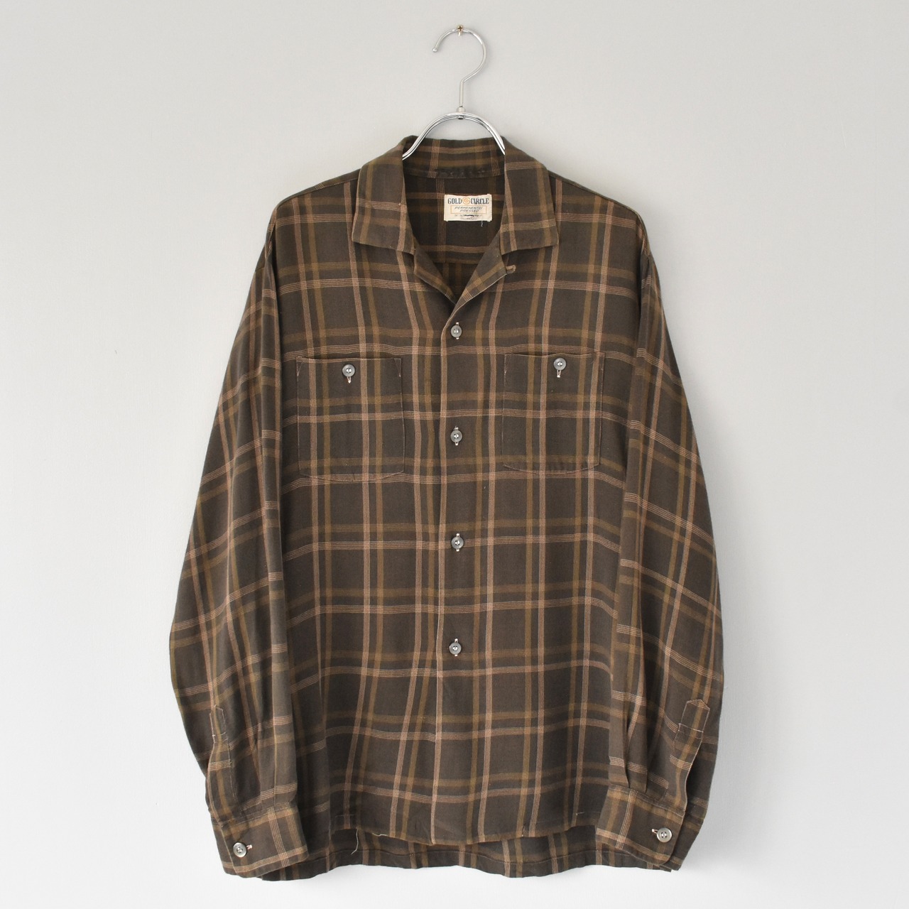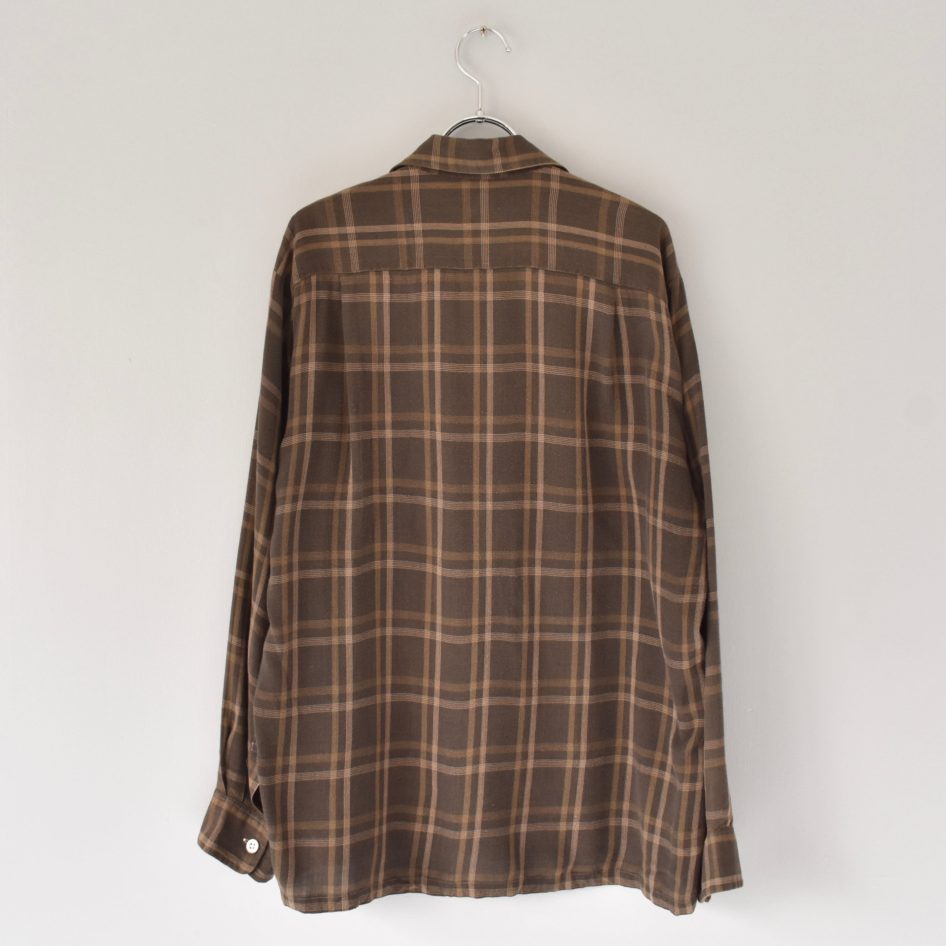 ブラウンを基調とした渋めでレトロな配色のチェック柄。"GOLD CIRCLE"による1960's~のレーヨン地シャツ。