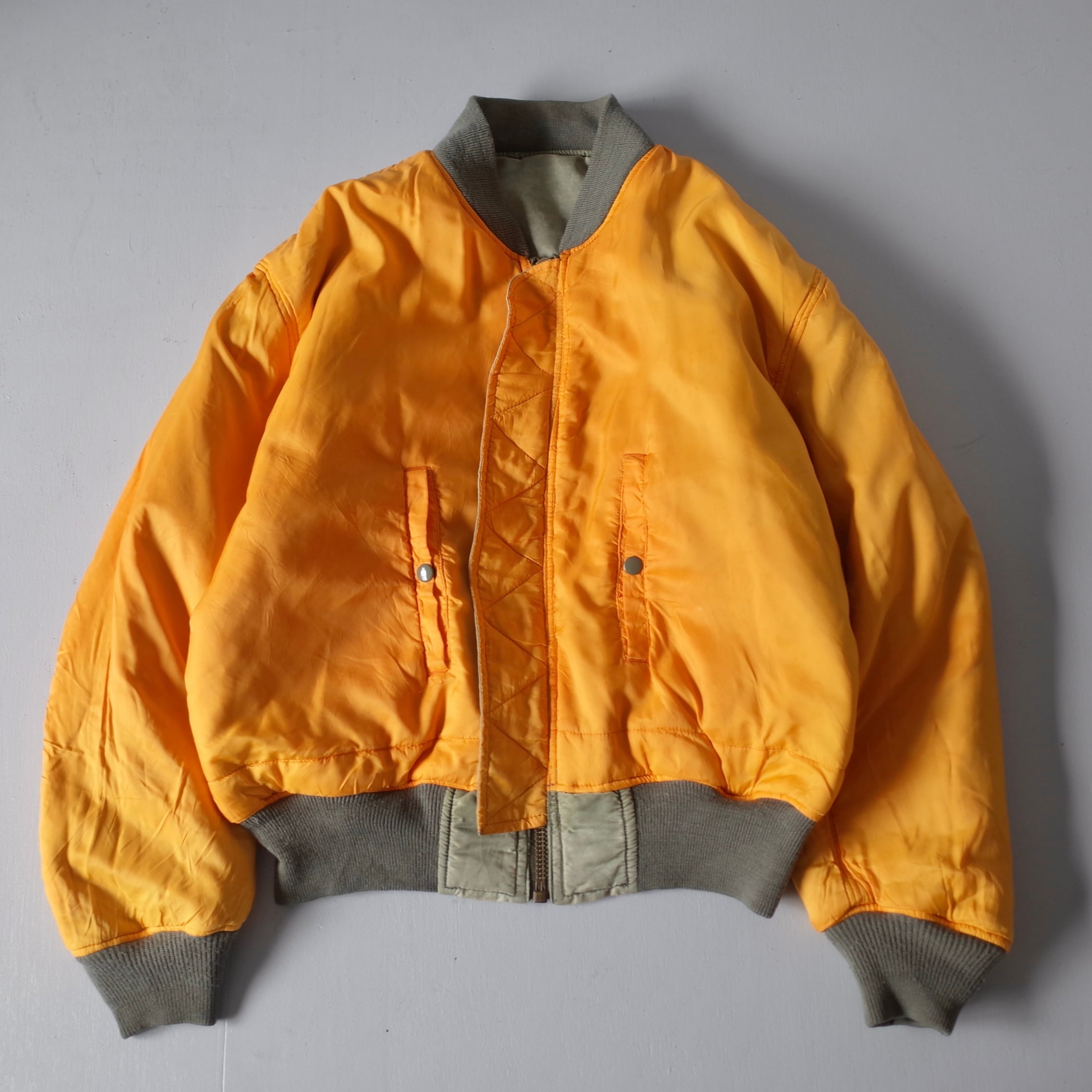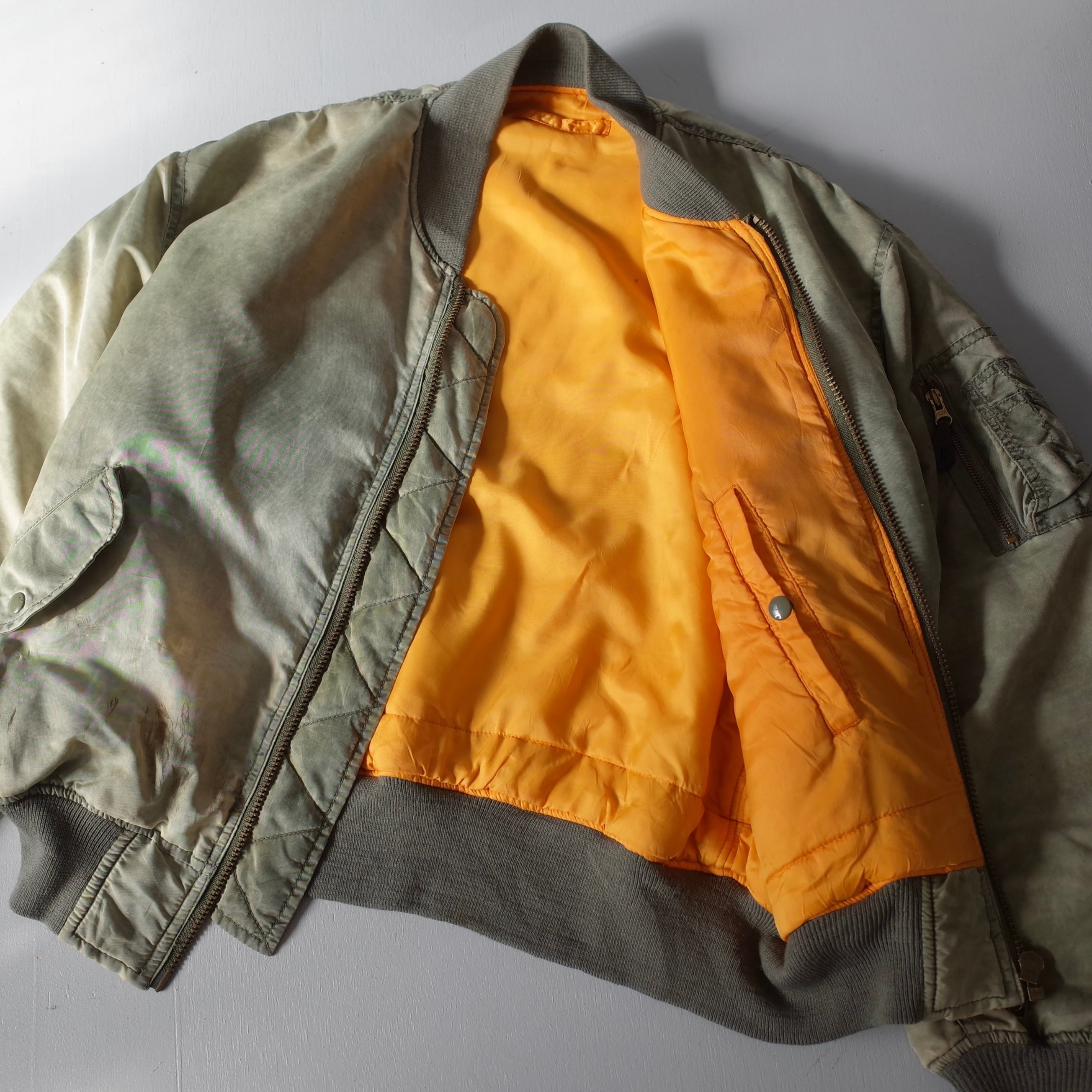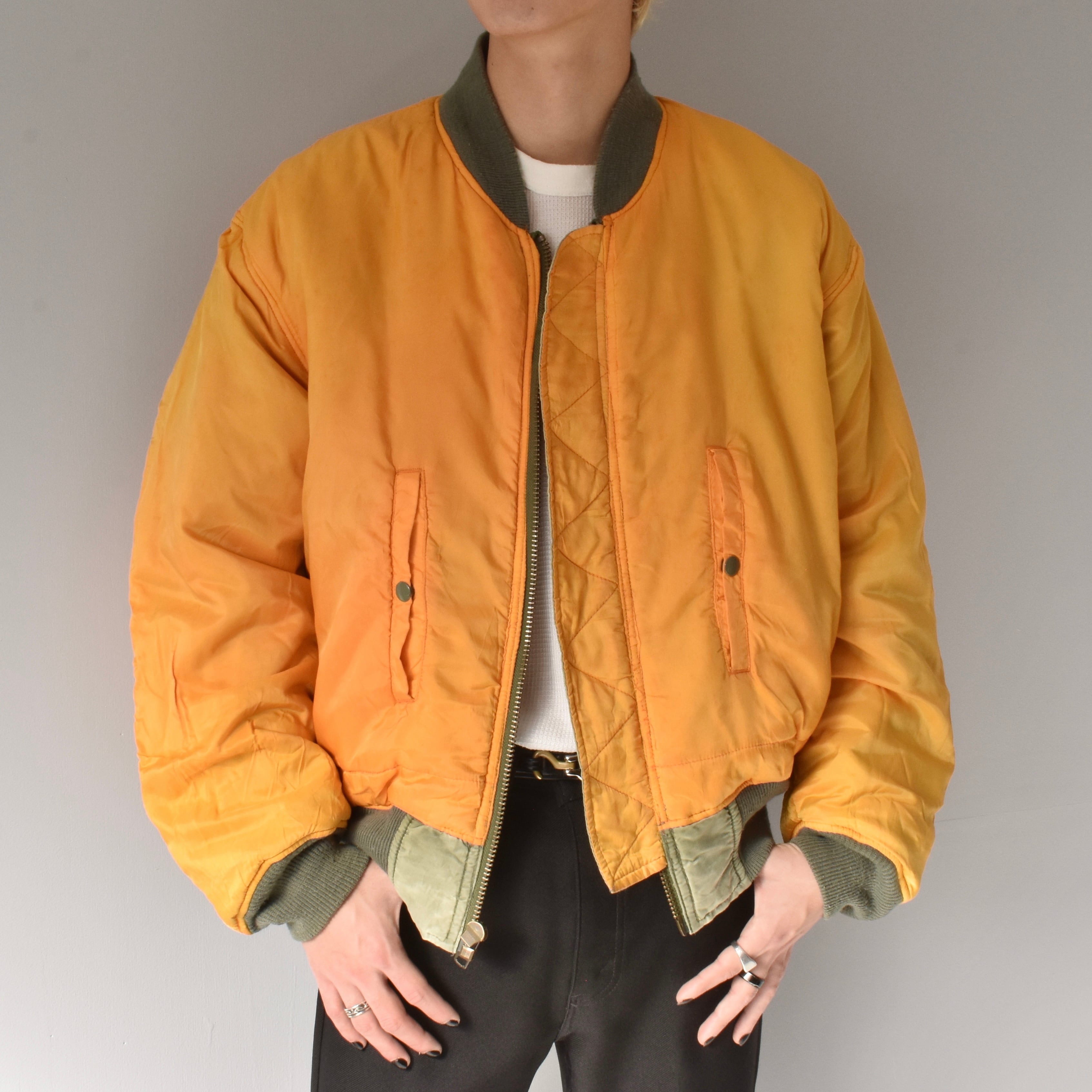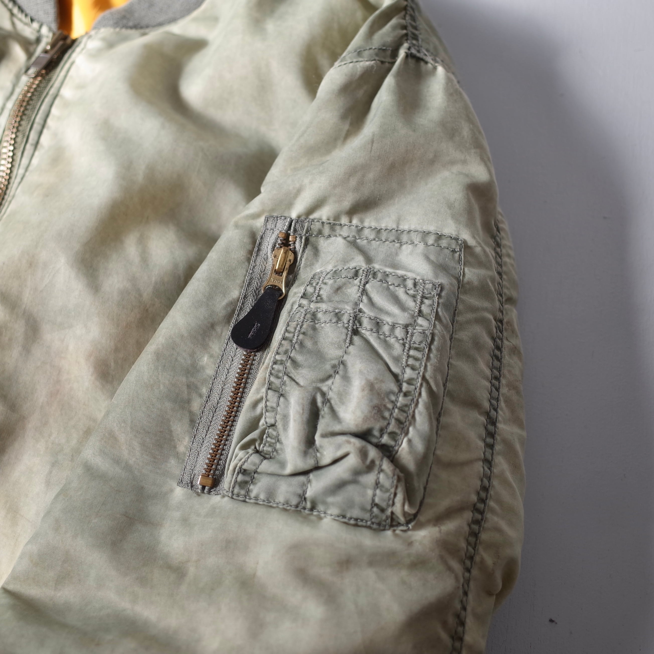素晴らしい経年変化の民間品MA-1。米軍実物を踏襲したリバーシブルデザインでMA-1には欠かせないシガレットポケットを装備した逸品。カラカラに乾いているフェードカラーの表情がたまりません。