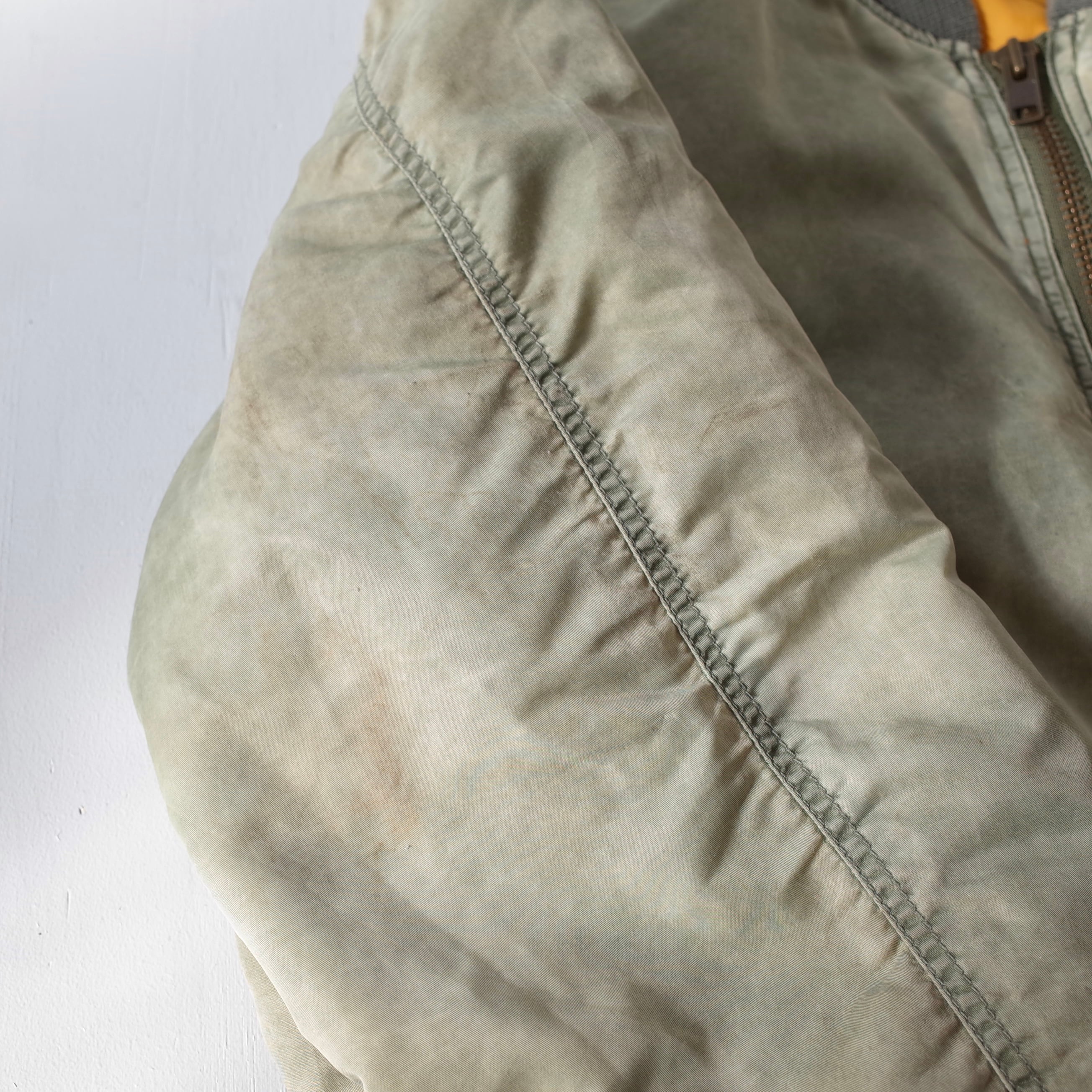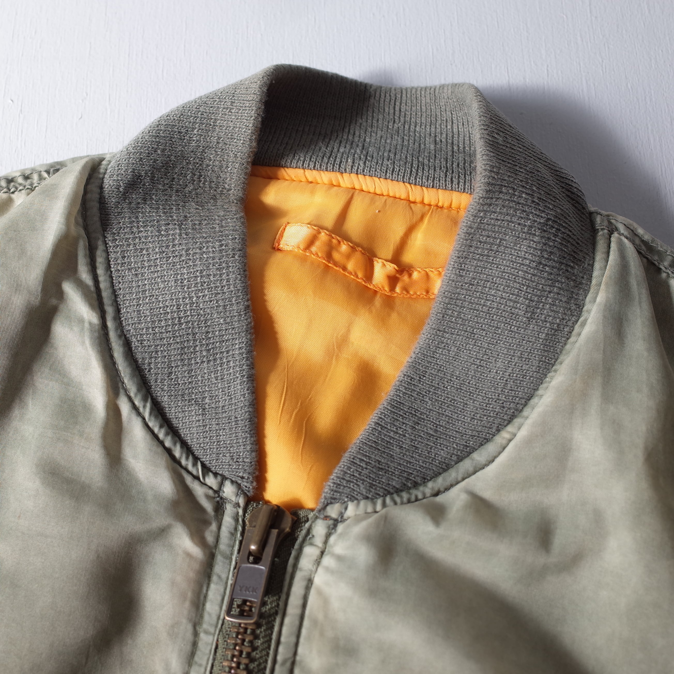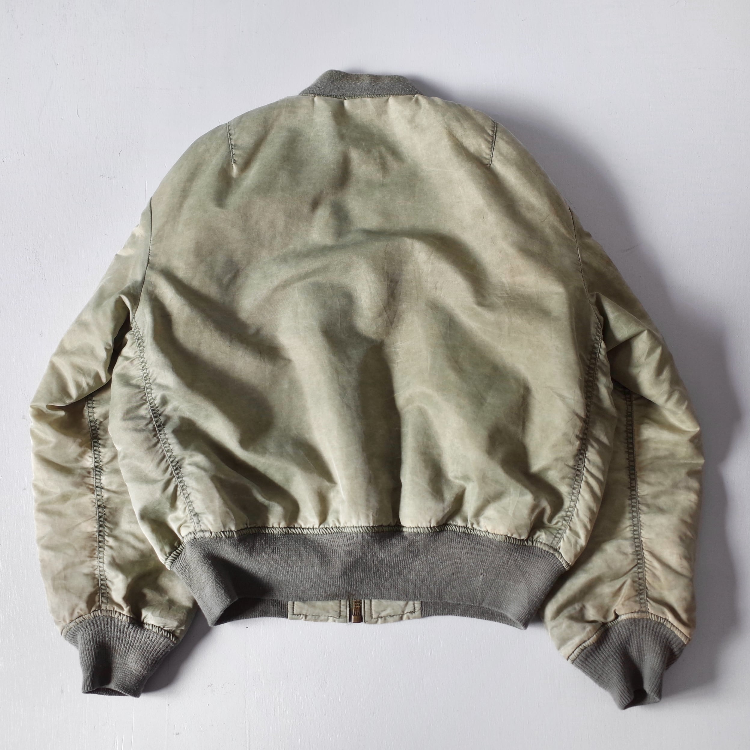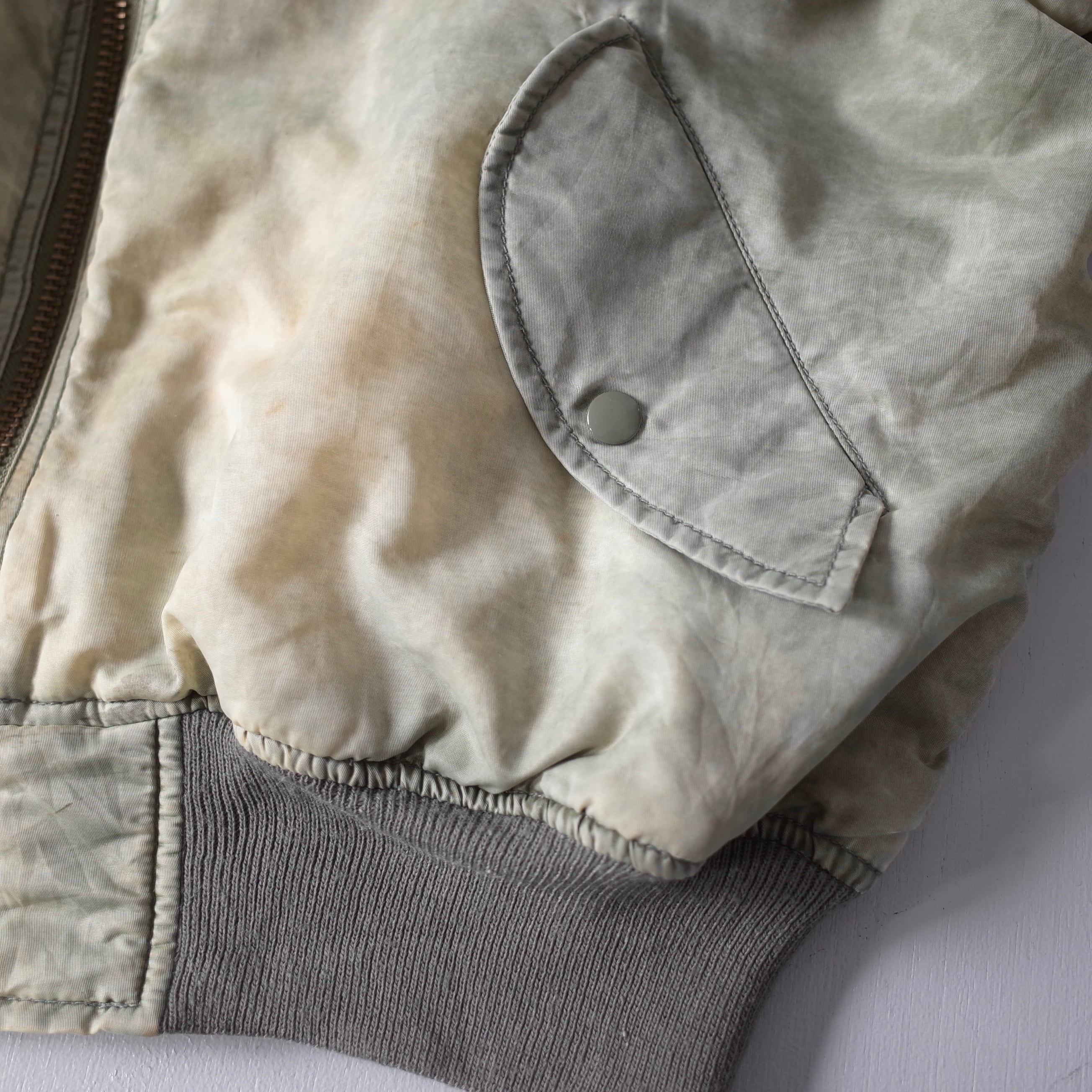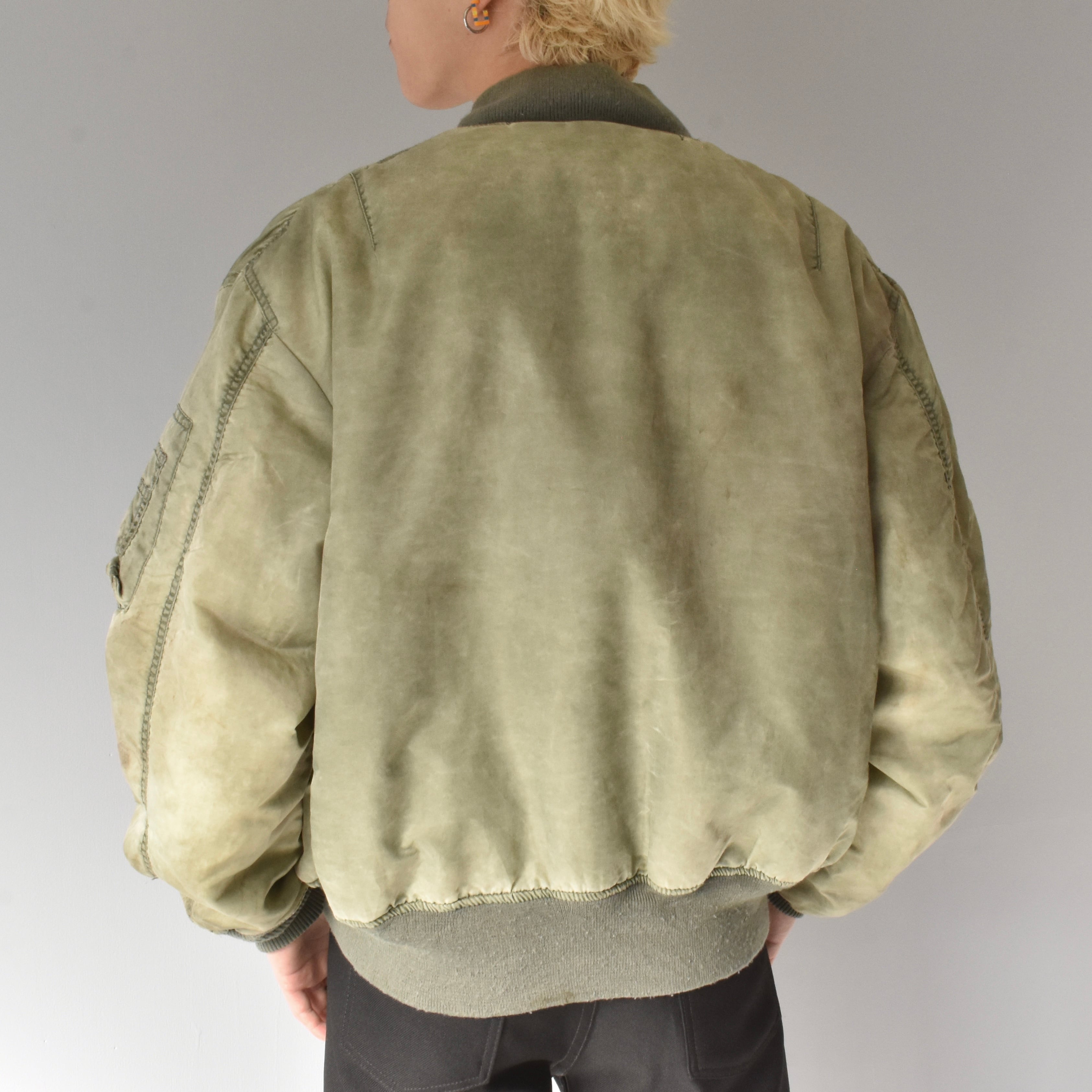 素晴らしい経年変化の民間品MA-1。米軍実物を踏襲したリバーシブルデザインでMA-1には欠かせないシガレットポケットを装備した逸品。カラカラに乾いているフェードカラーの表情がたまりません。