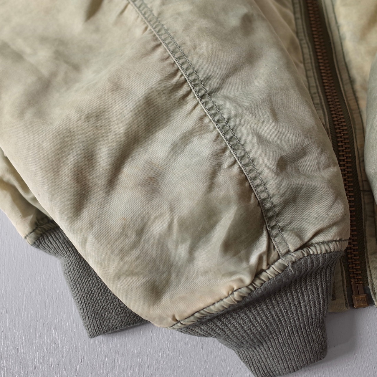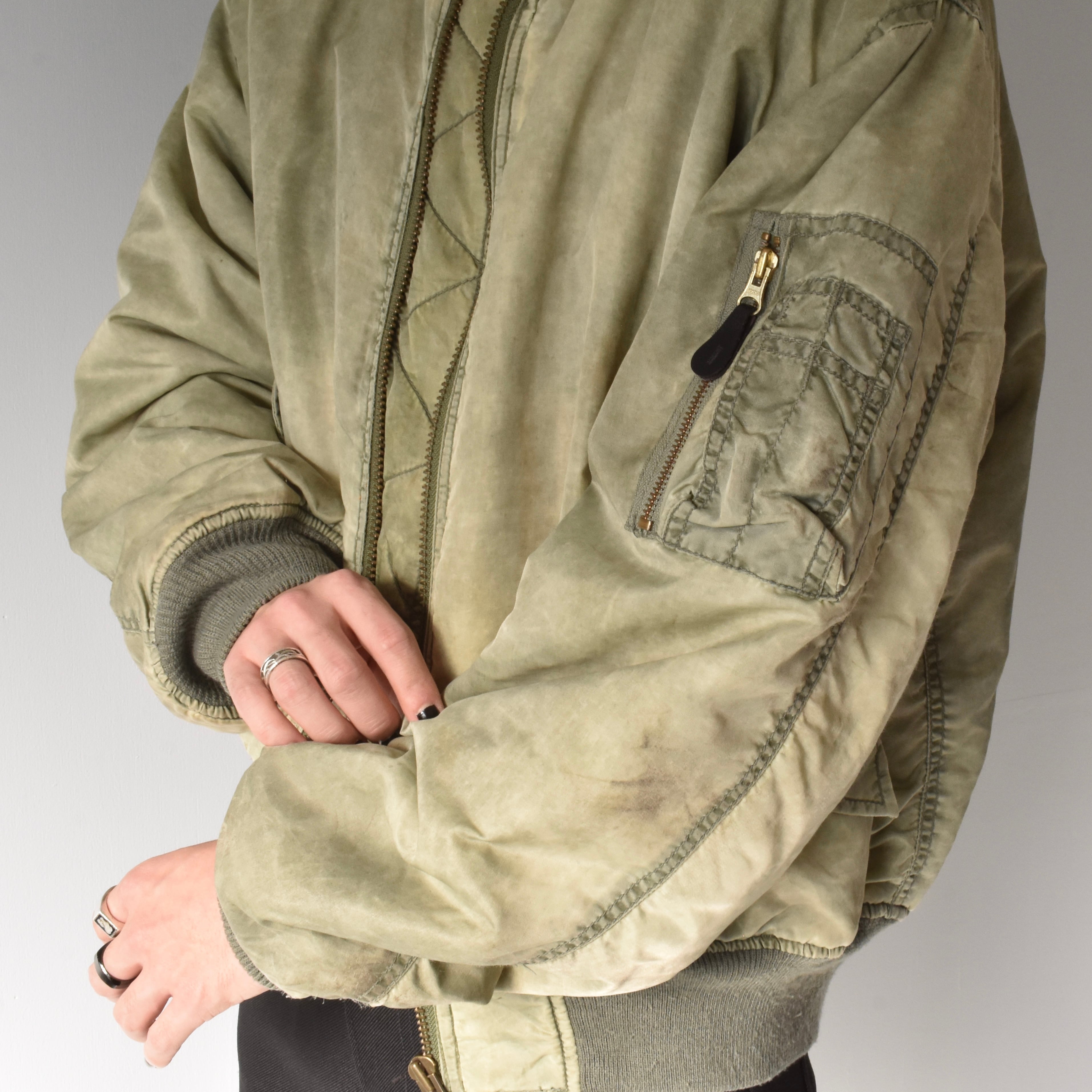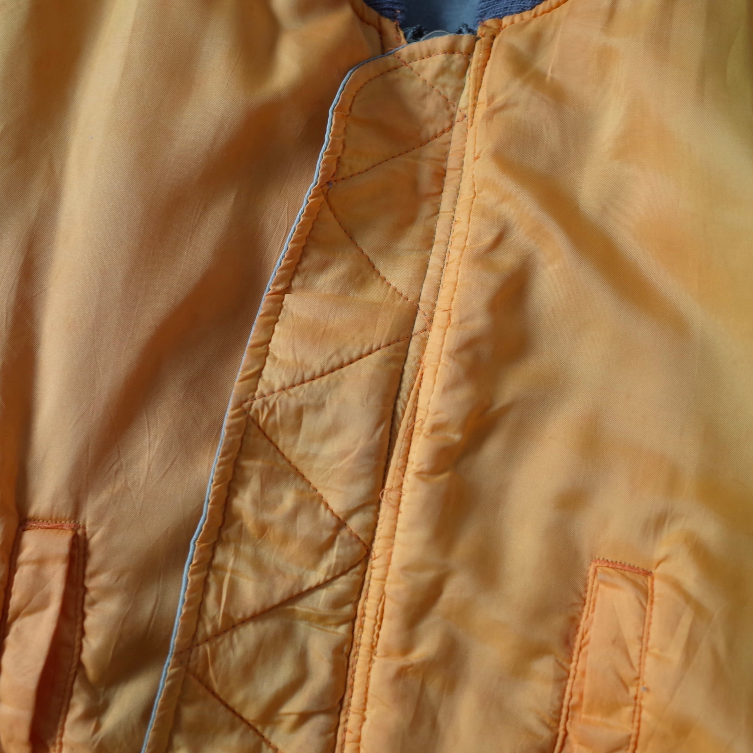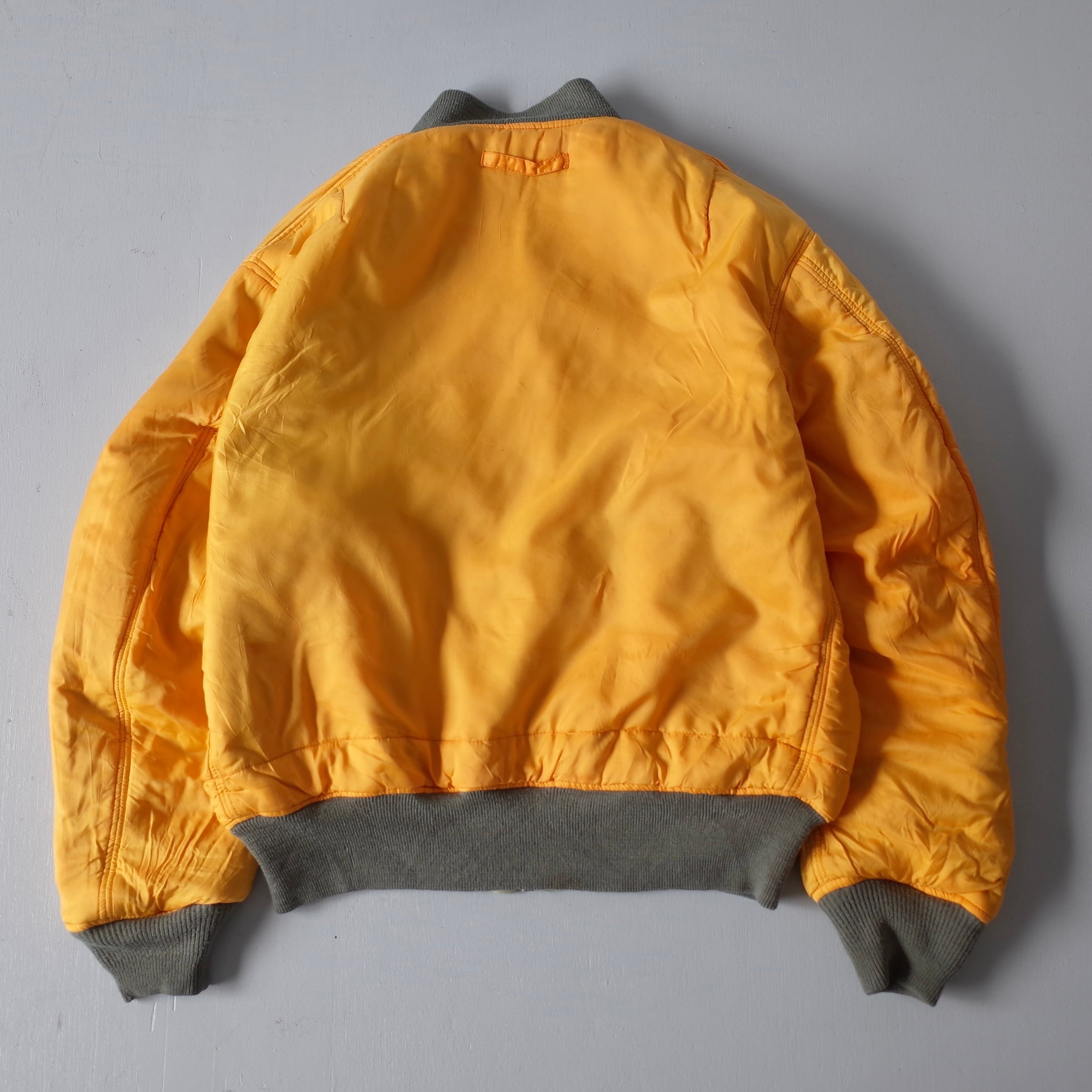 素晴らしい経年変化の民間品MA-1。米軍実物を踏襲したリバーシブルデザインでMA-1には欠かせないシガレットポケットを装備した逸品。カラカラに乾いているフェードカラーの表情がたまりません。