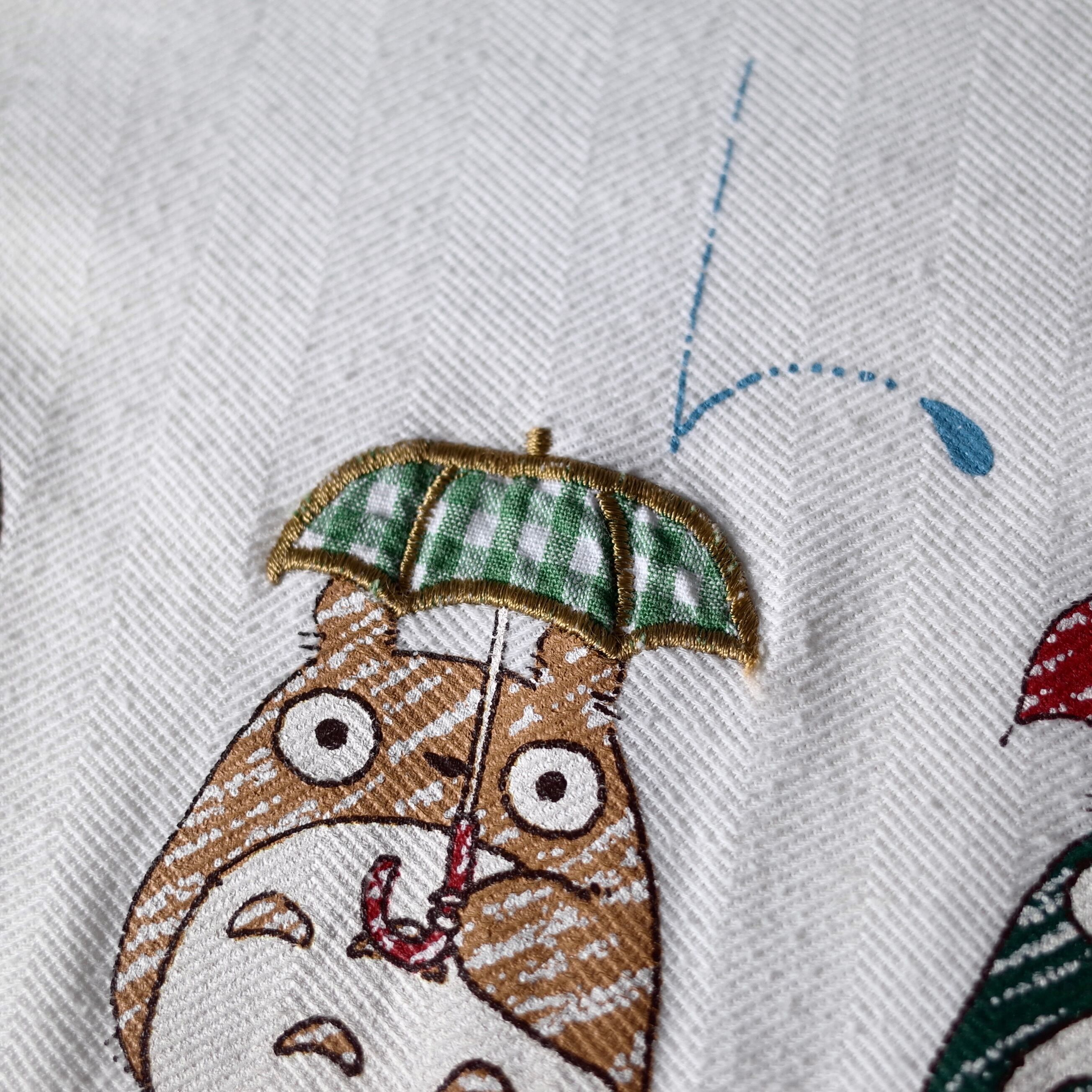 3匹の横並びしたトトロが塗り絵の様に彩られた温かみの