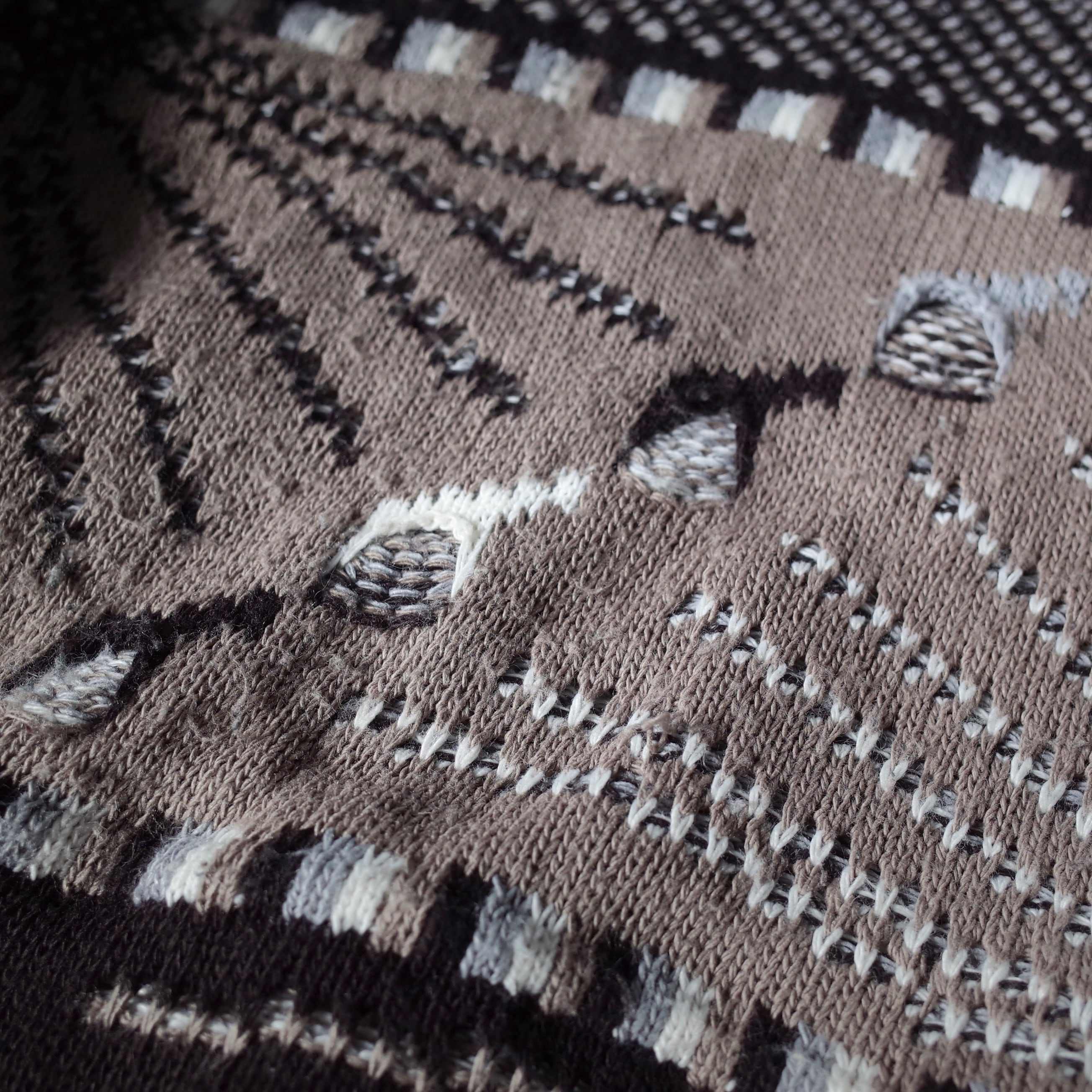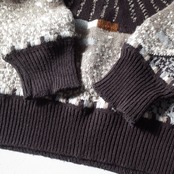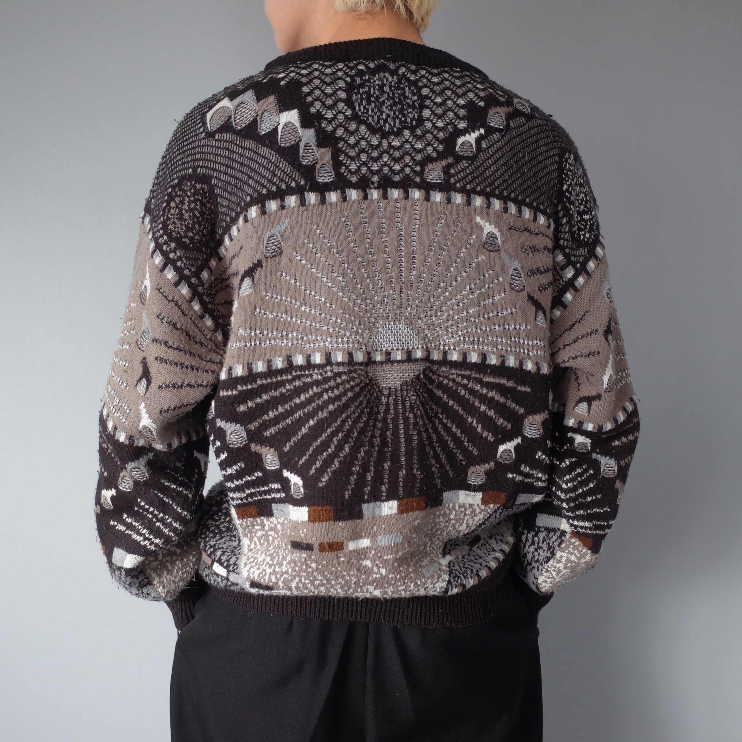 特徴のある宗教的モードな柄使いの総柄ニット。米国製の