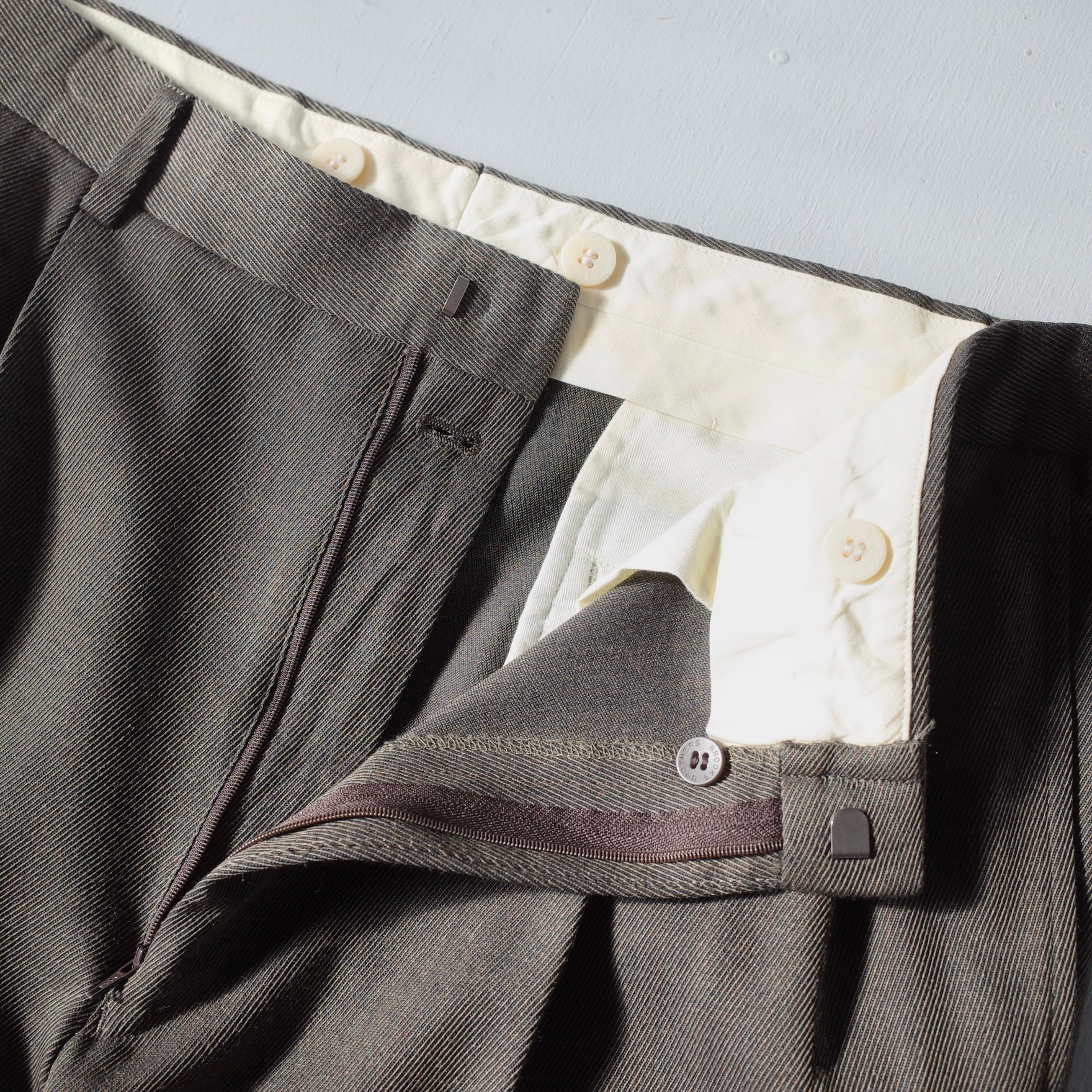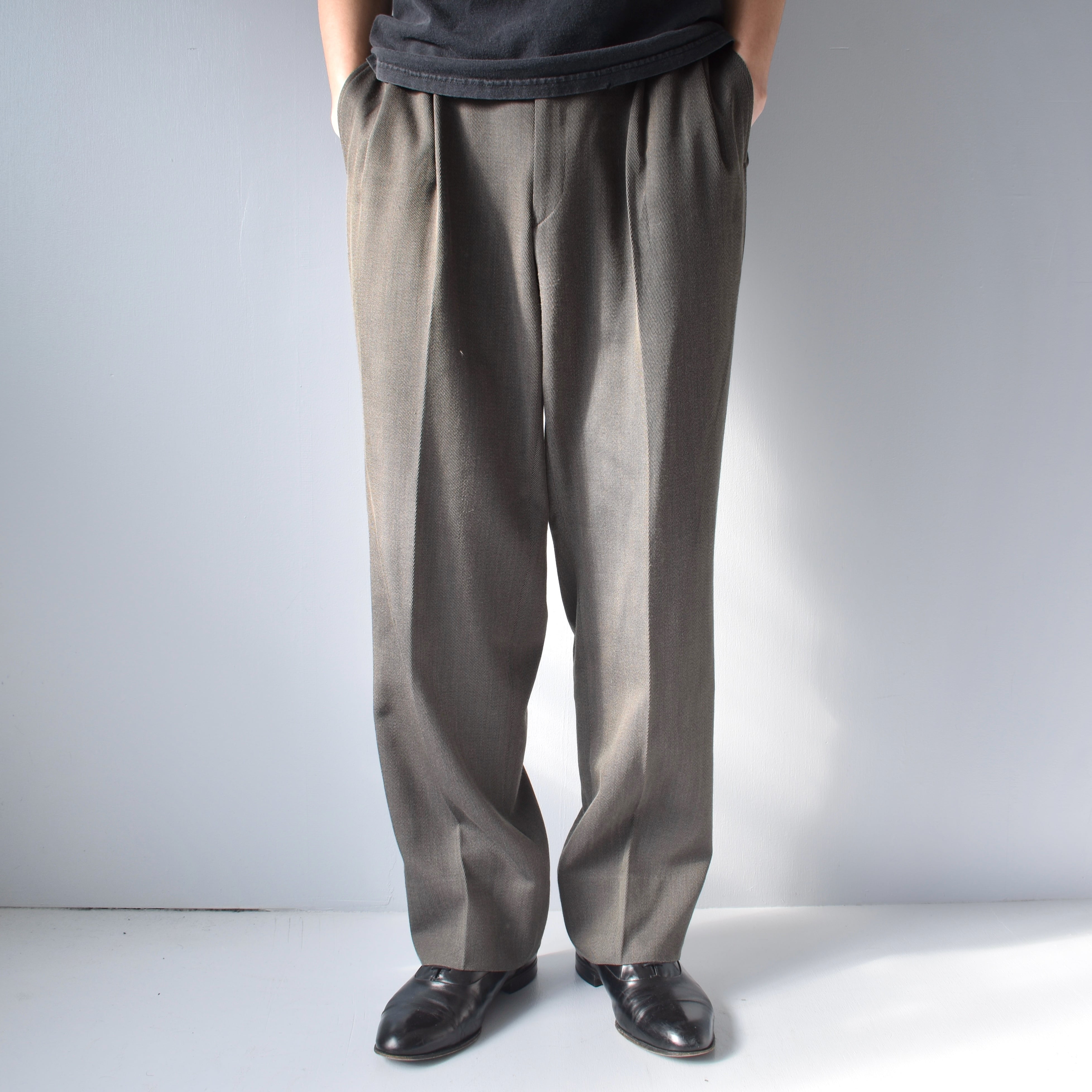 雰囲気あるカーキがかった灰色が装いの完成度をより一層