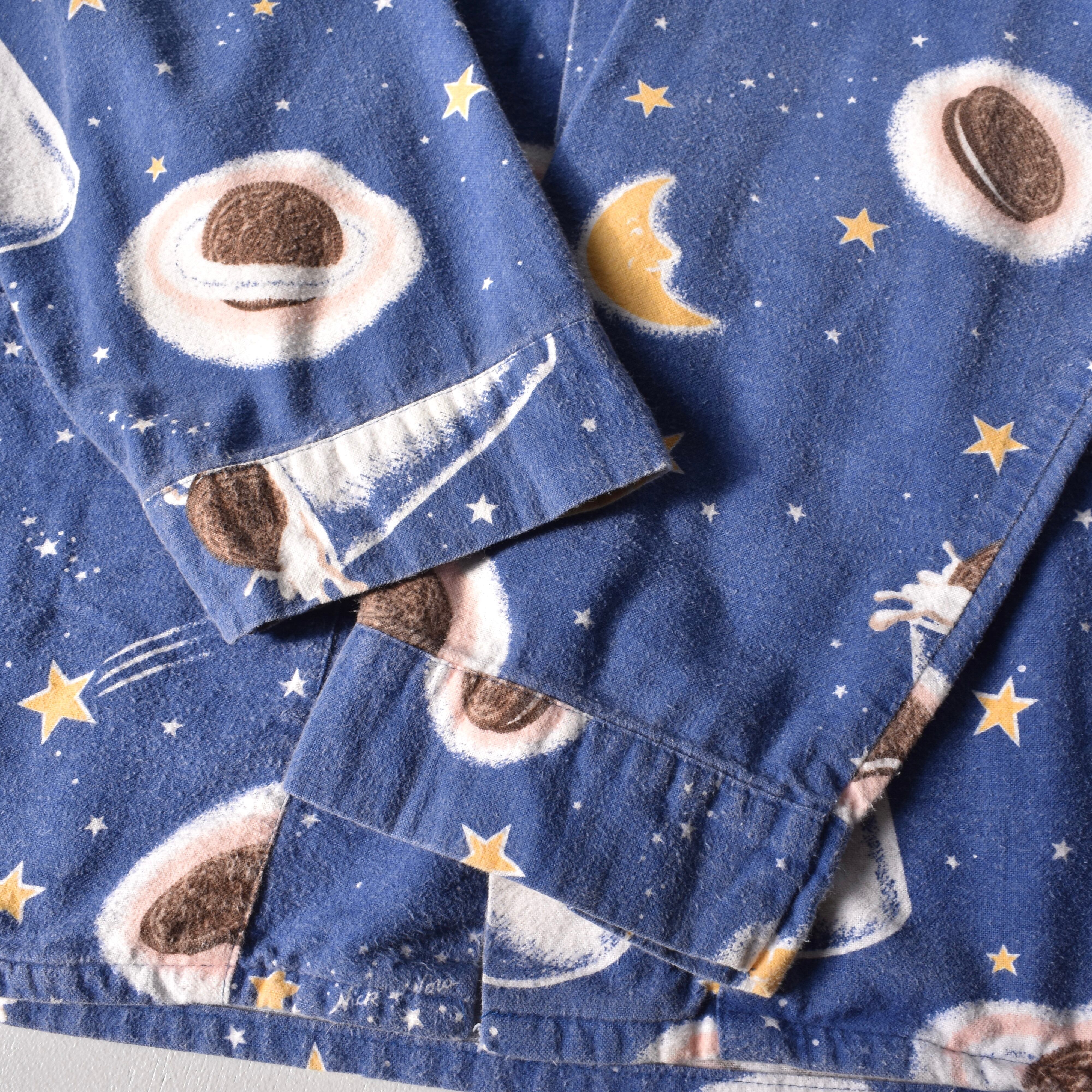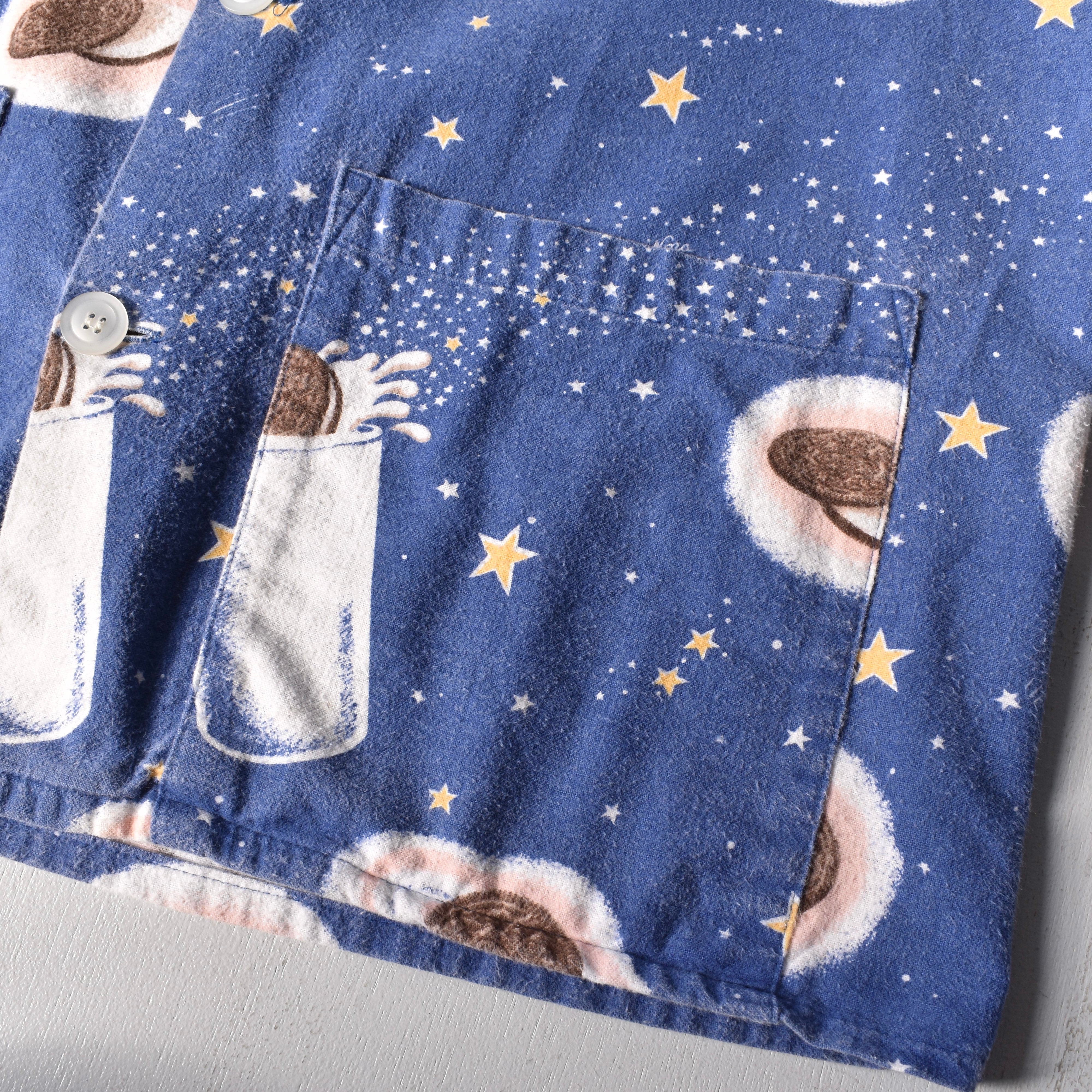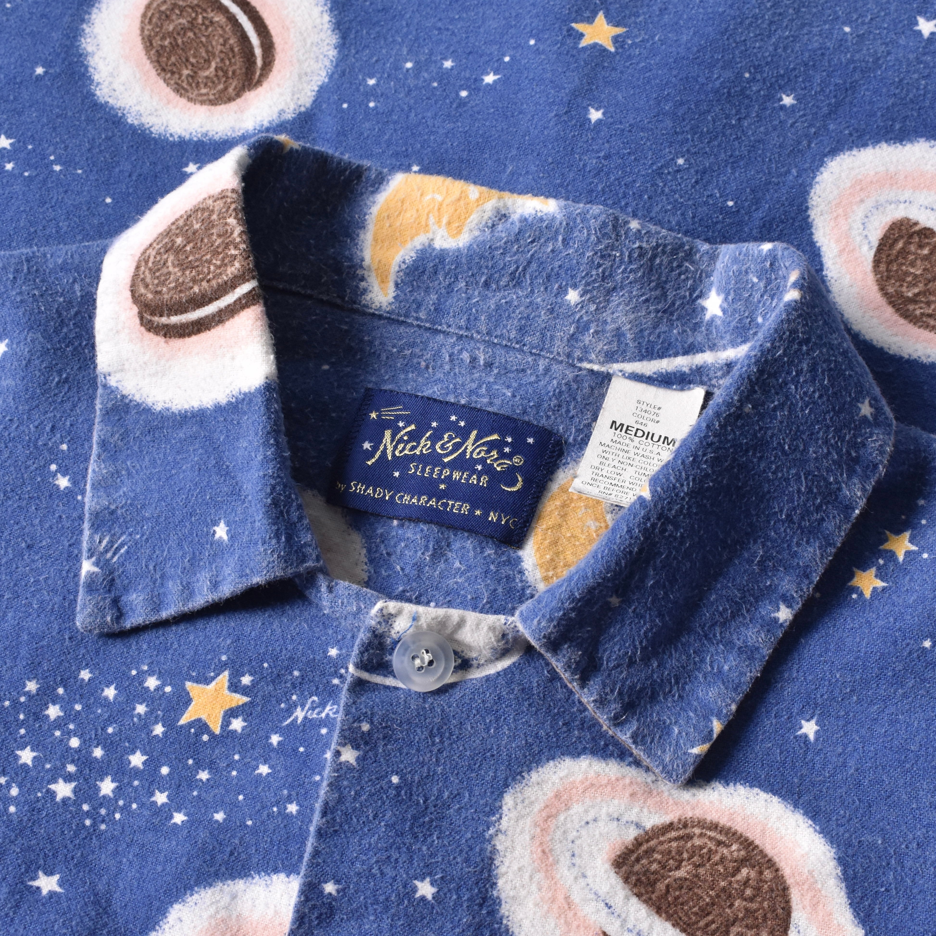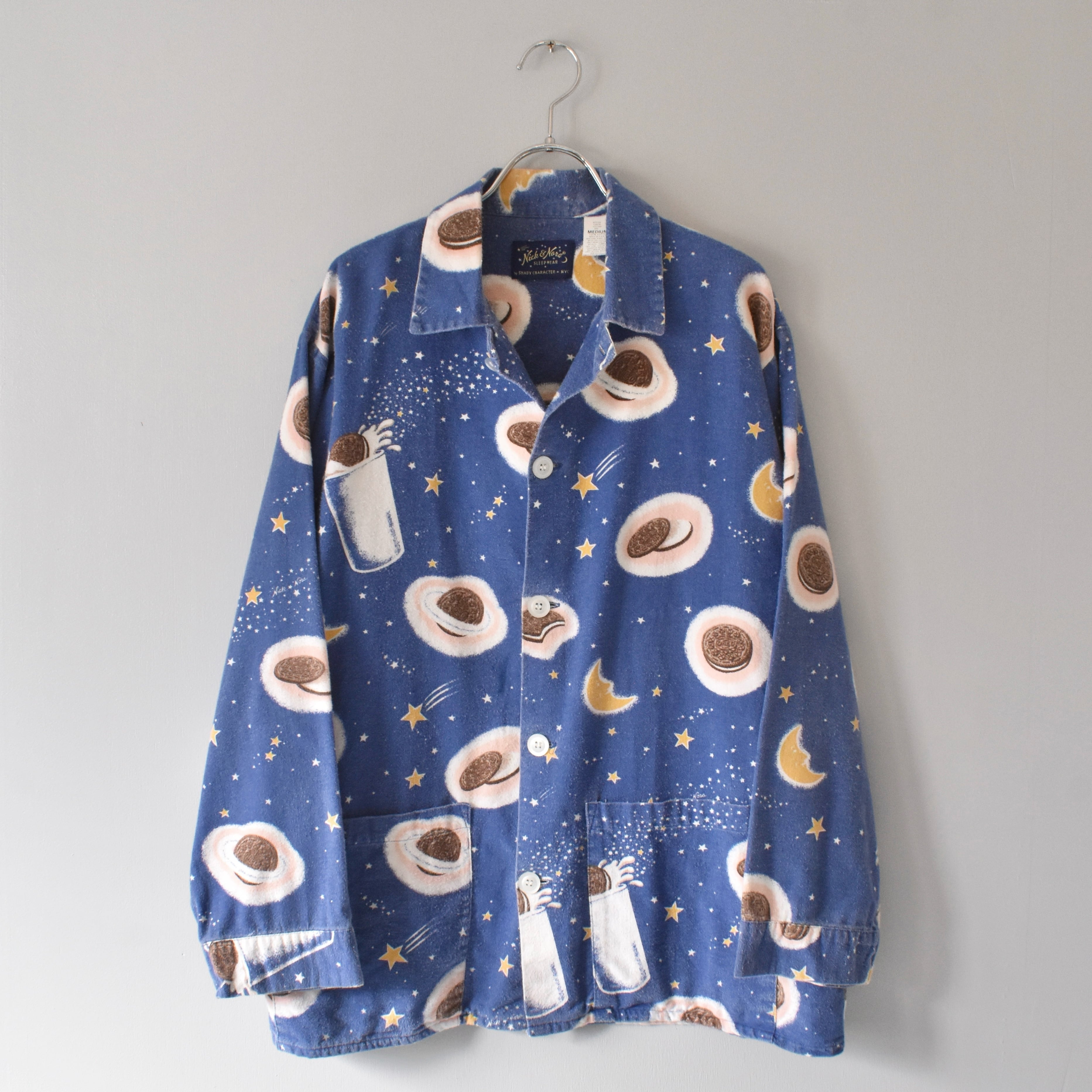 "Nirvana"の"Kurt Cobain"が着用していたことで著名な米国ナイトウェアブランドの"Nick&Nora"より、星空に浮かぶクッキーとミルクが描かれた、キュートでノスタルジックな絵柄が魅力的なパジャマシャツ。