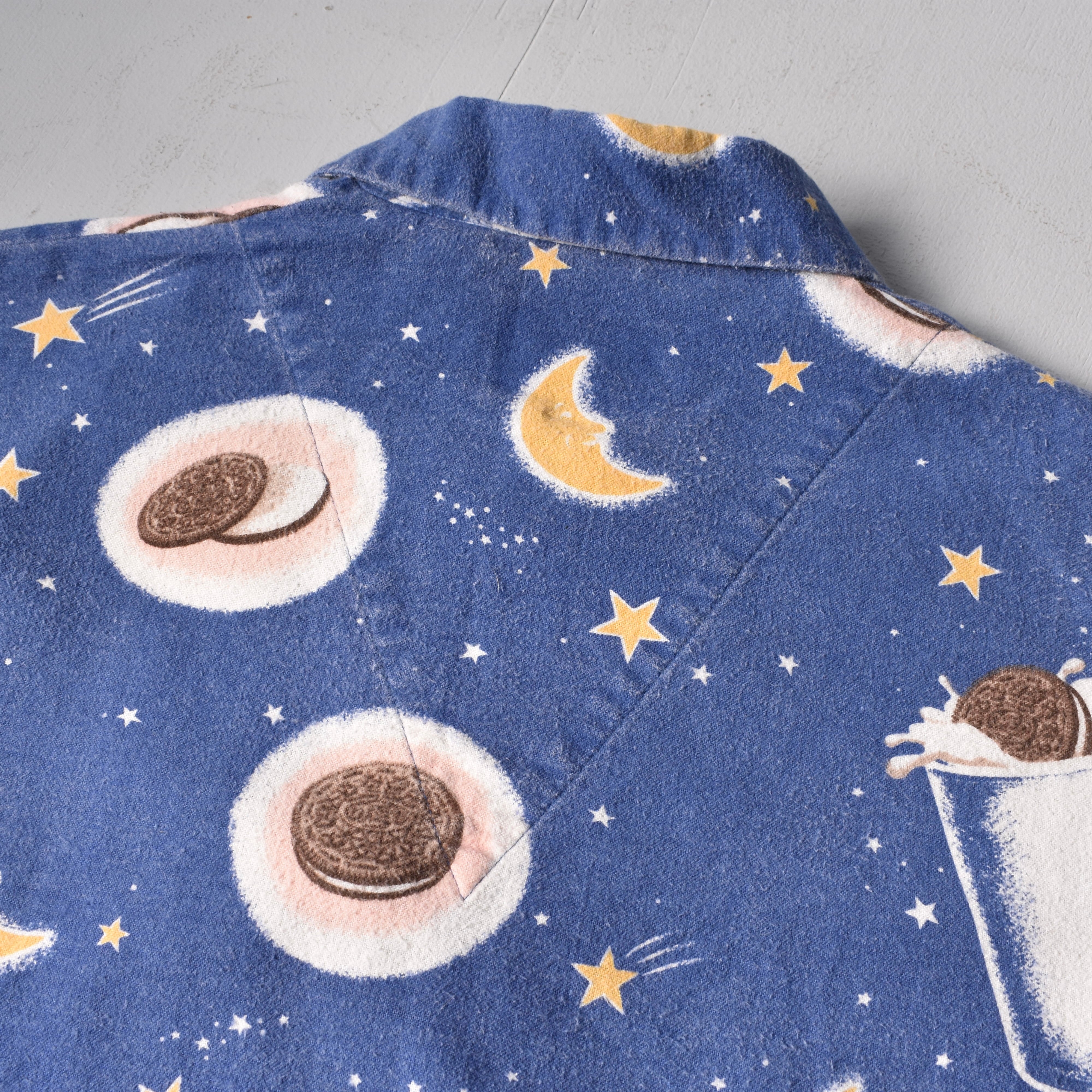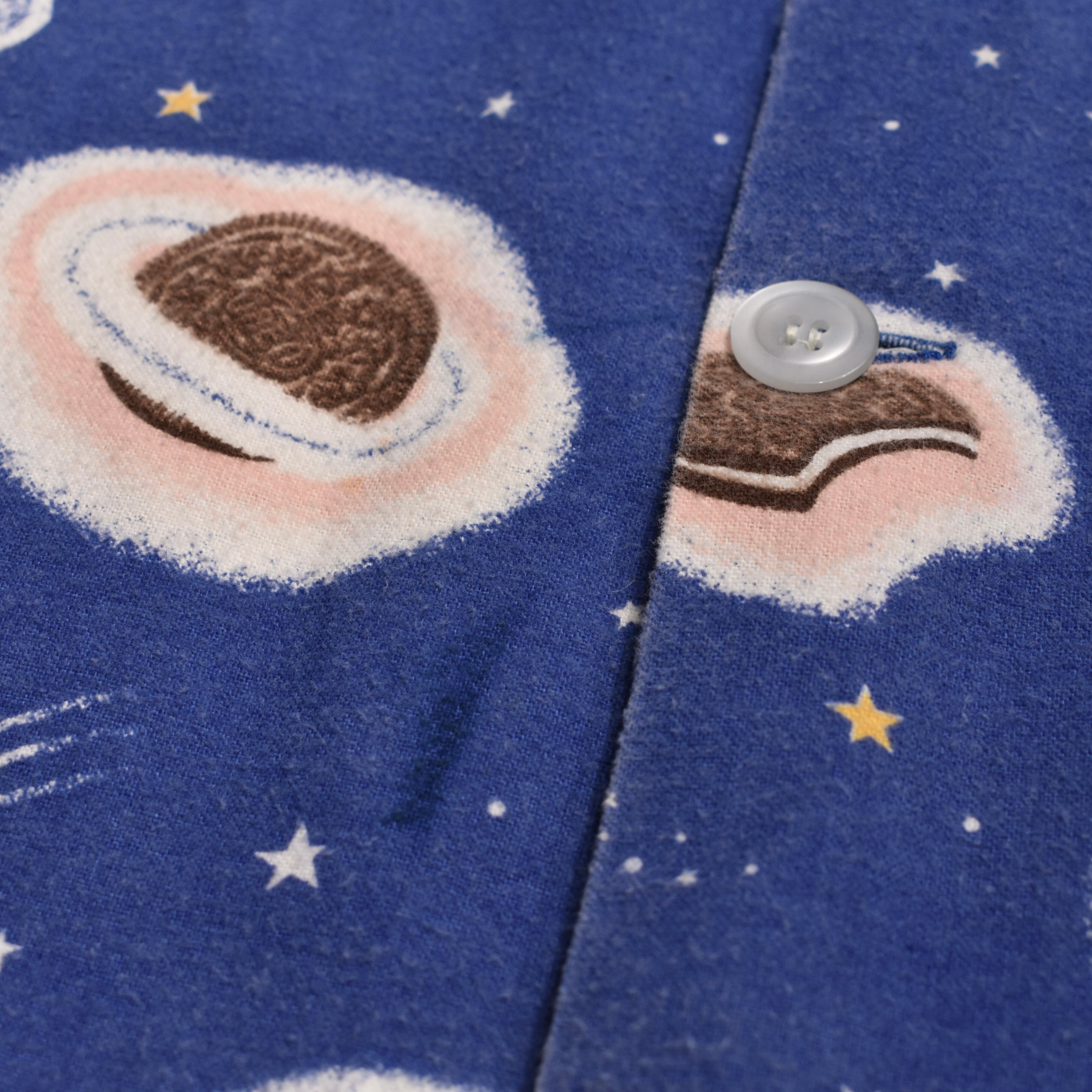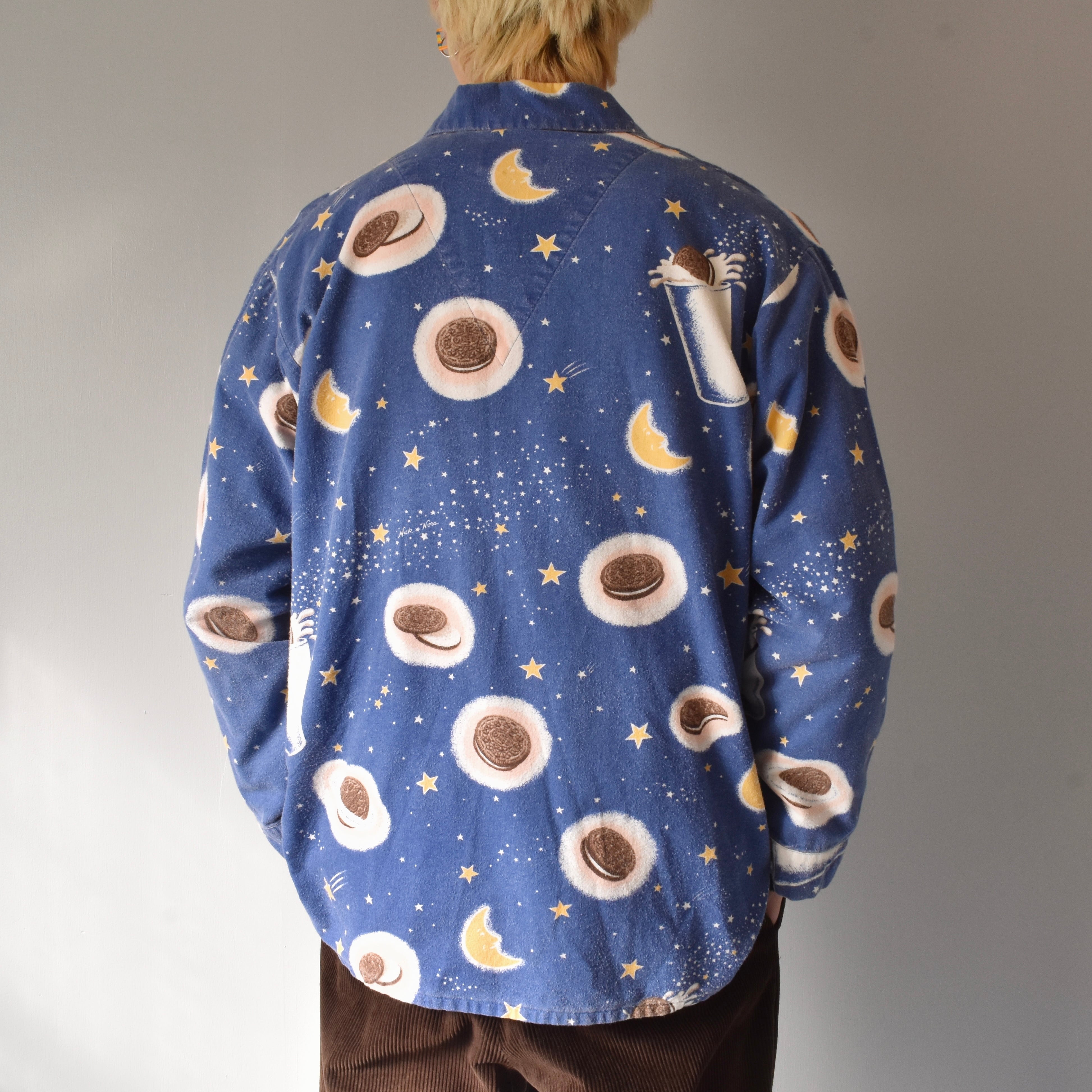"Nirvana"の"Kurt Cobain"が着用していたことで著名な米国ナイトウェアブランドの"Nick&Nora"より、星空に浮かぶクッキーとミルクが描かれた、キュートでノスタルジックな絵柄が魅力的なパジャマシャツ。