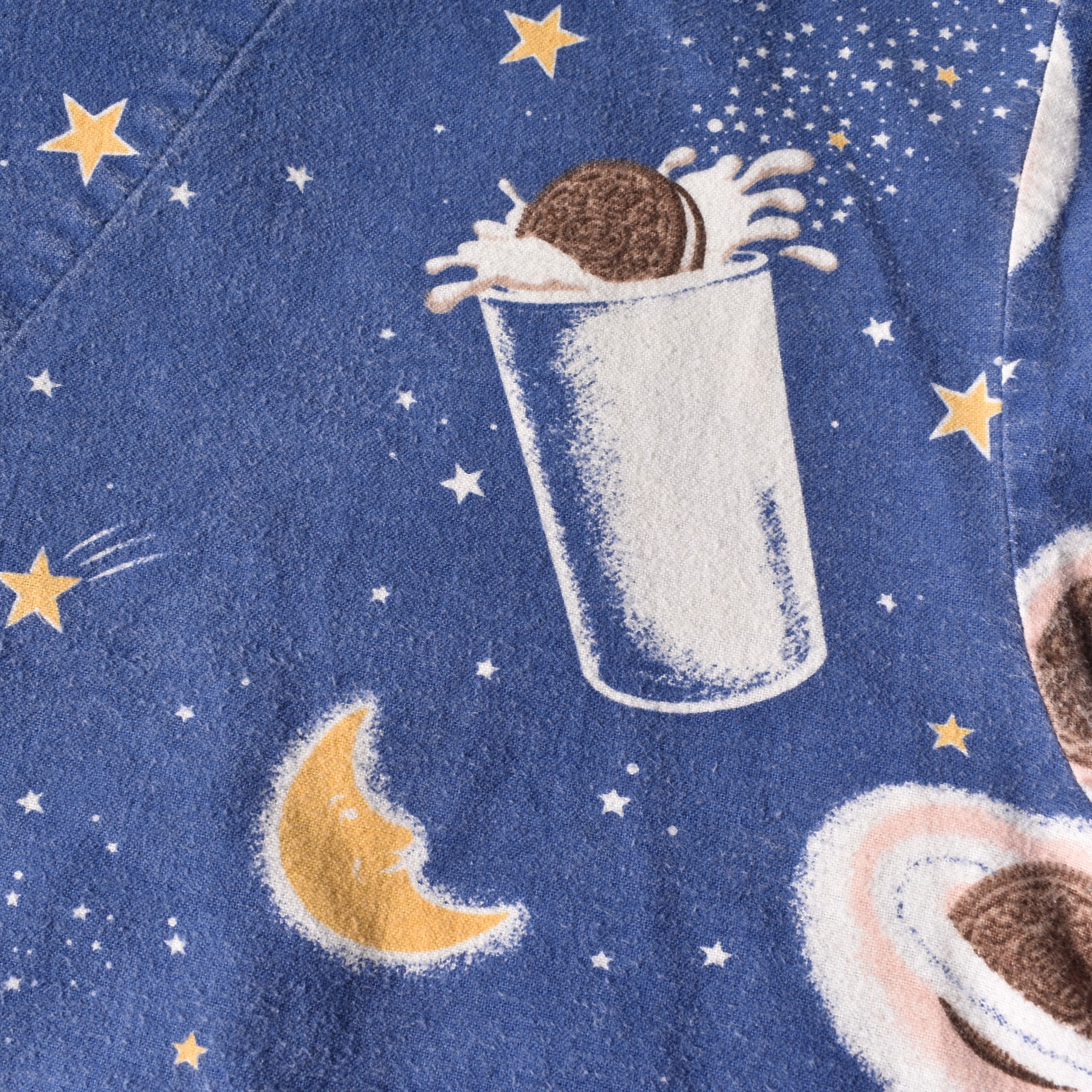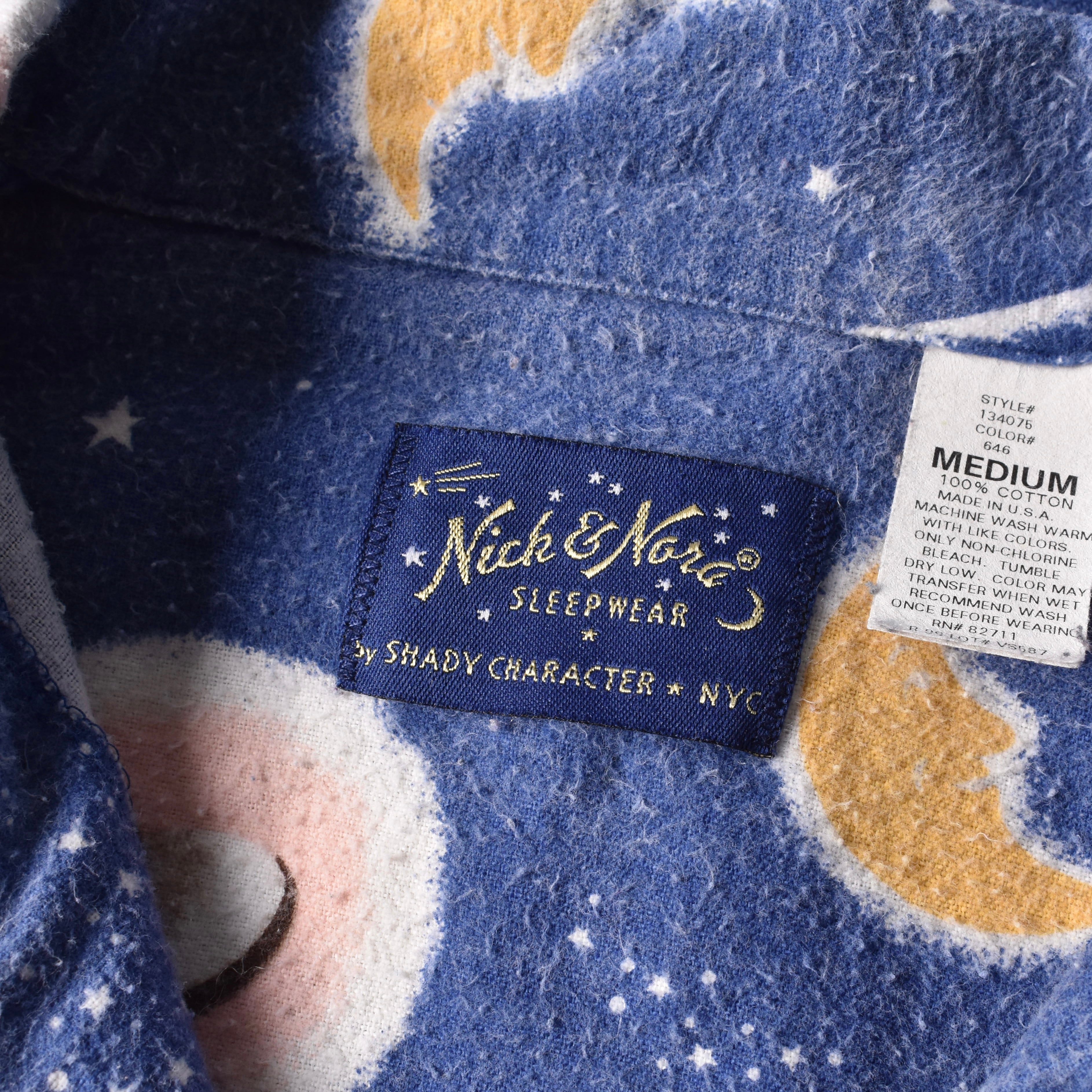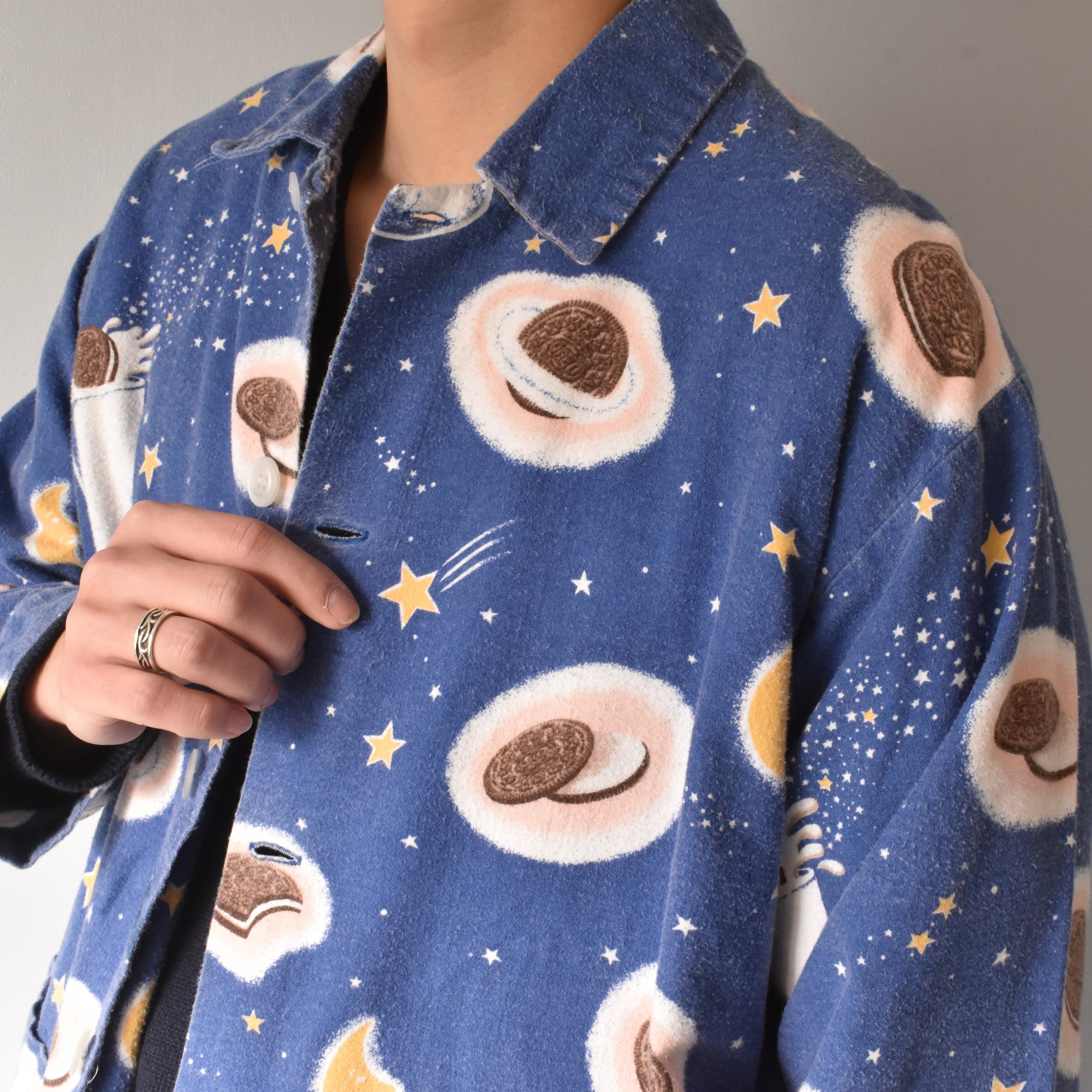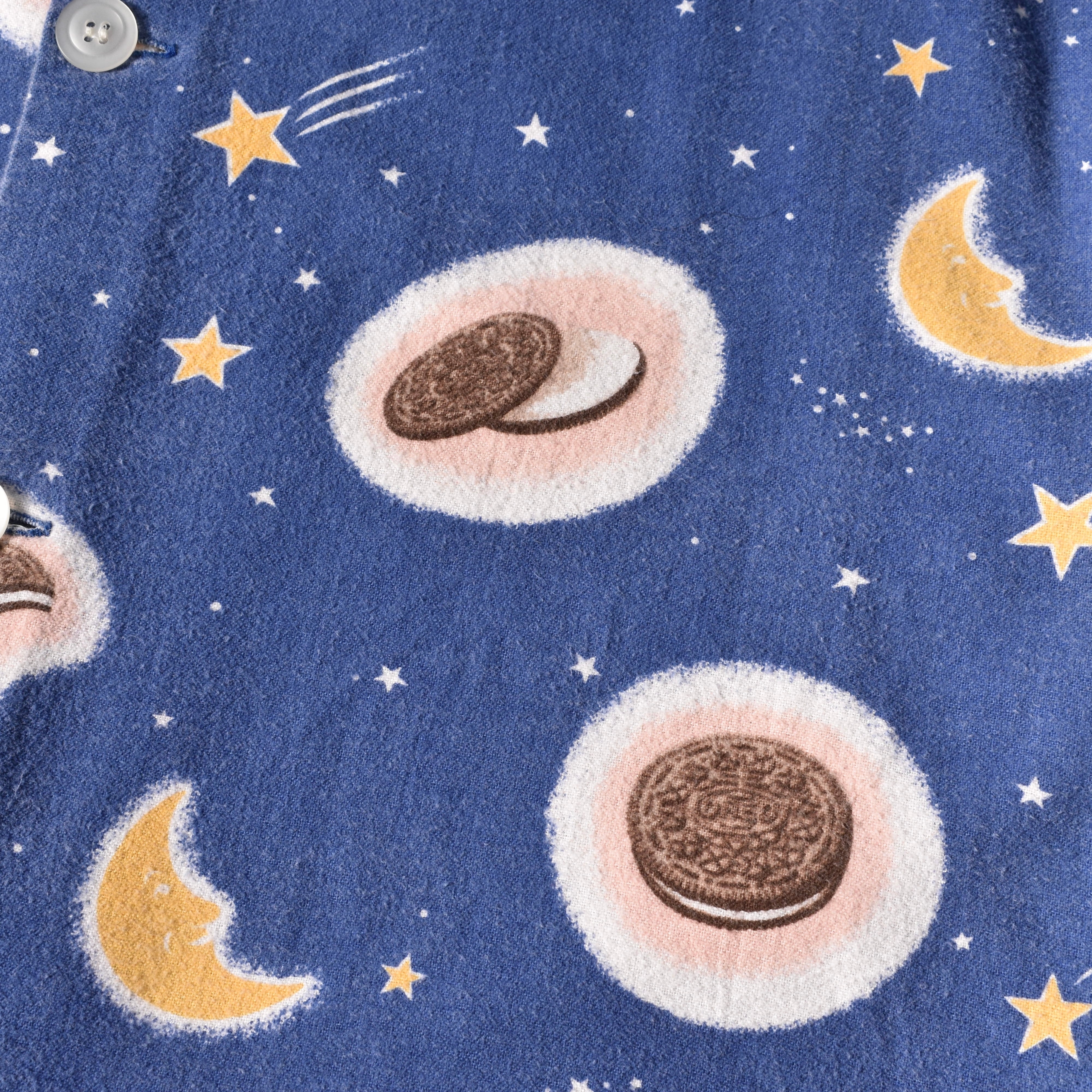 "Nirvana"の"Kurt Cobain"が着用していたことで著名な米国ナイトウェアブランドの"Nick&Nora"より、星空に浮かぶクッキーとミルクが描かれた、キュートでノスタルジックな絵柄が魅力的なパジャマシャツ。