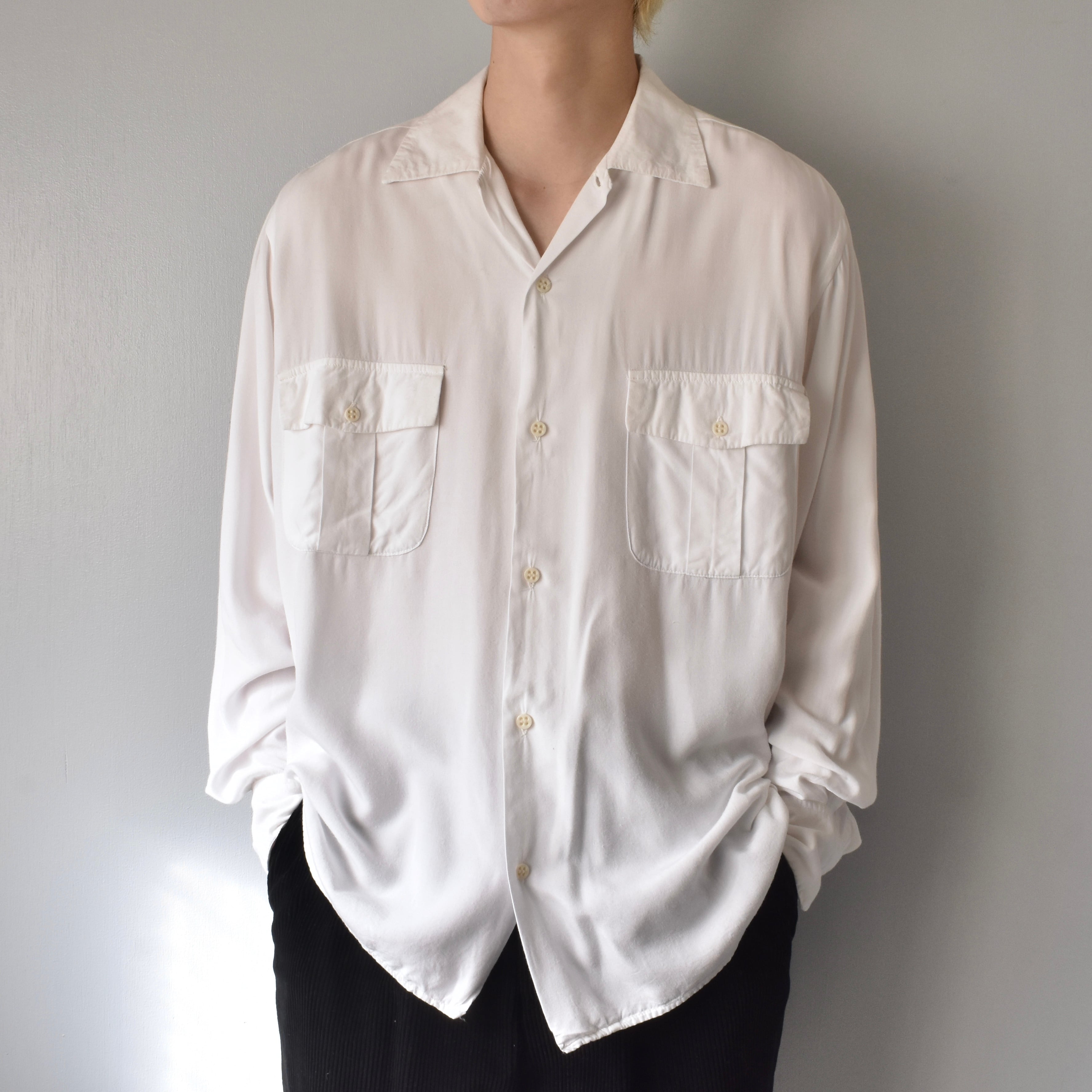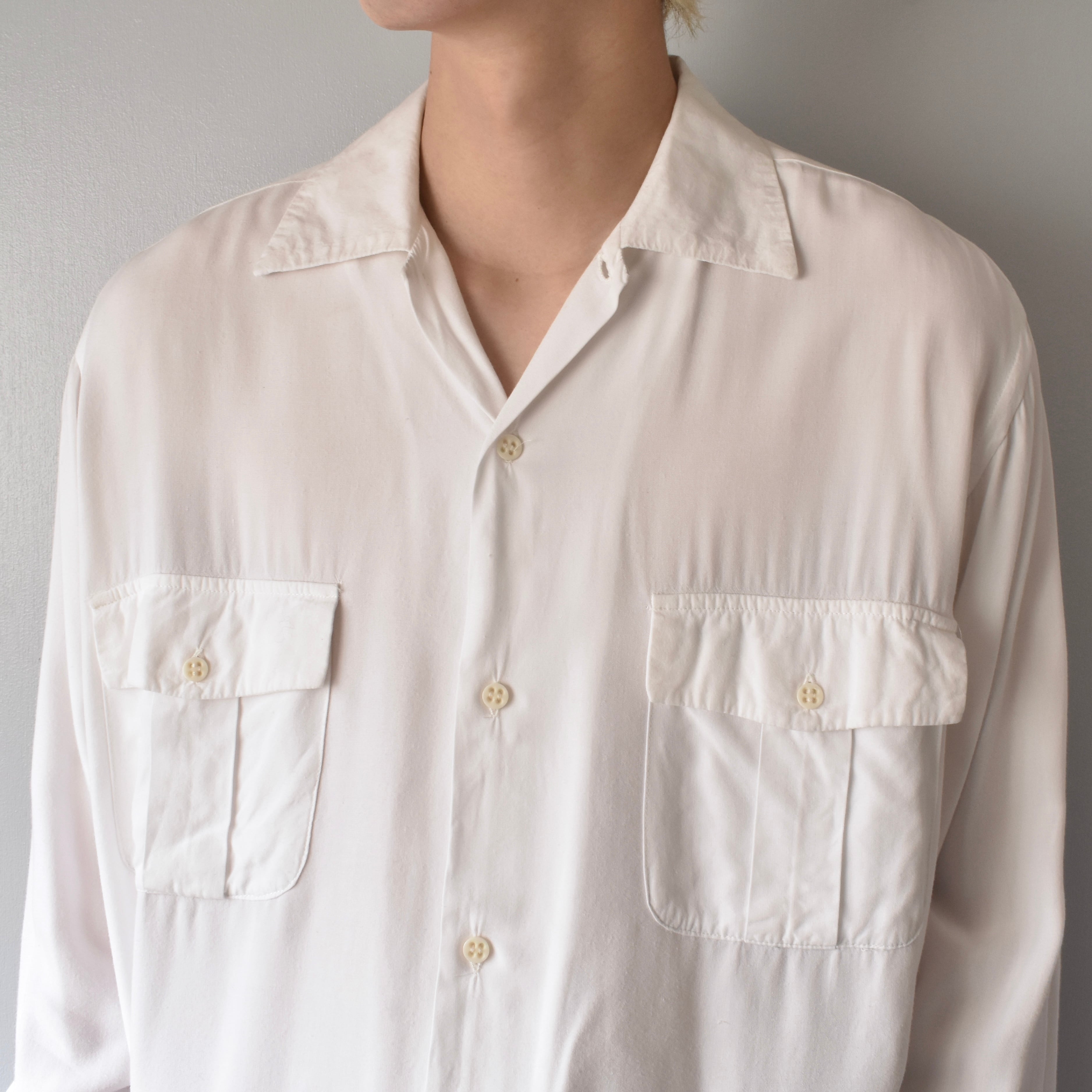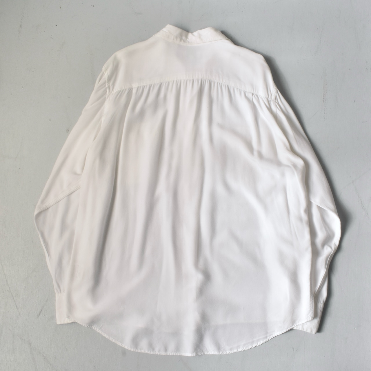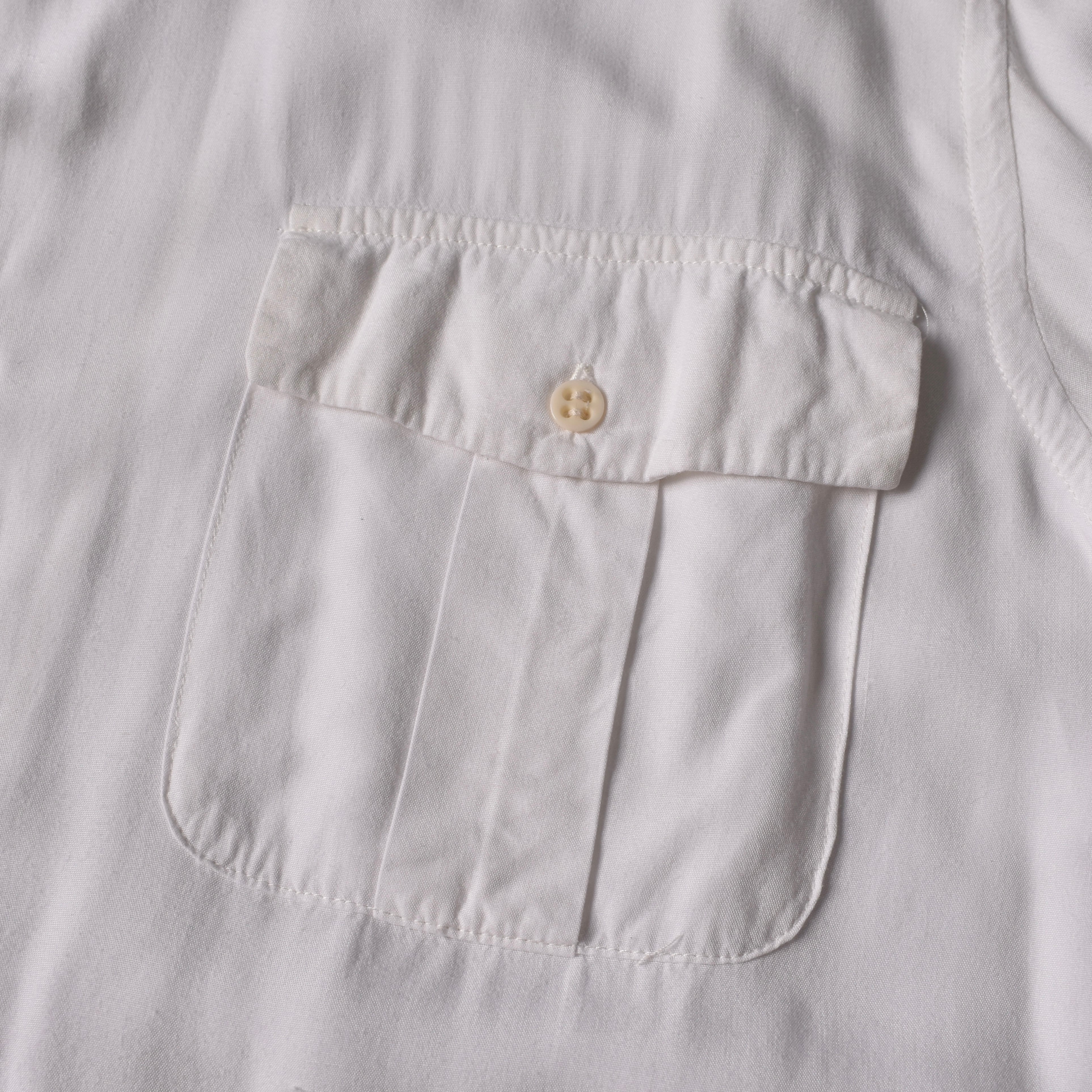 風を受け優しく揺れる純白レーヨン生地が魅力的な一着。両胸にはフラップポケットを備えるヴィンテージライクなデザインで、レーヨン100%の白シャツは年代問わず、洋服好きが揃えておきたいアイテムの一つかと。是非。