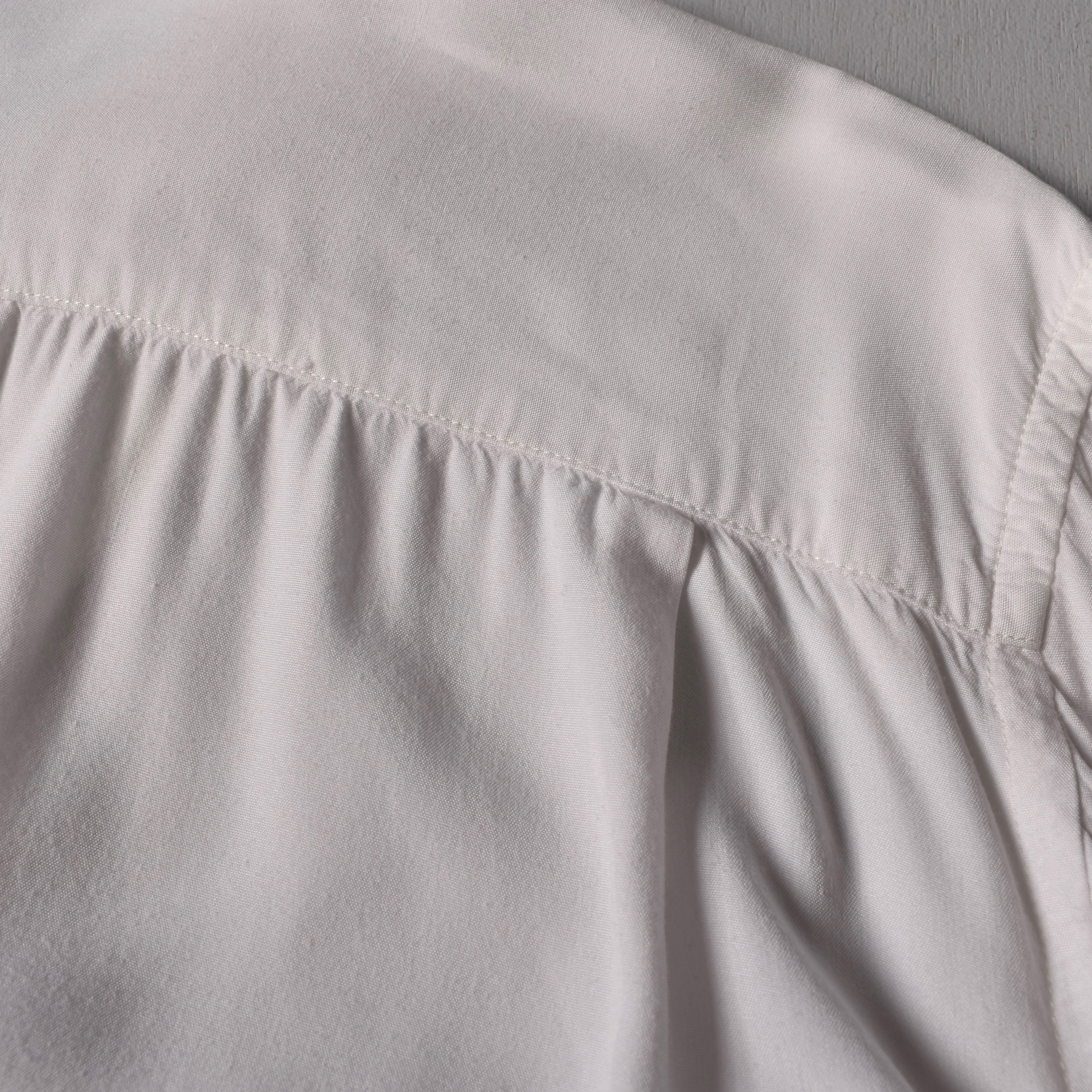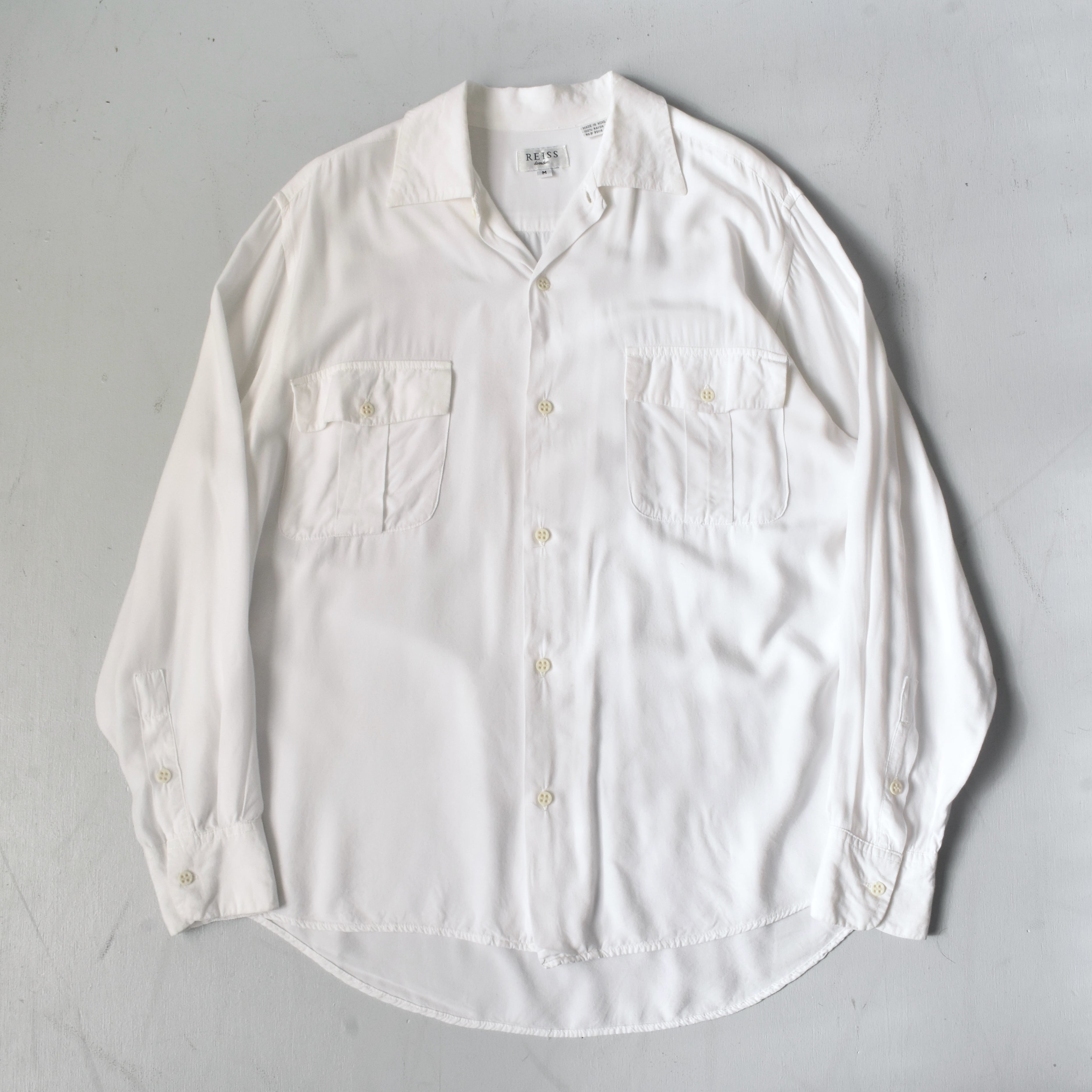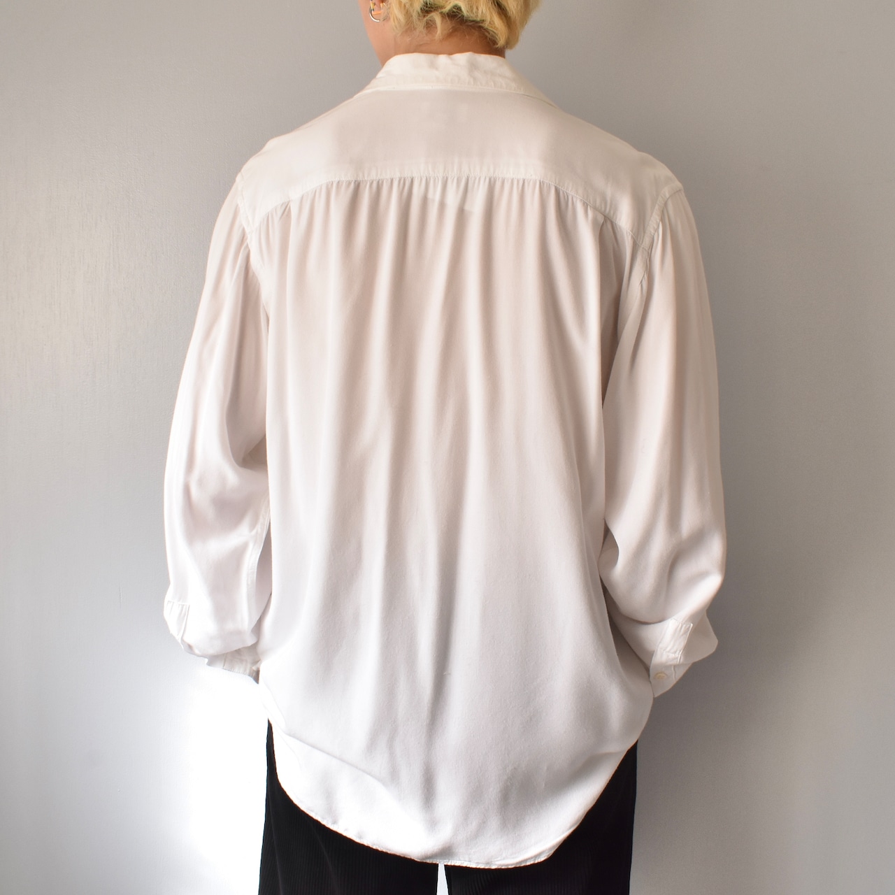 風を受け優しく揺れる純白レーヨン生地が魅力的な一着。両胸にはフラップポケットを備えるヴィンテージライクなデザインで、レーヨン100%の白シャツは年代問わず、洋服好きが揃えておきたいアイテムの一つかと。是非。