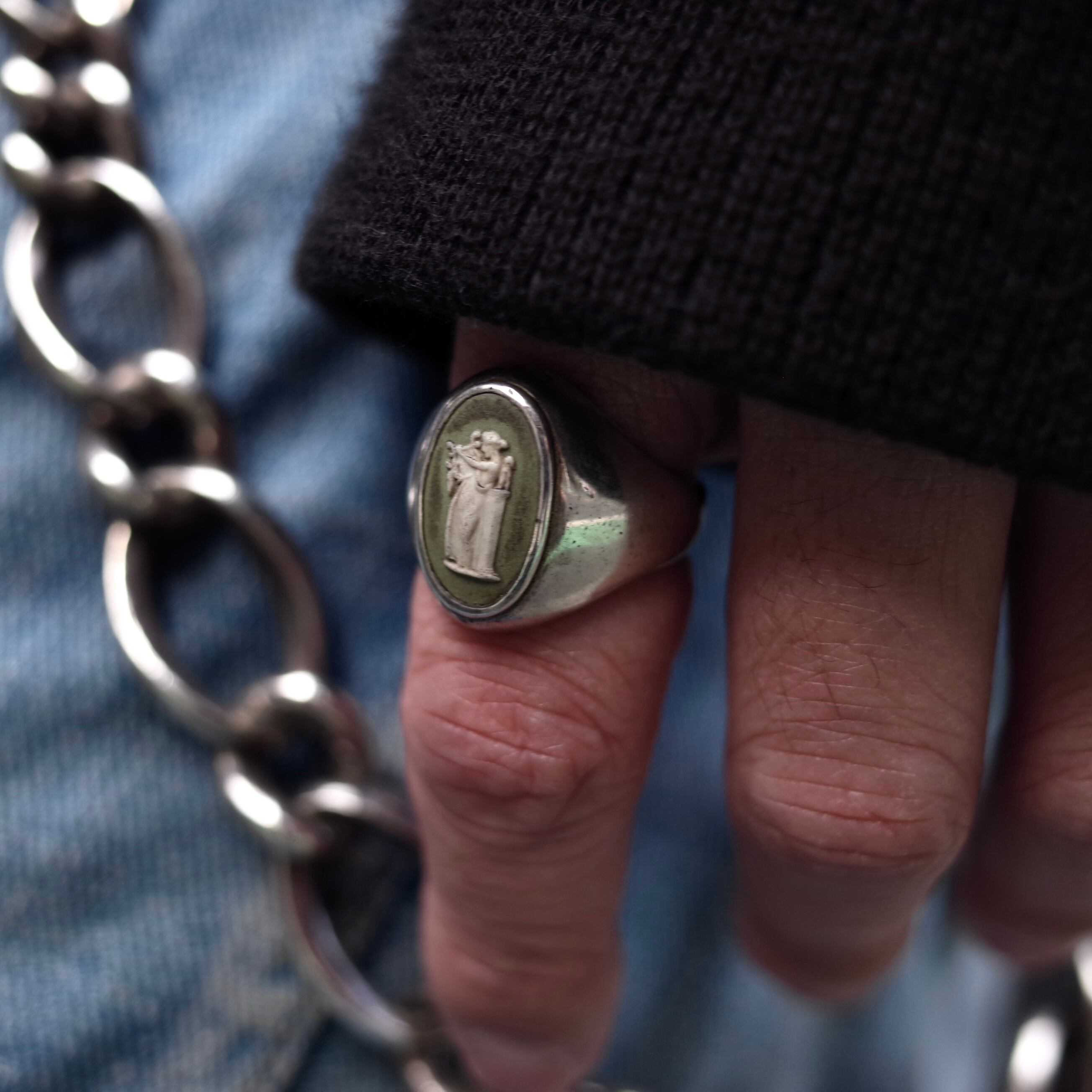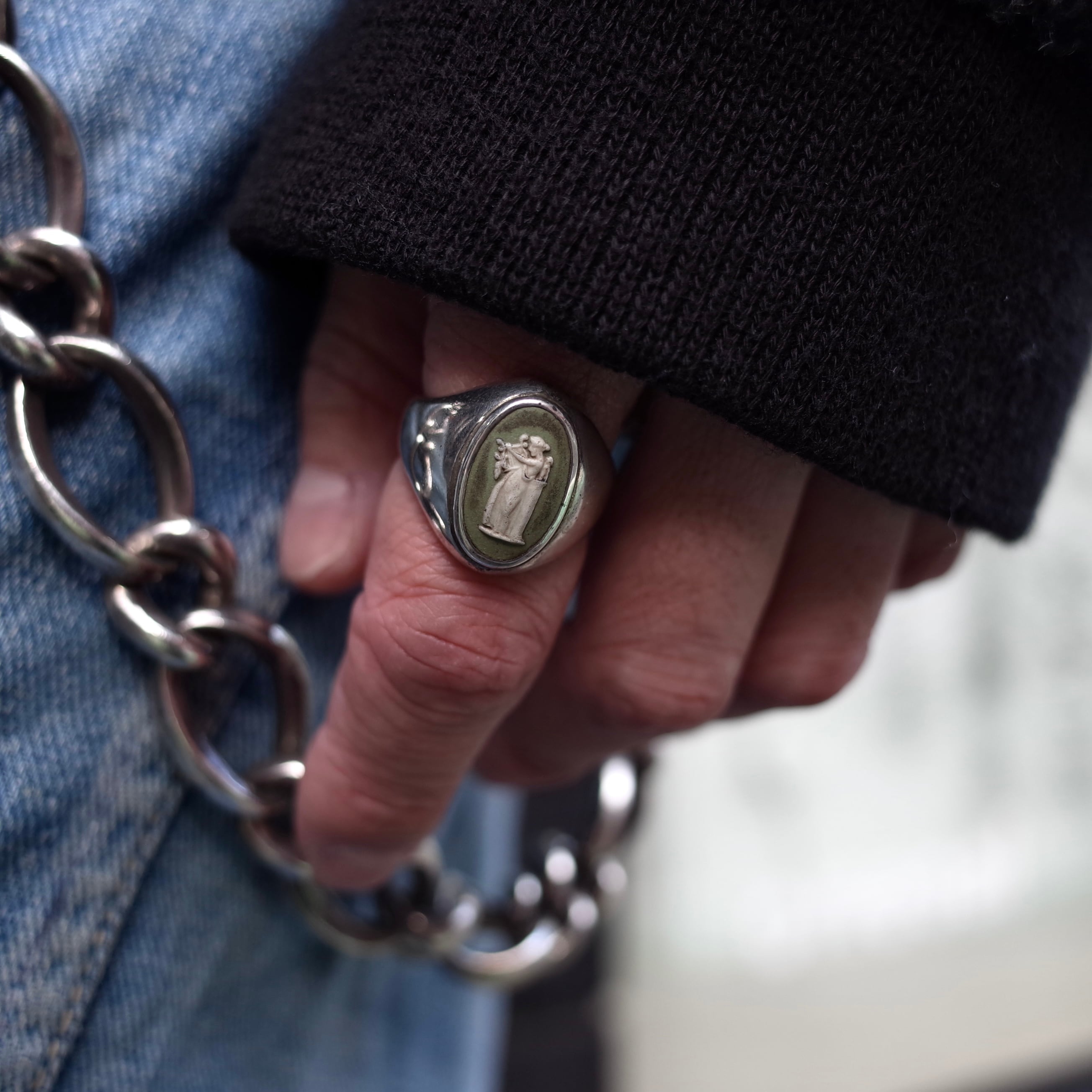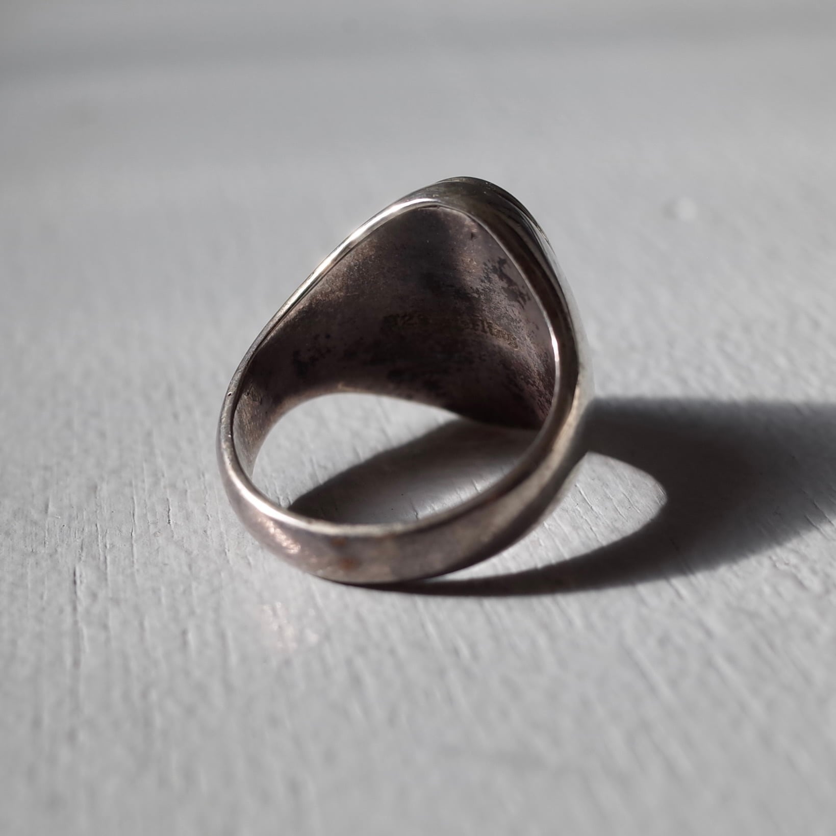 カメオがトップにはめ込まれた上品なリング。経年変化で