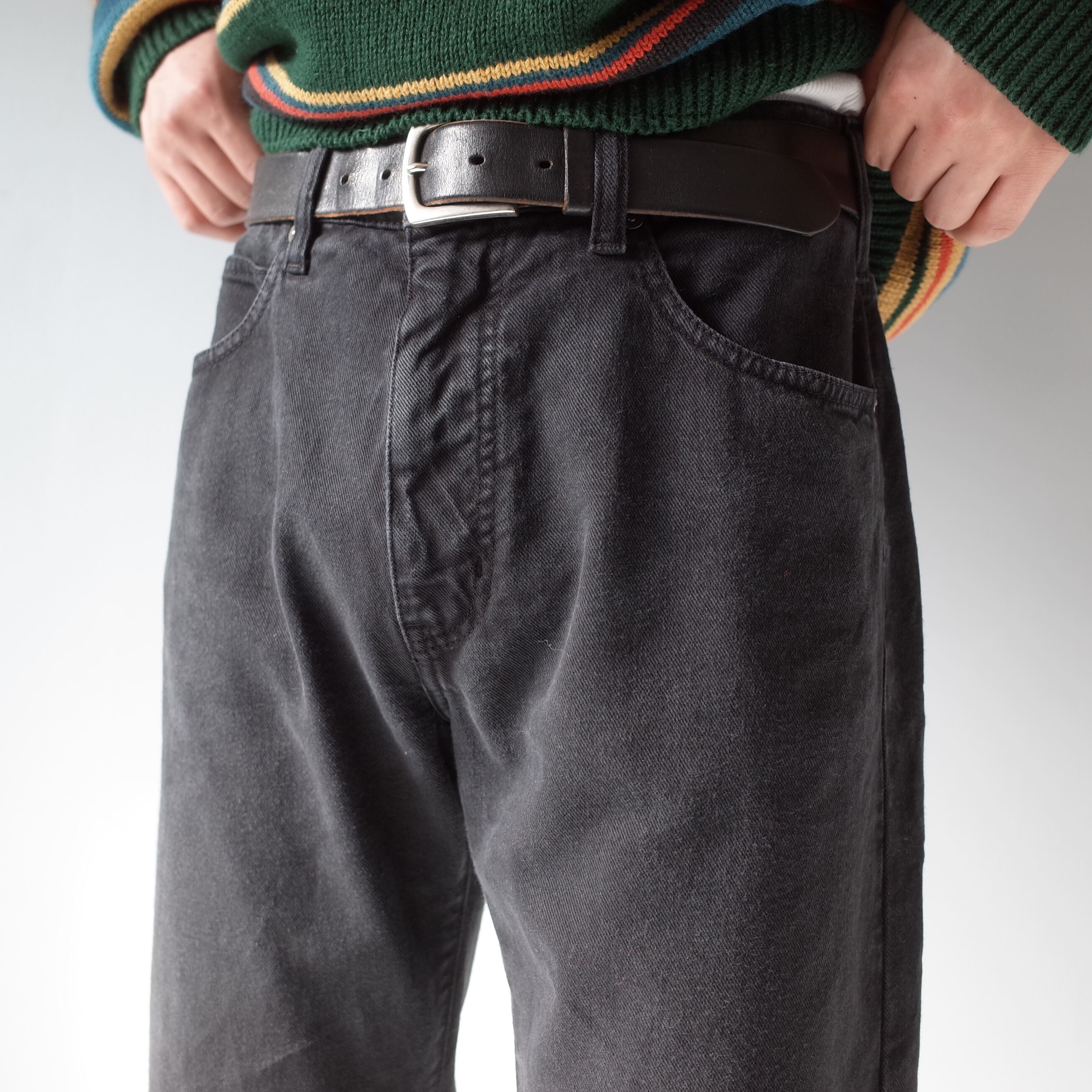 シルエットは太過ぎないストレートでアウトラインはややカーブを描きながら足元までストンと伸びています。昨今オーバーサイズのトレンドが落ち着き、反動として細めなデニムパンツをリリースするハイブランドが増えており、トレンドとも上手く合致する一本です。