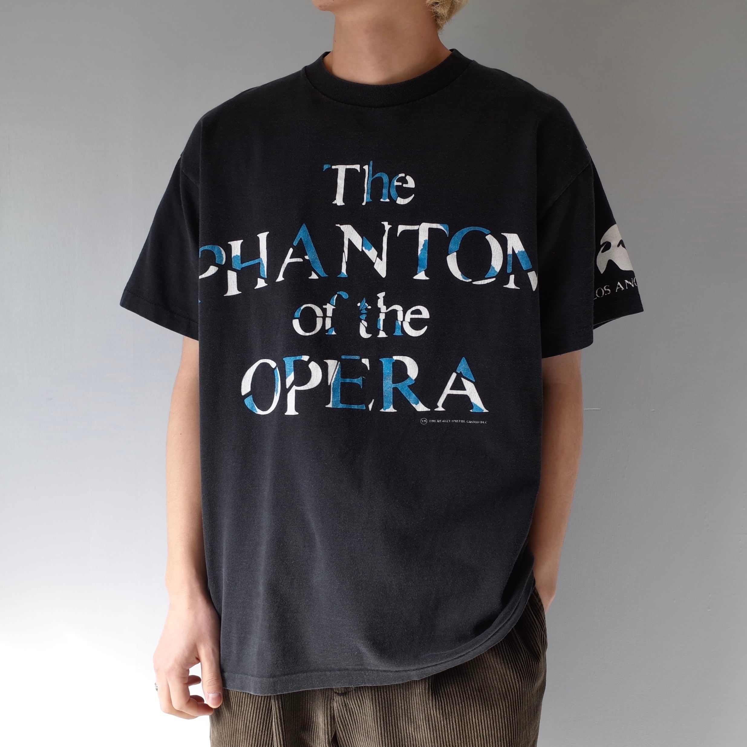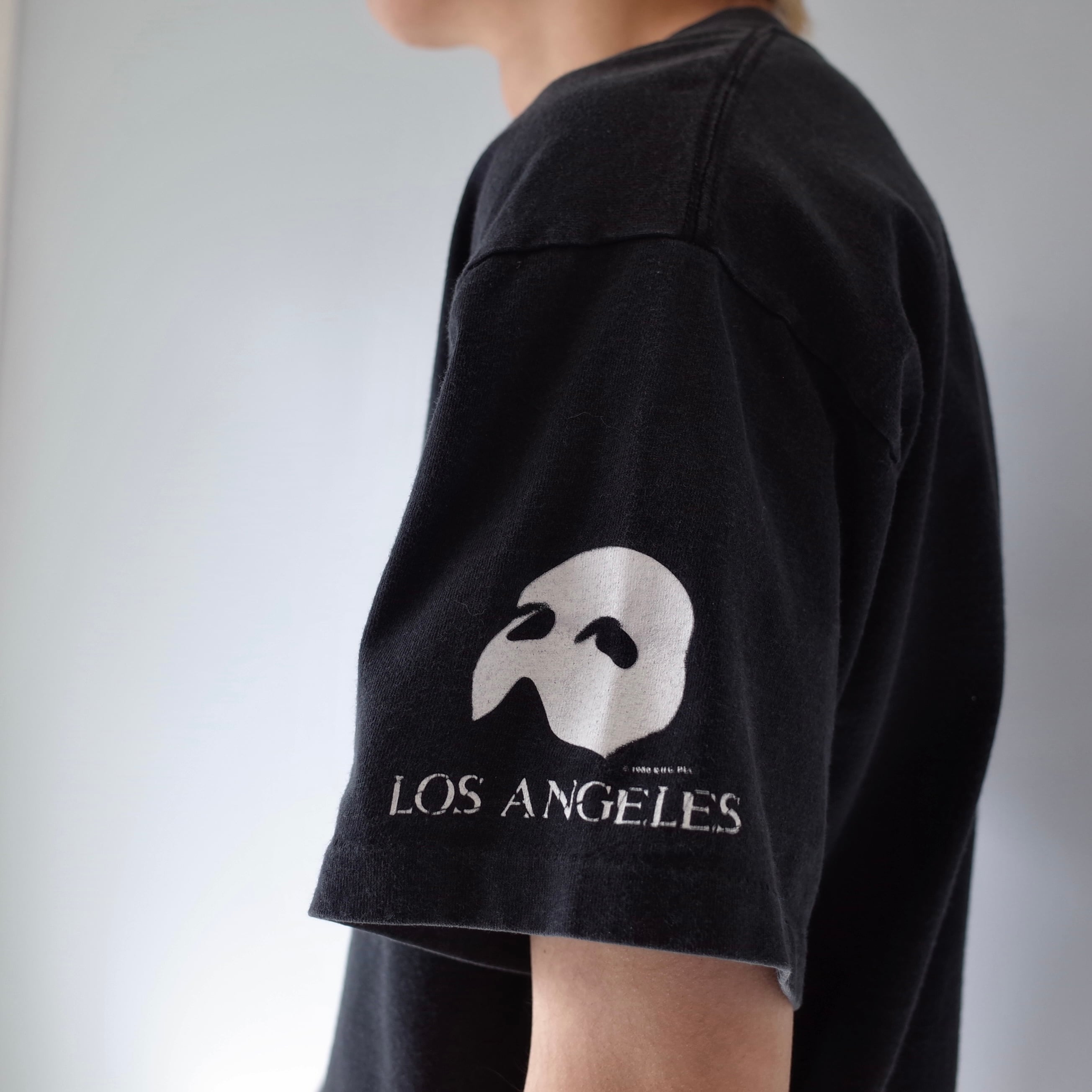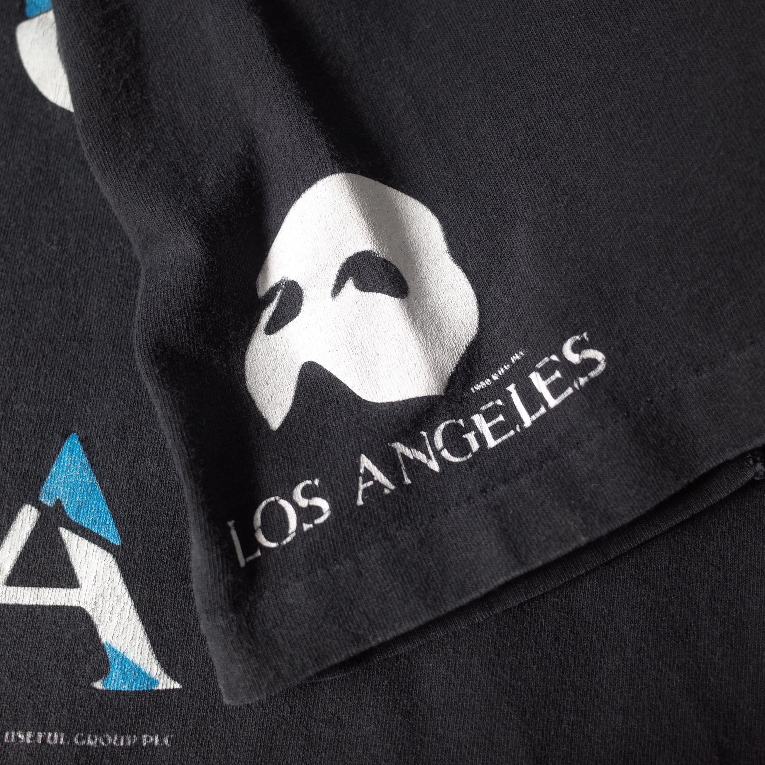 19世紀後半のパリ・オペラ座を舞台としたミュージカル『オペラ座の怪人』のTシャツを御紹介。フロントに大きくデザインされた作品タイトルが印象的で、袖プリントからロサンゼルスで行われた講演の際の1枚だと推測できます。