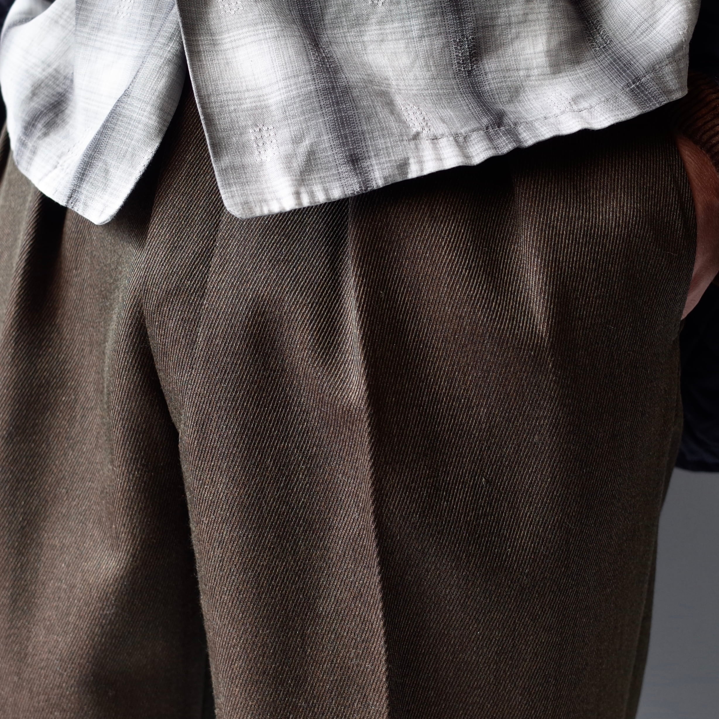 グリーンがかった特徴的な生地使いとワイドな形が魅力の