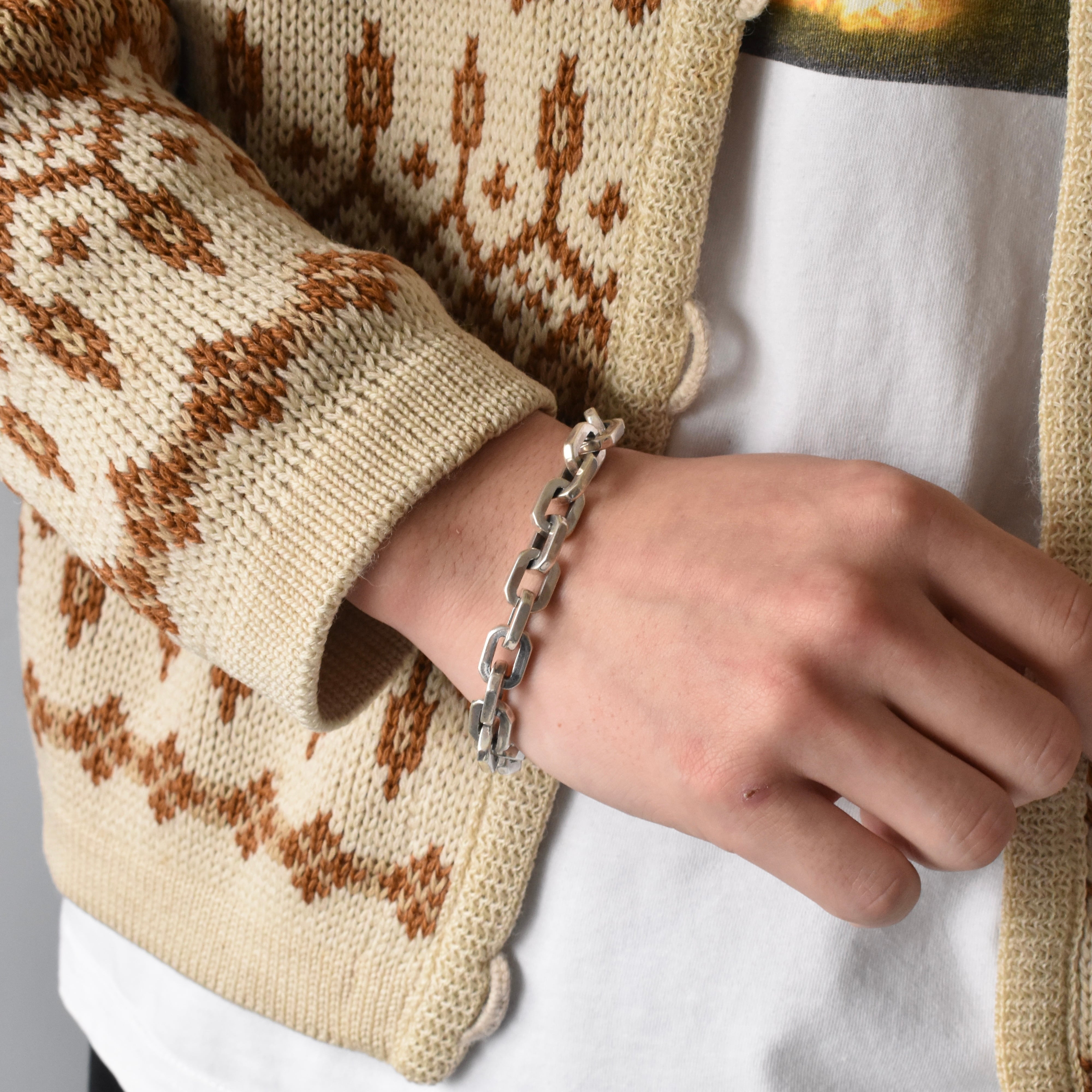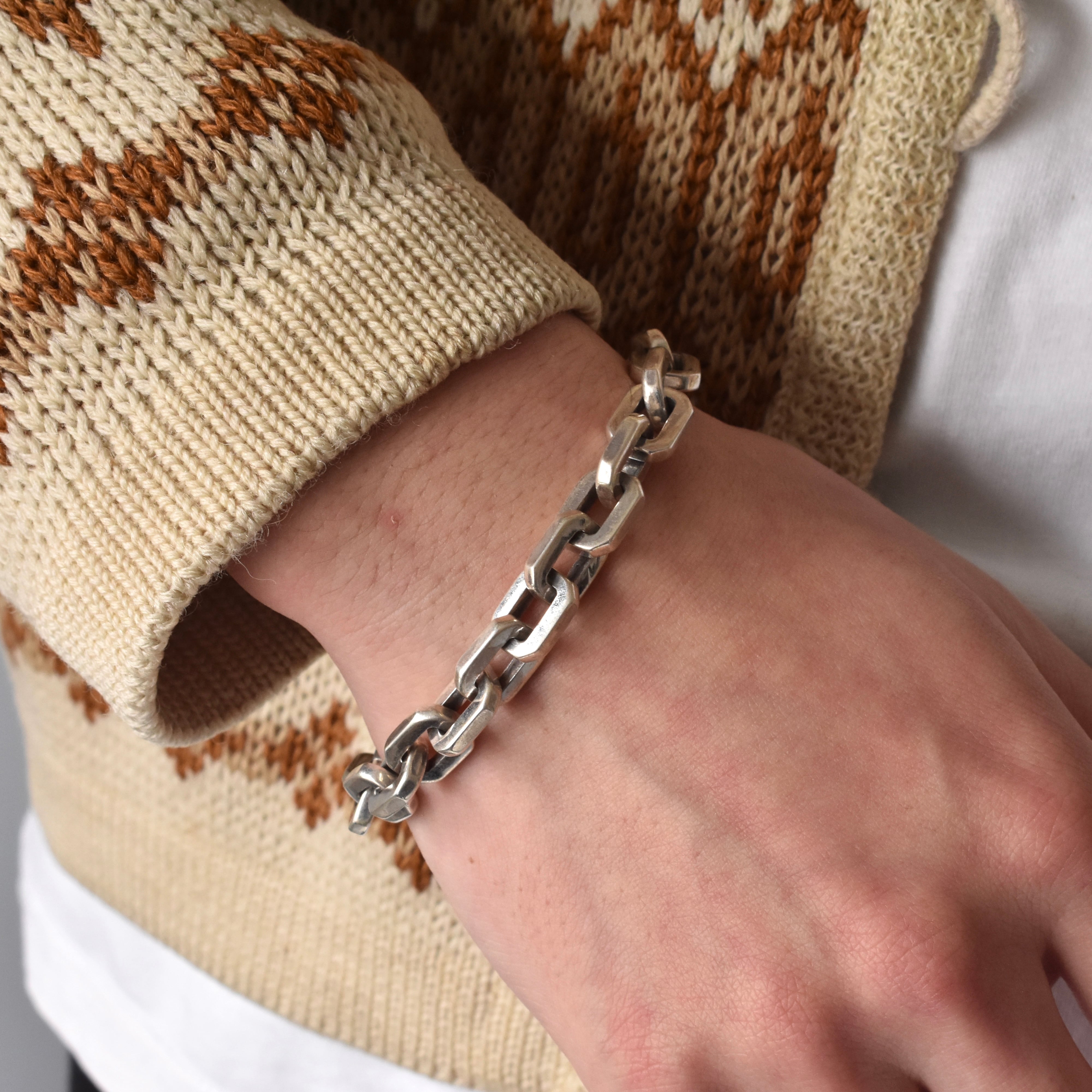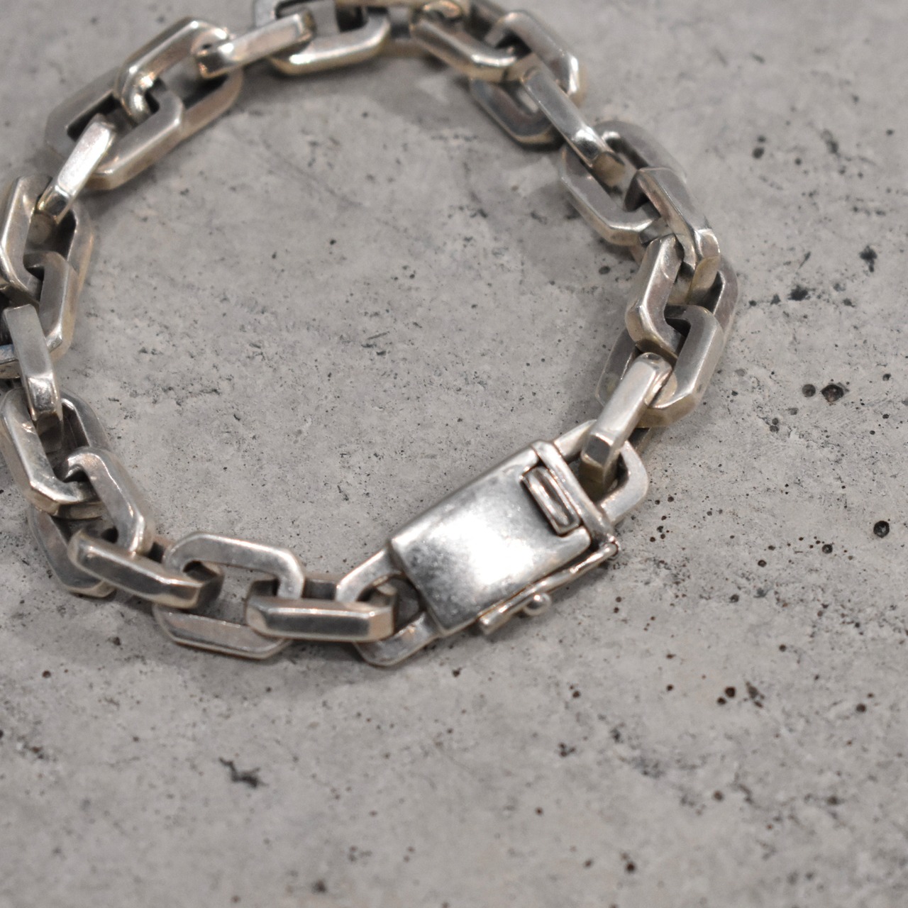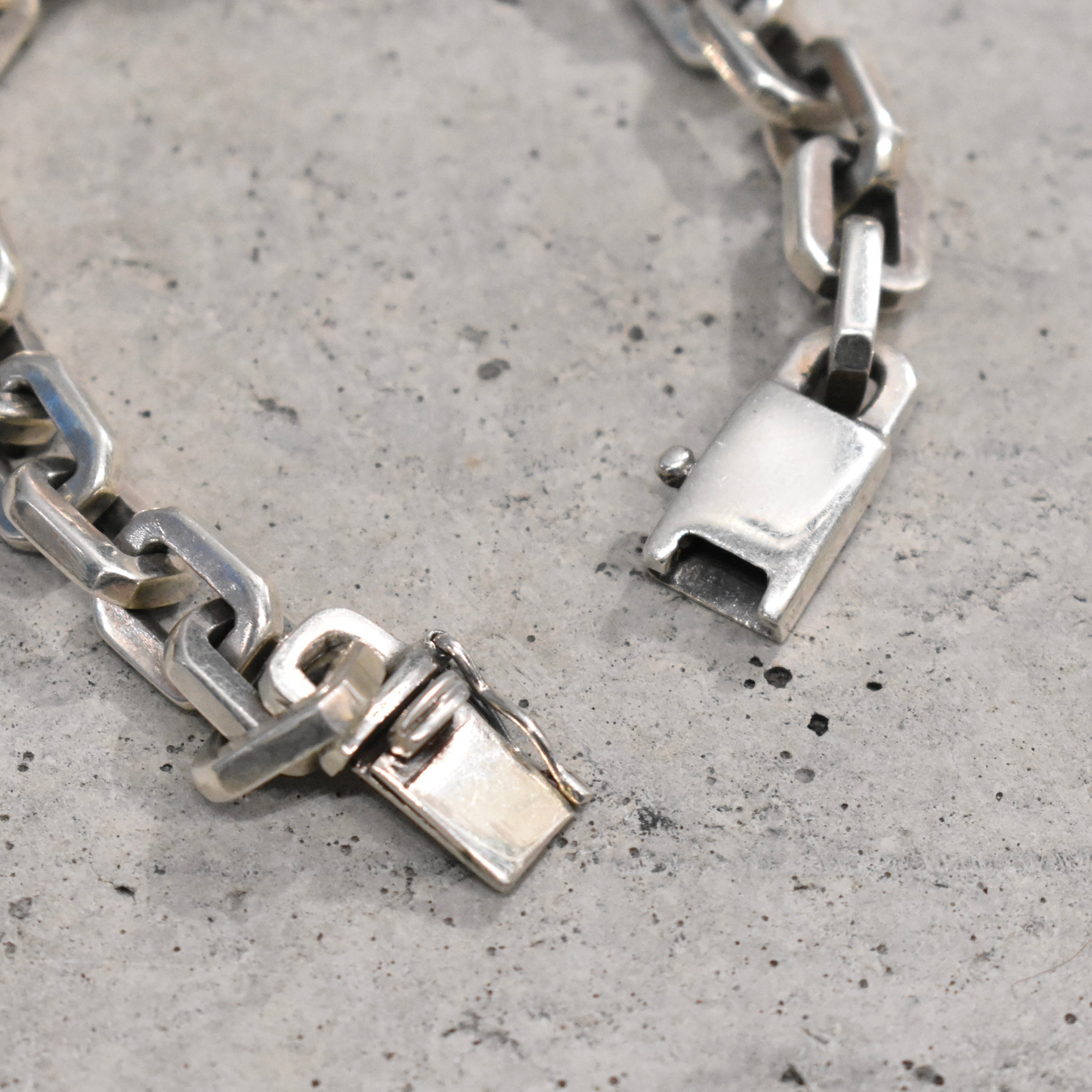 一際存在感を放つゴツゴツしたハードウェアジュエリー。エンドパーツをはじめ、細部にわたり各所に拘り詰まった重量ある“SILVER925”チェーンブレスレット。