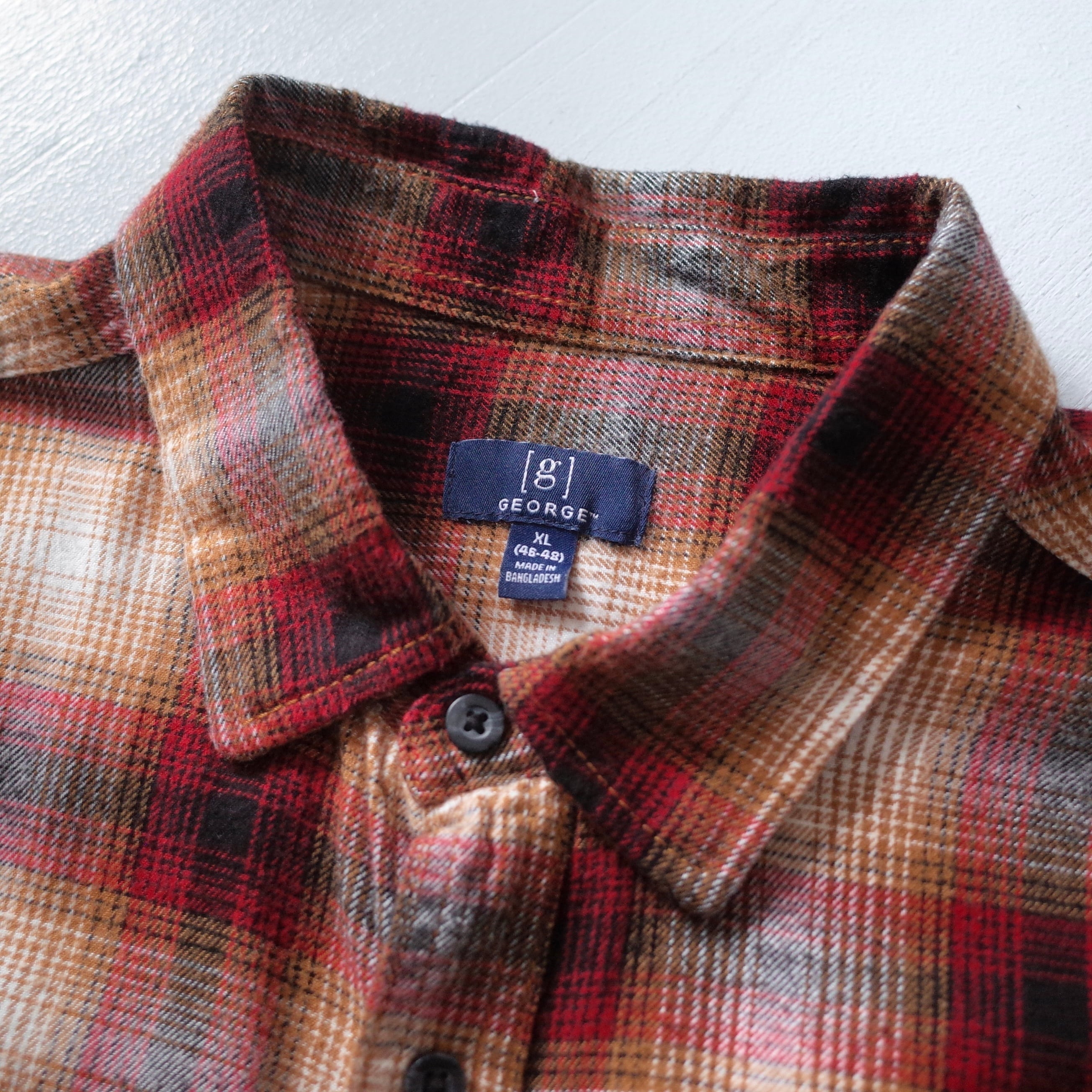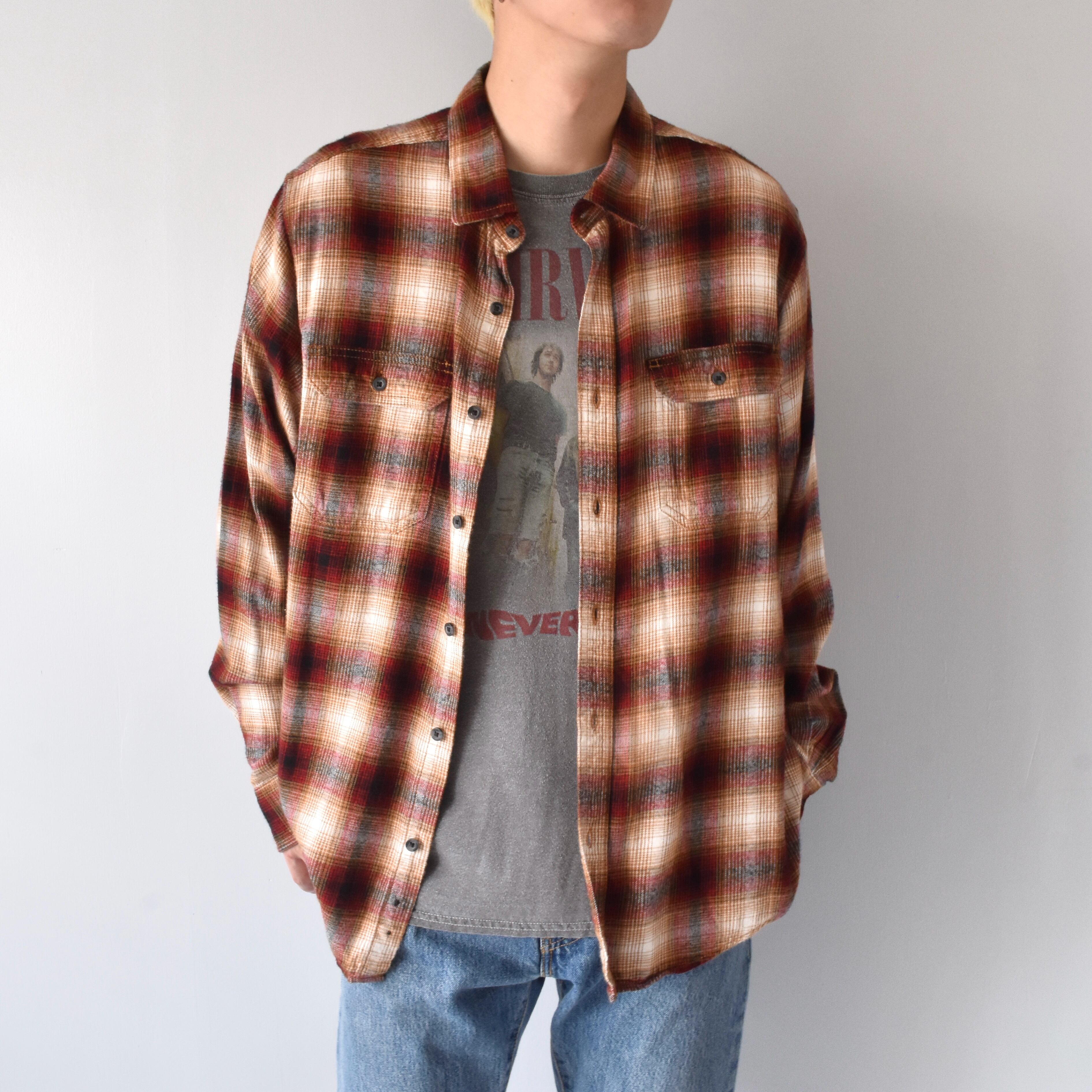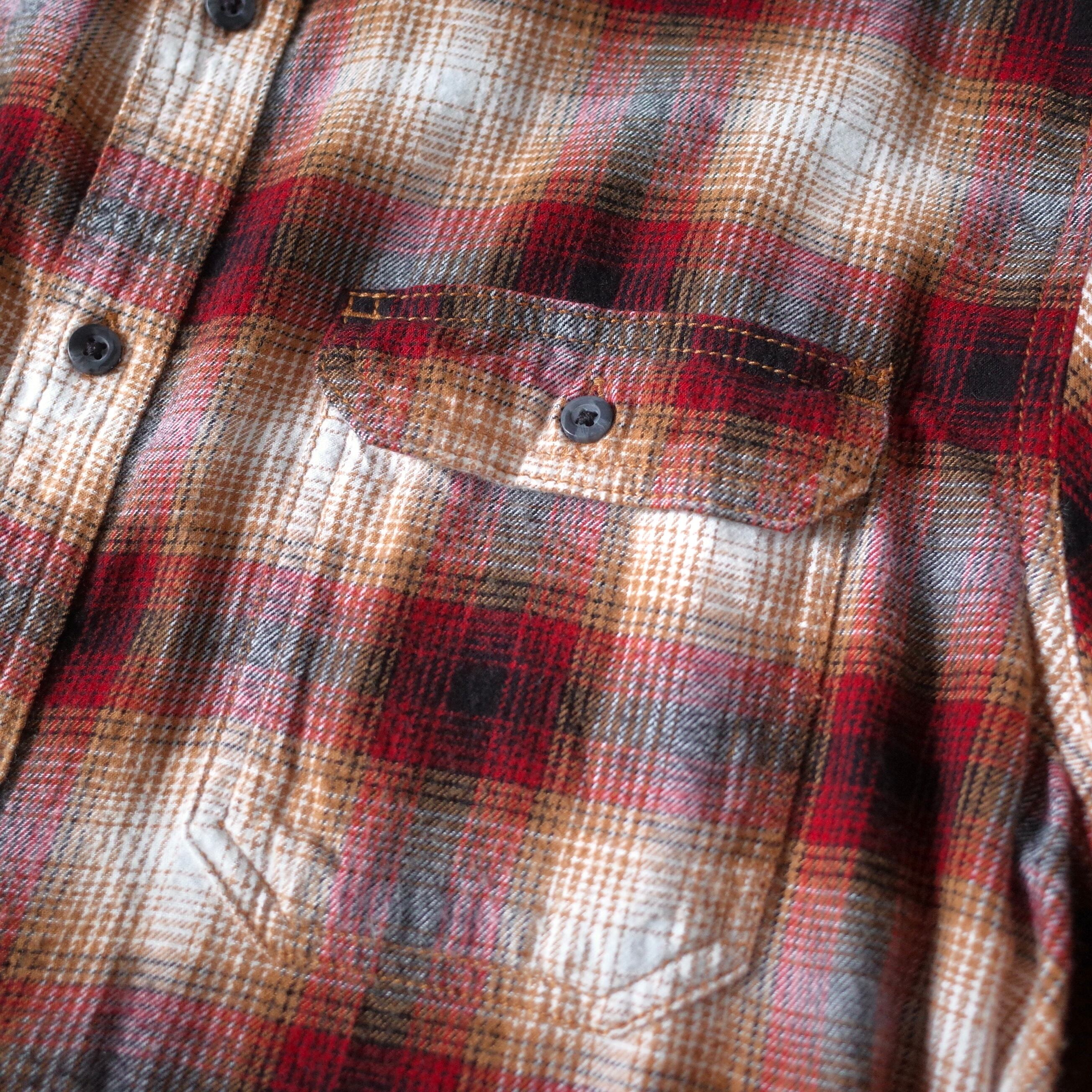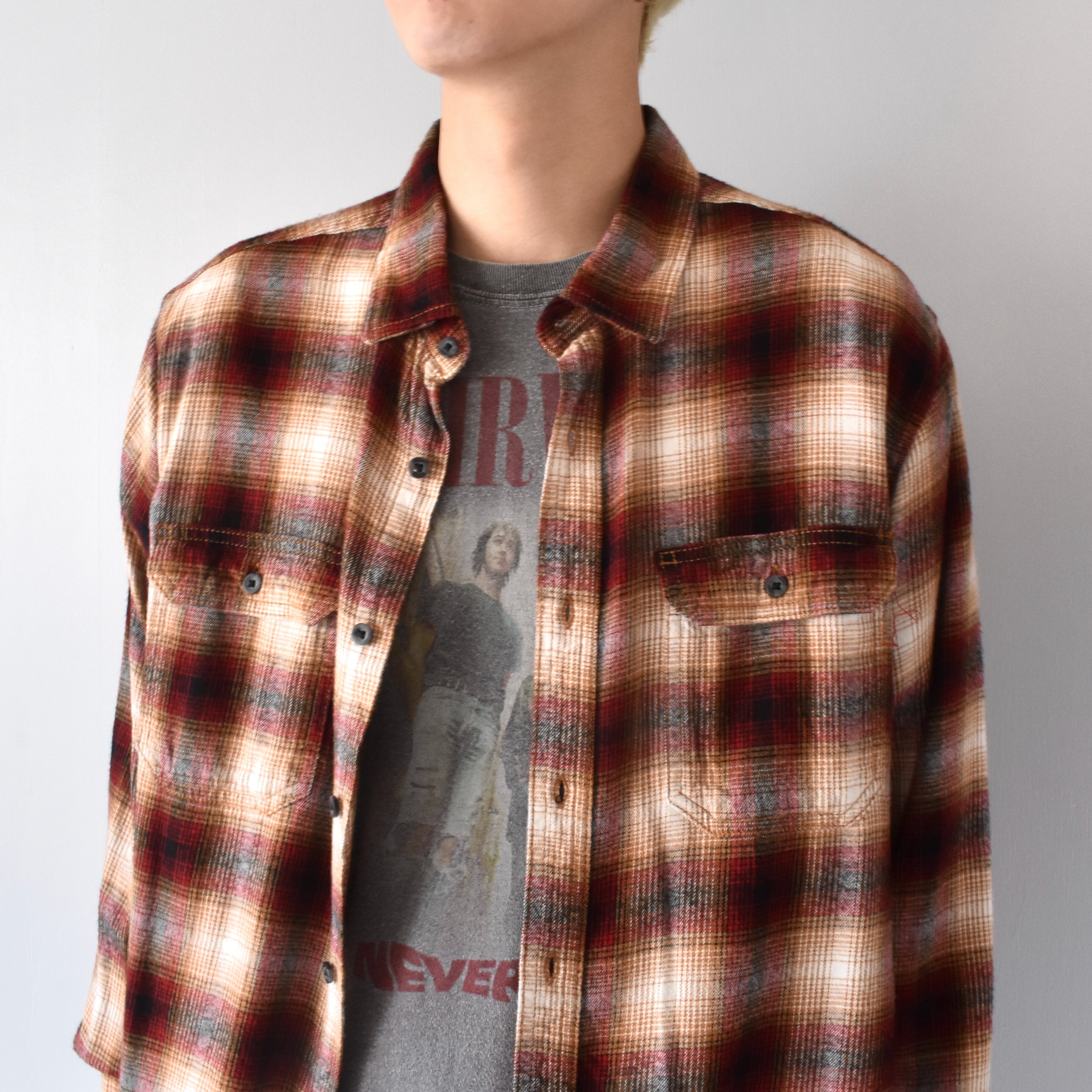 フラップポケットデザインのオンブレチェック柄シャツ。