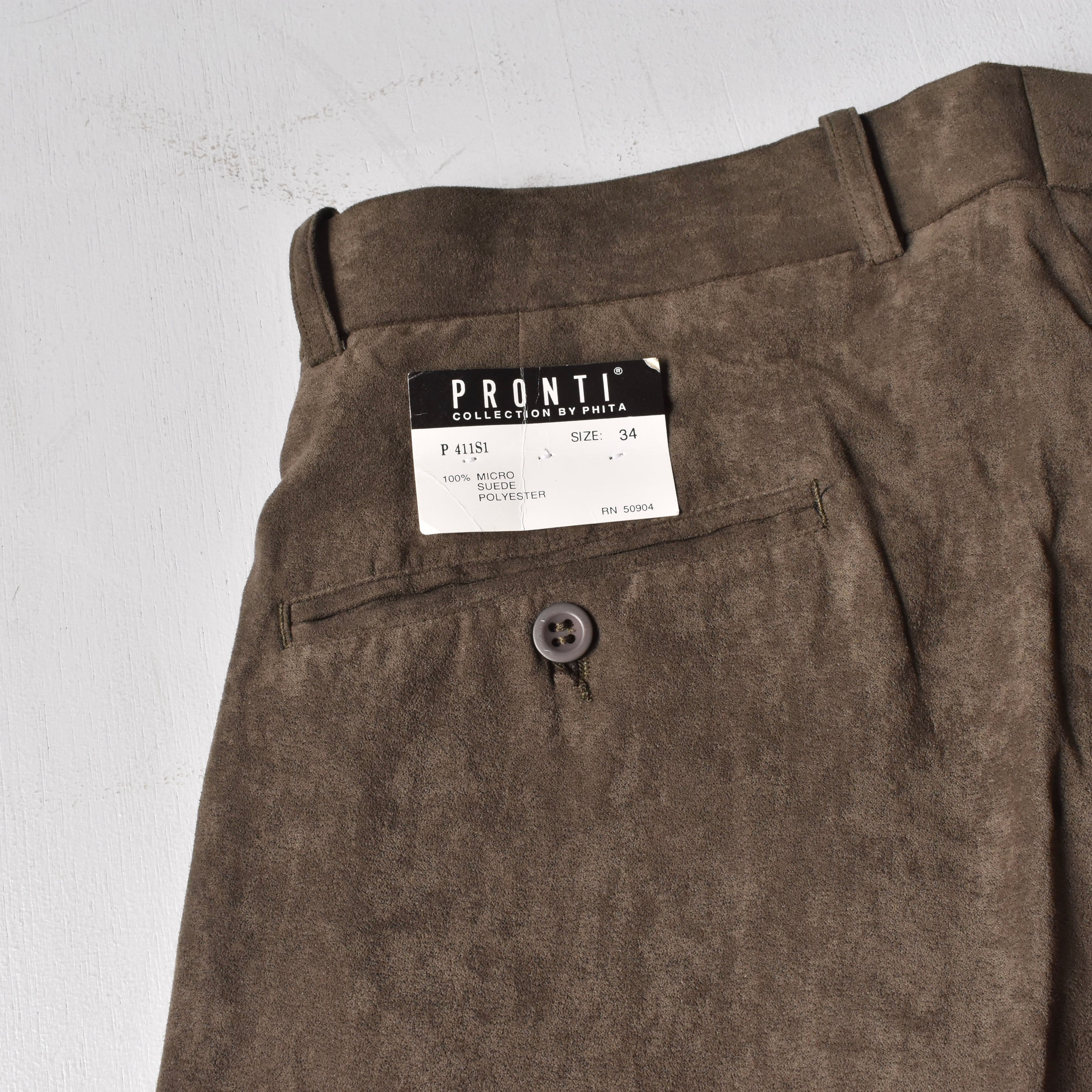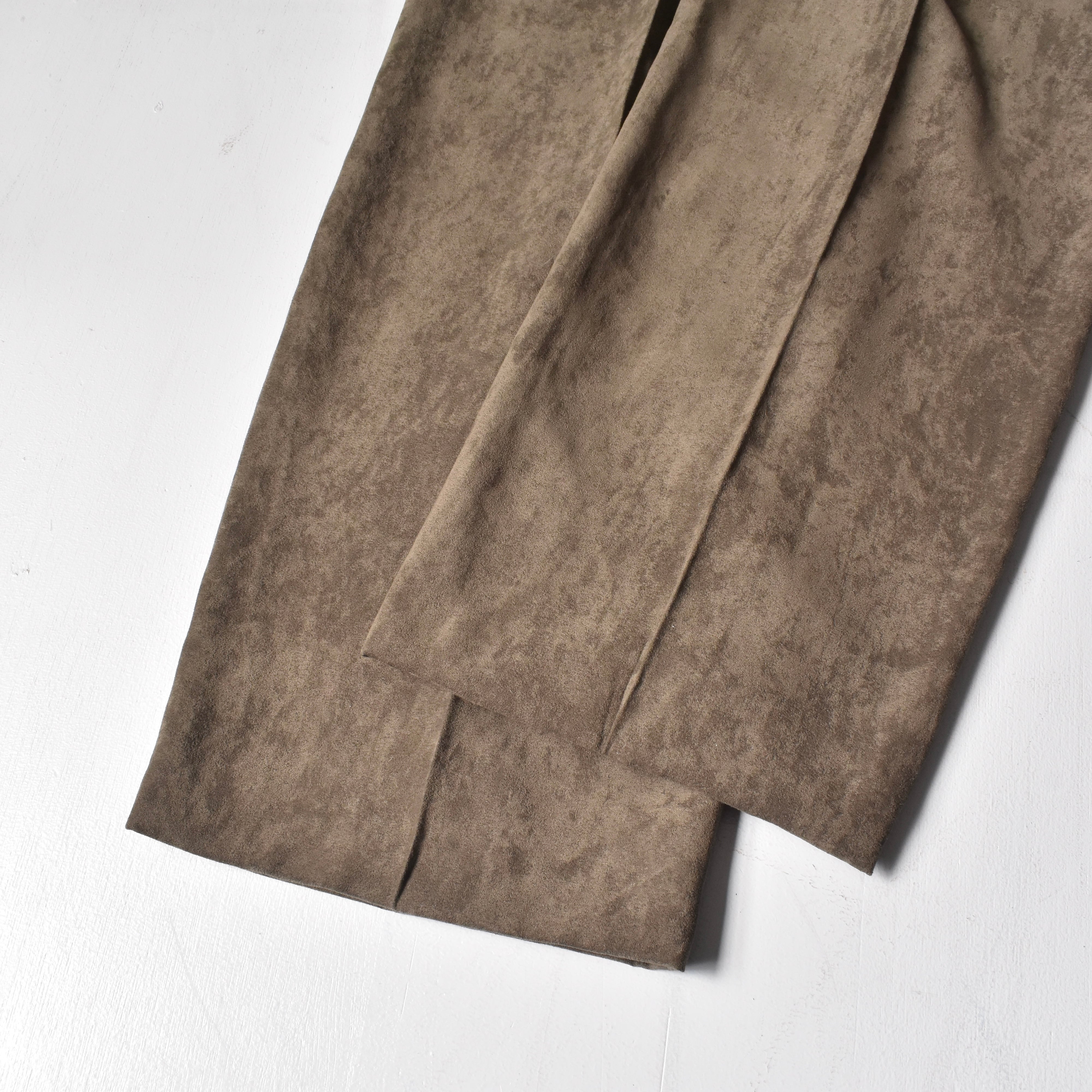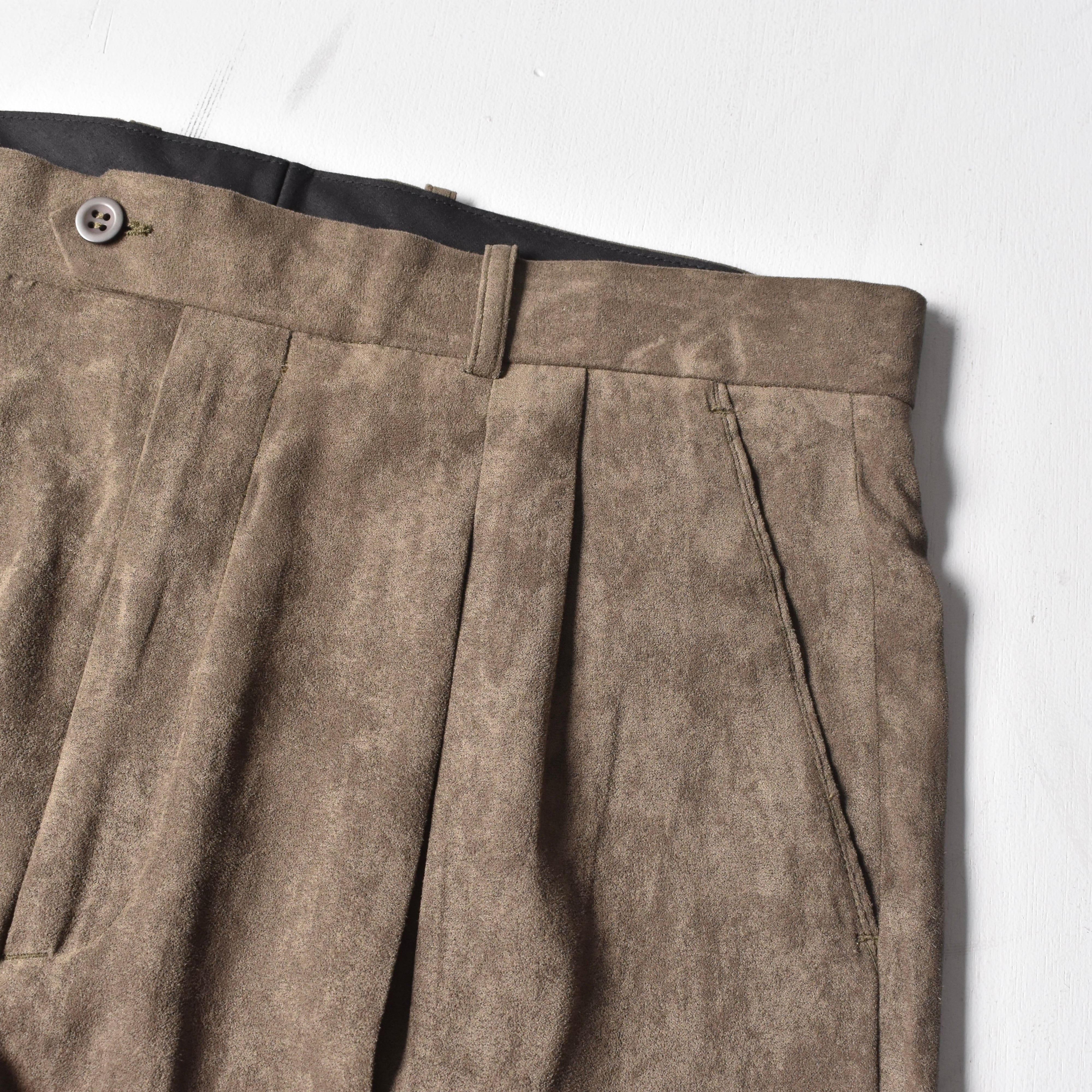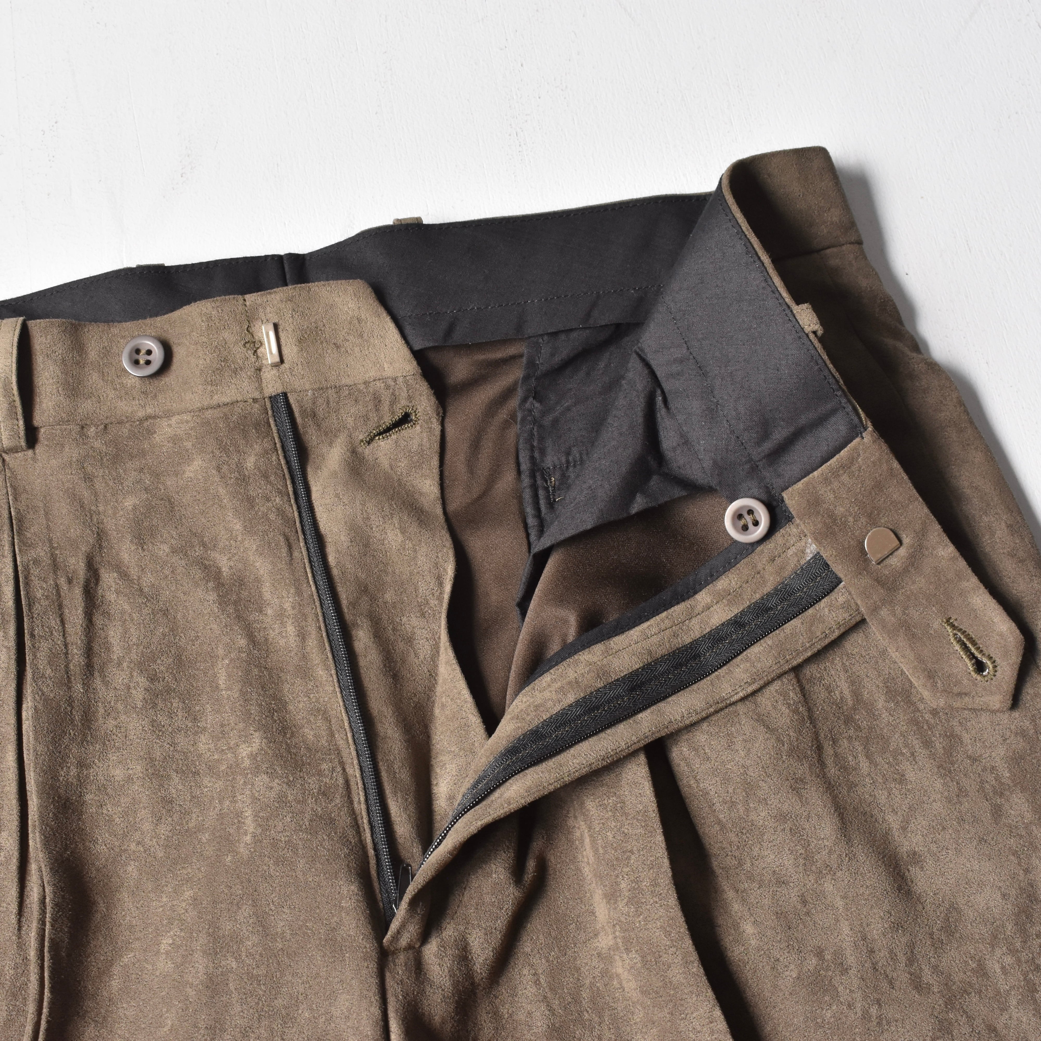 デッドストックで見つかった"PRONTI"ピーチスキン生地トラウザーズ。微起毛した柔らかい質感と滑らかさのある穿き心地はたまりません。
