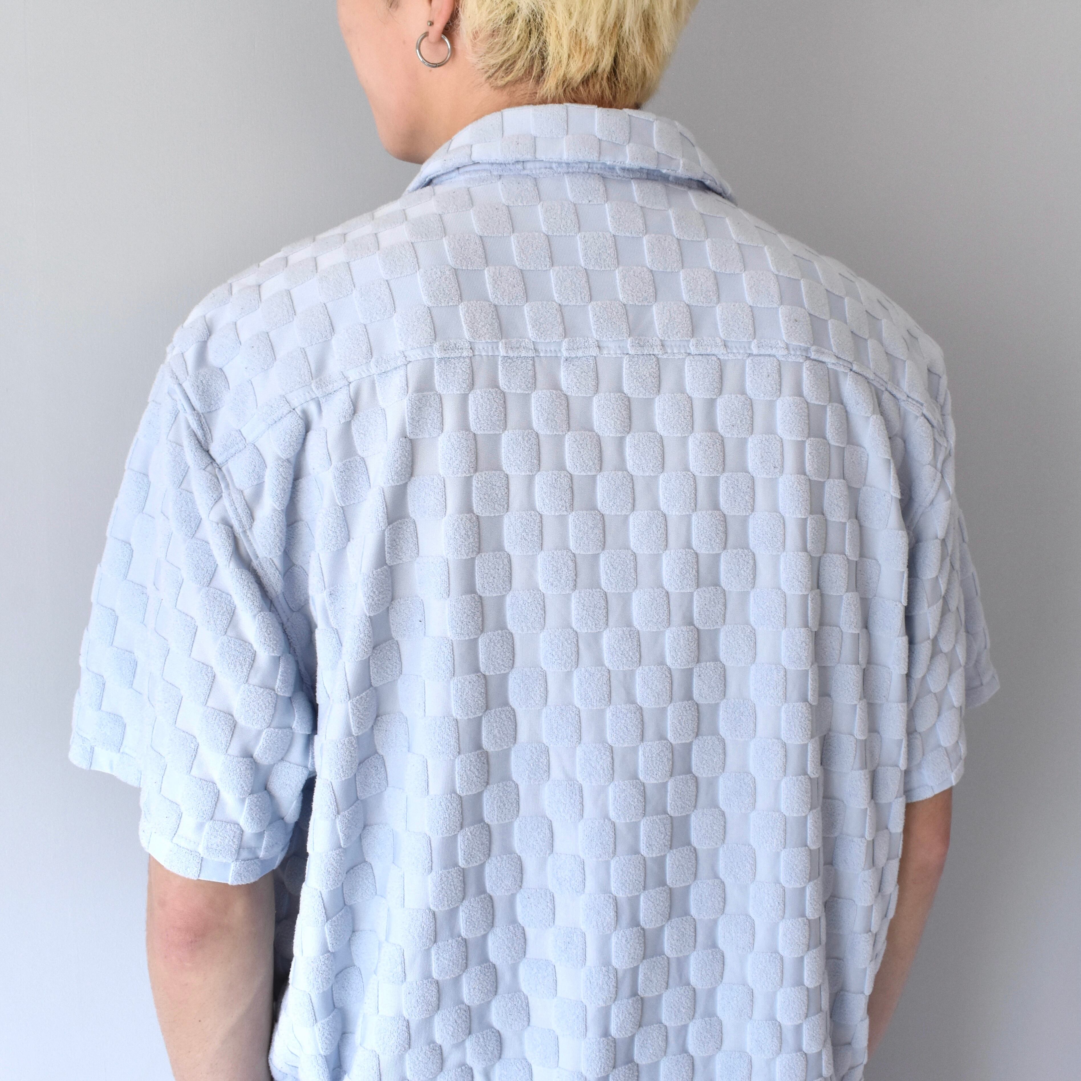市松模様柄が甘い色合でデザインされている半袖シャツ。