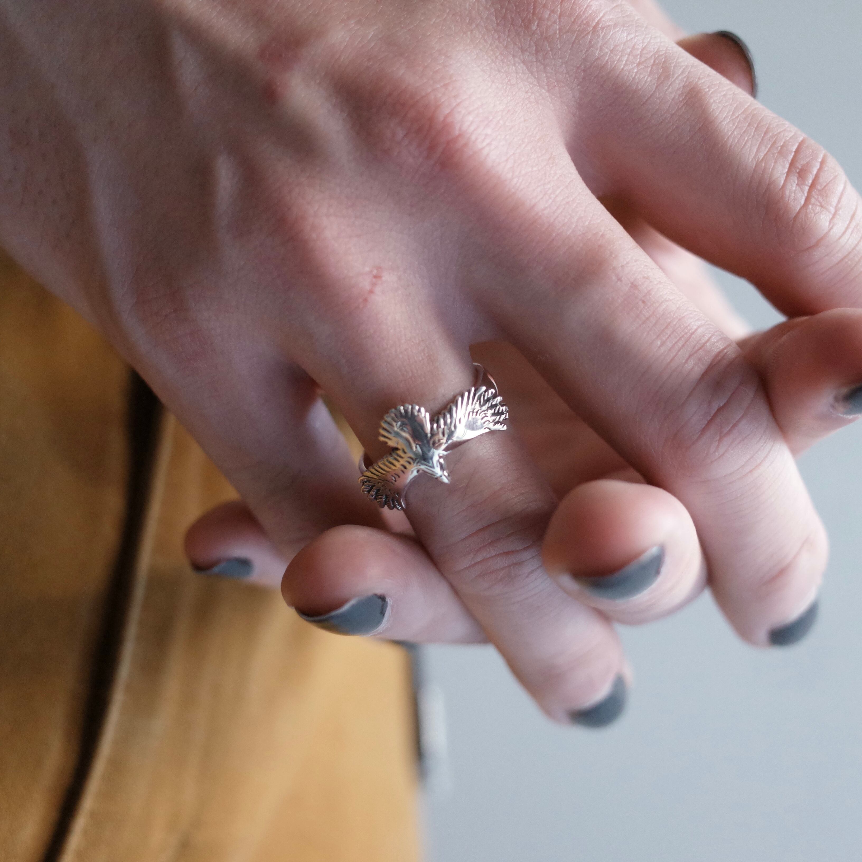 “SILVER925”モチーフリング。羽・嘴の細部にわたり、